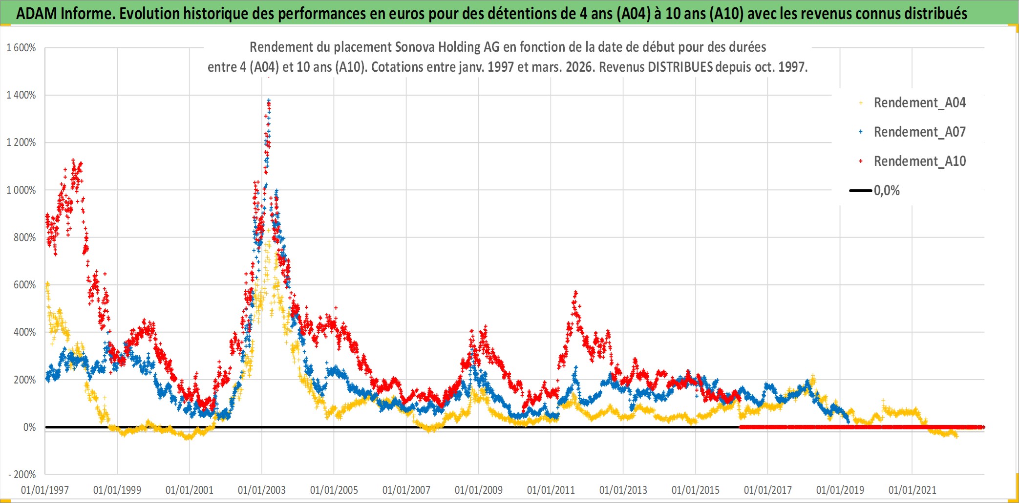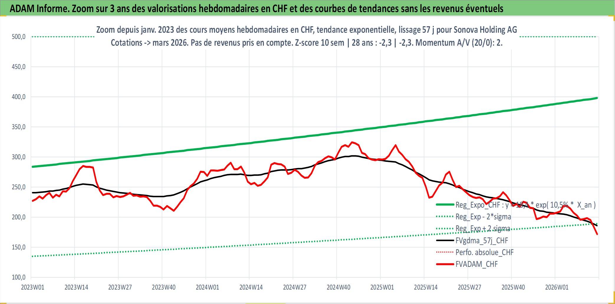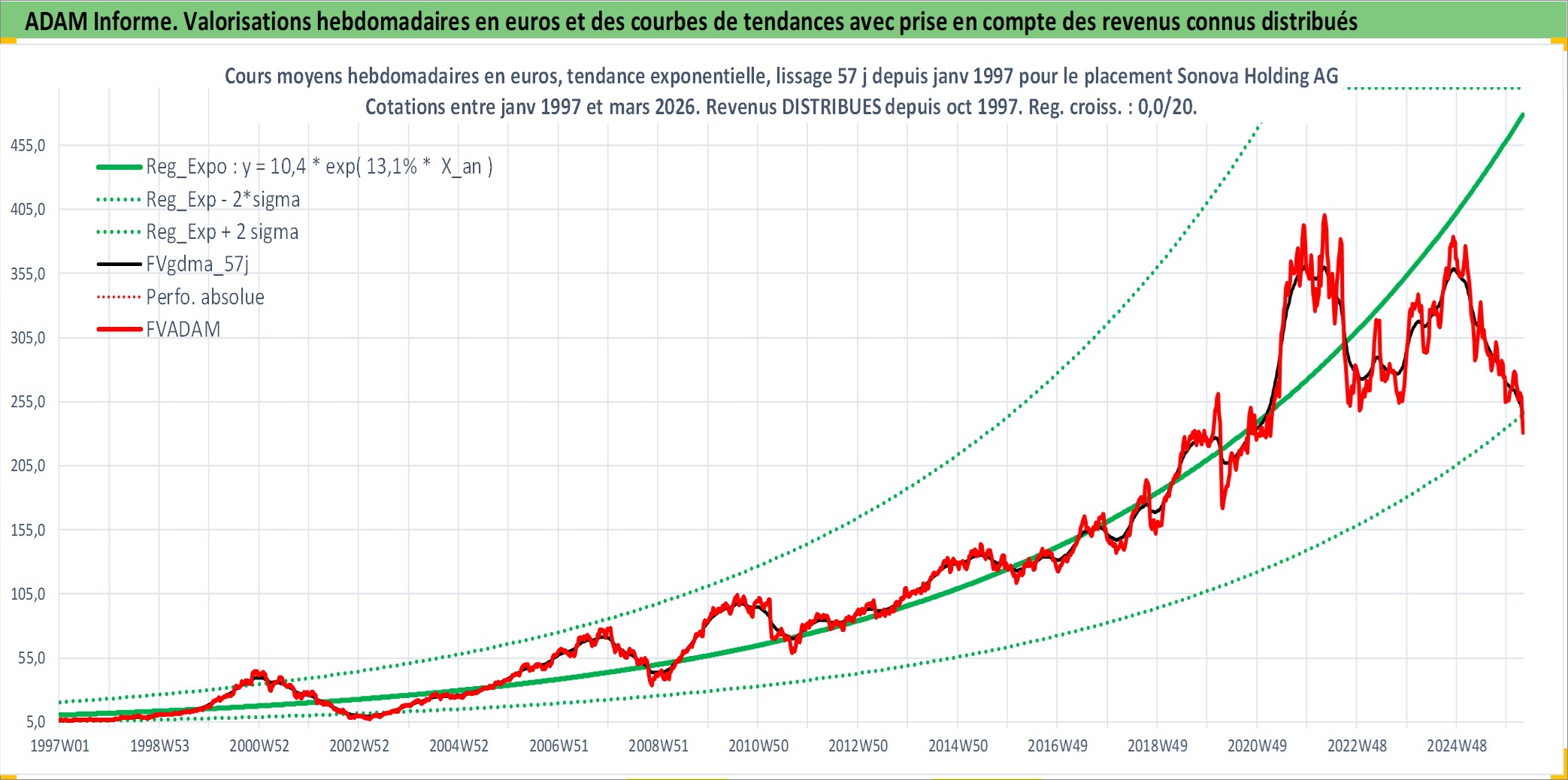 Site dédié aux investisseursPage dédiée sur site financeAnalyse des valorisations hebdomadaires de l'action Sonova Holding AG. Cet actif est cote en CHF. Les valorisations sont en contrevaleur EURO et couvrent les semaines 1997W01 a 2026W13. Les revenus de cet actif financier sont pris en compte depuis la semaine 1997W40. La note globale ESG de cet actif est estimee a 11.0 (apres rebasage entre 0 et 20).