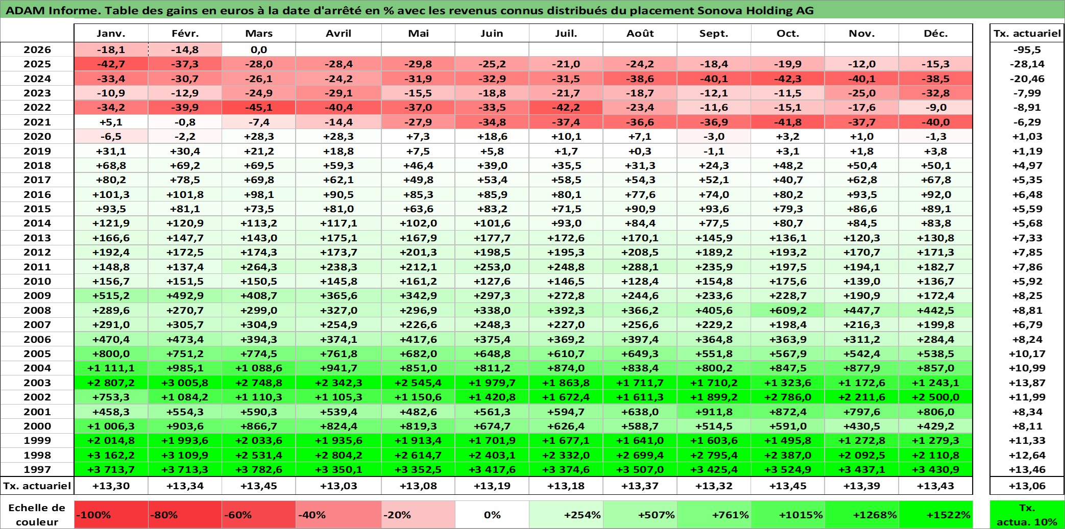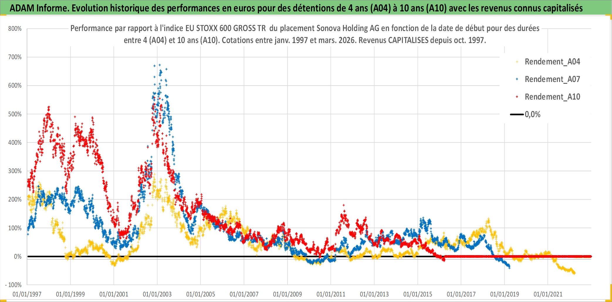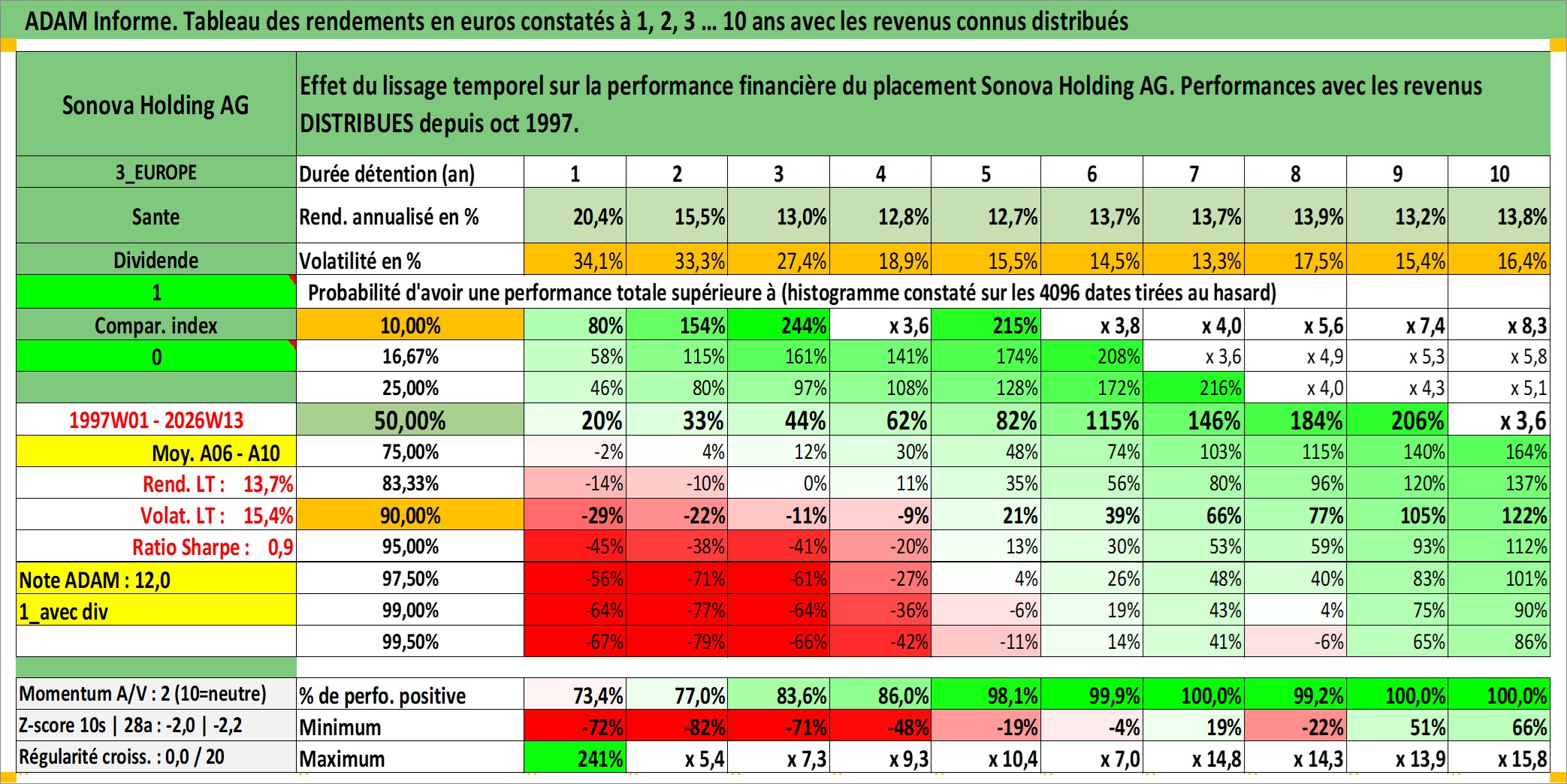 Site dédié aux investisseursPage dédiée sur site financeAnalyse des valorisations hebdomadaires de l'action Sonova Holding AG. Cet actif est cote en CHF. Les valorisations sont en contrevaleur EURO et couvrent les semaines 1997W01 a 2026W13. Les revenus de cet actif financier sont pris en compte depuis la semaine 1997W40. La note globale ESG de cet actif est estimee a 11.0 (apres rebasage entre 0 et 20).