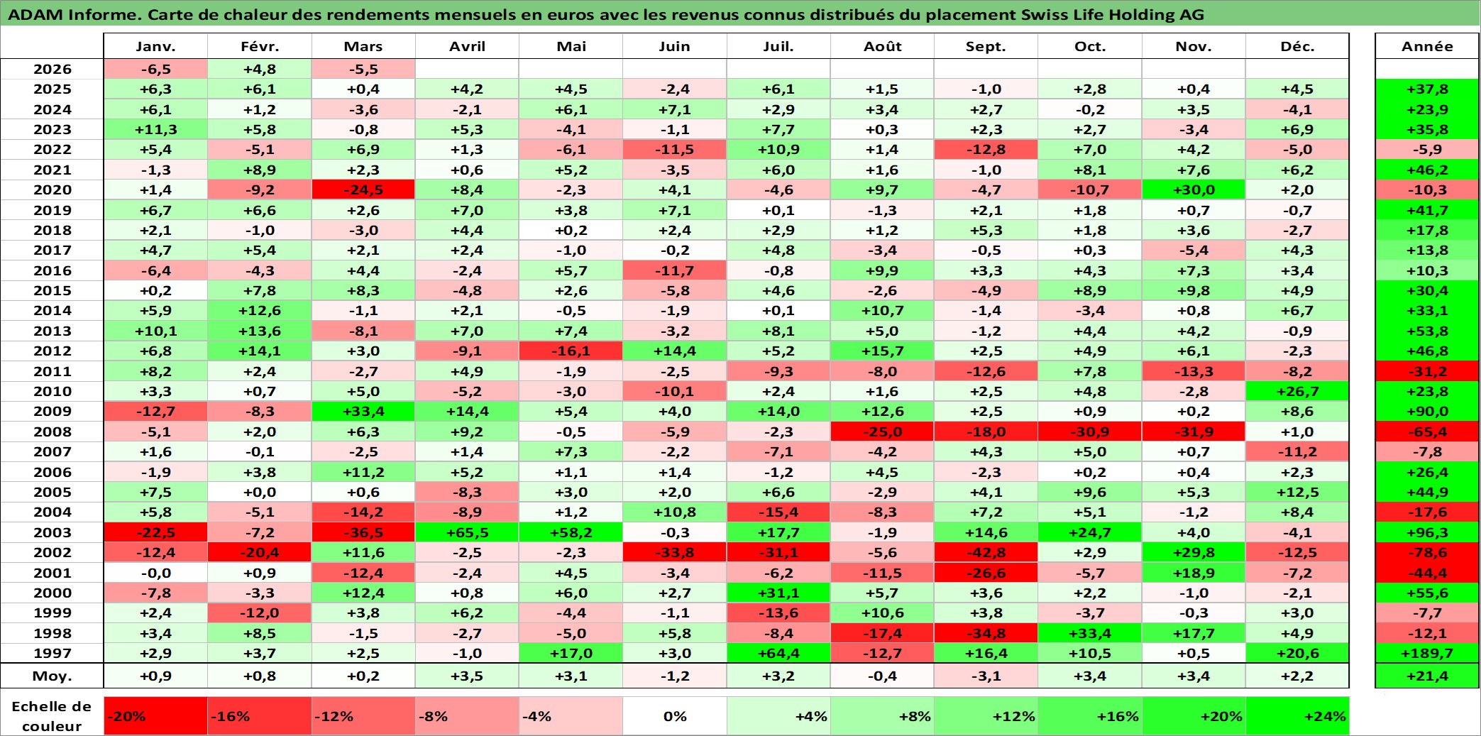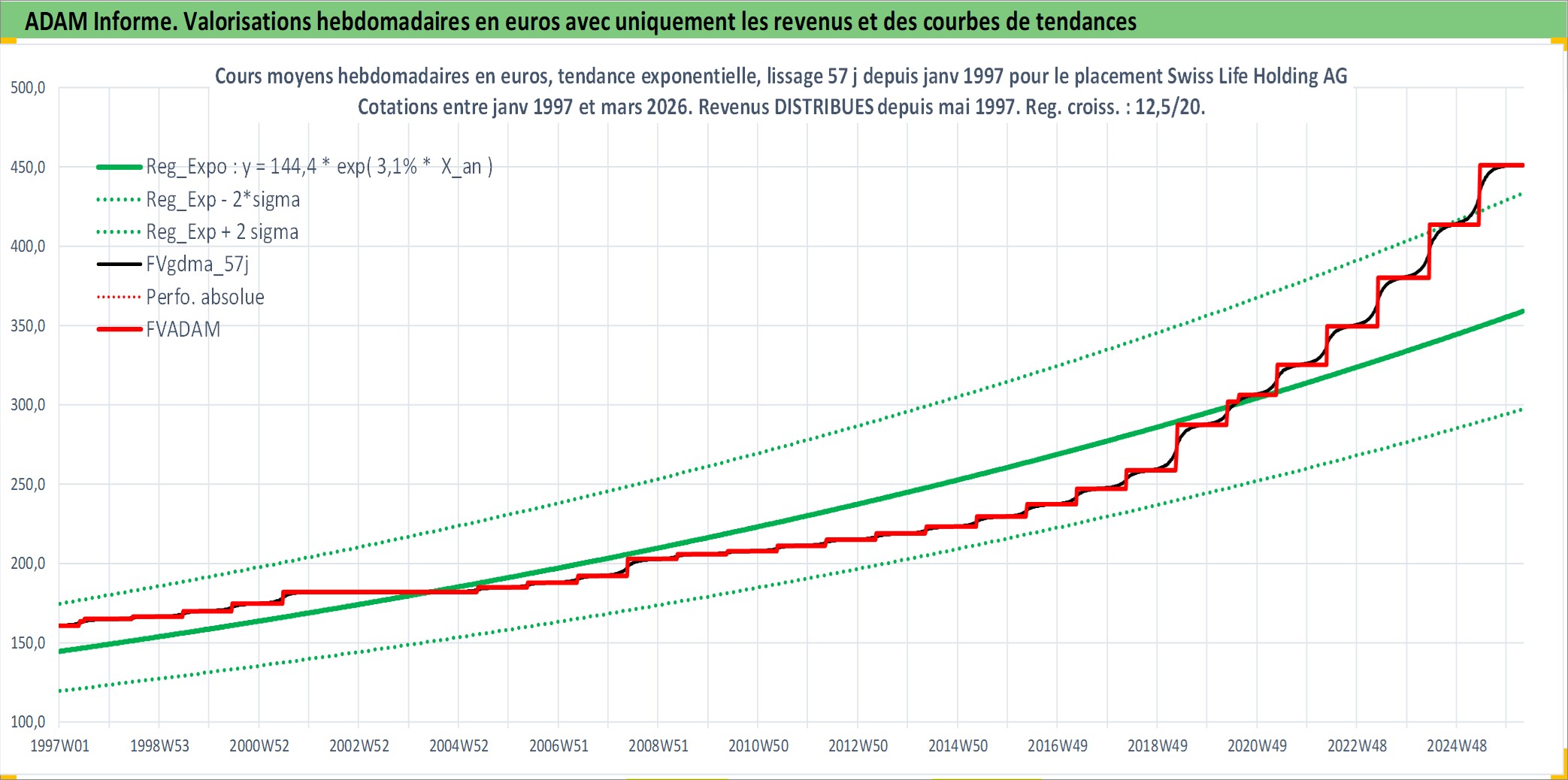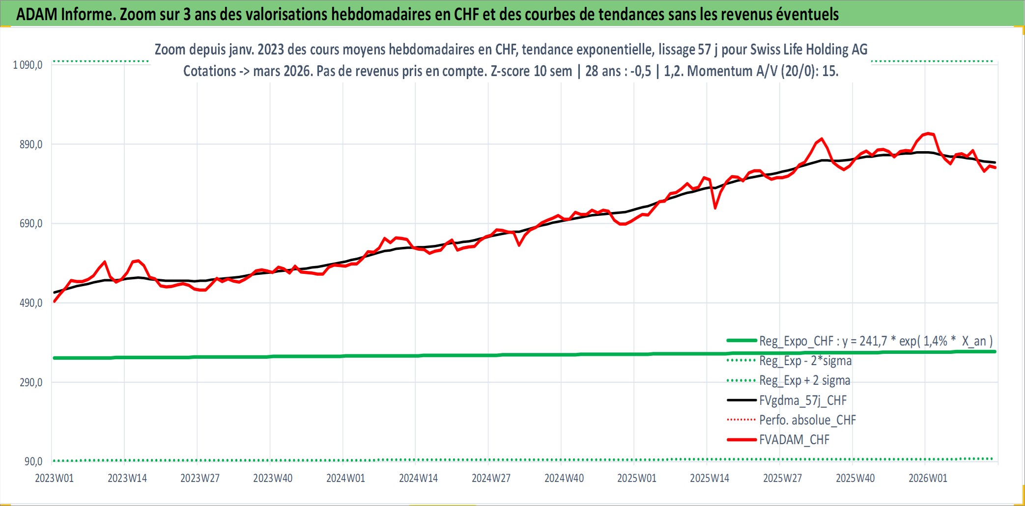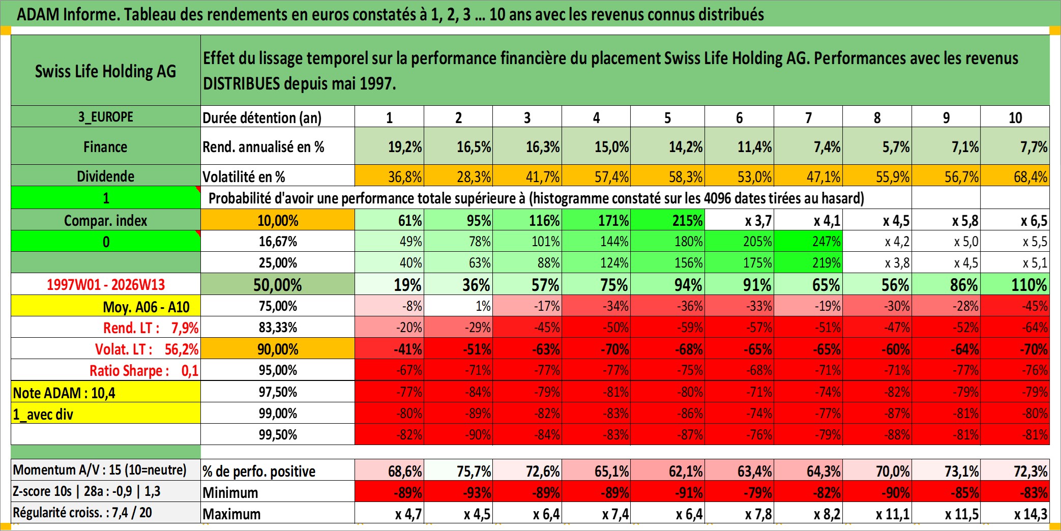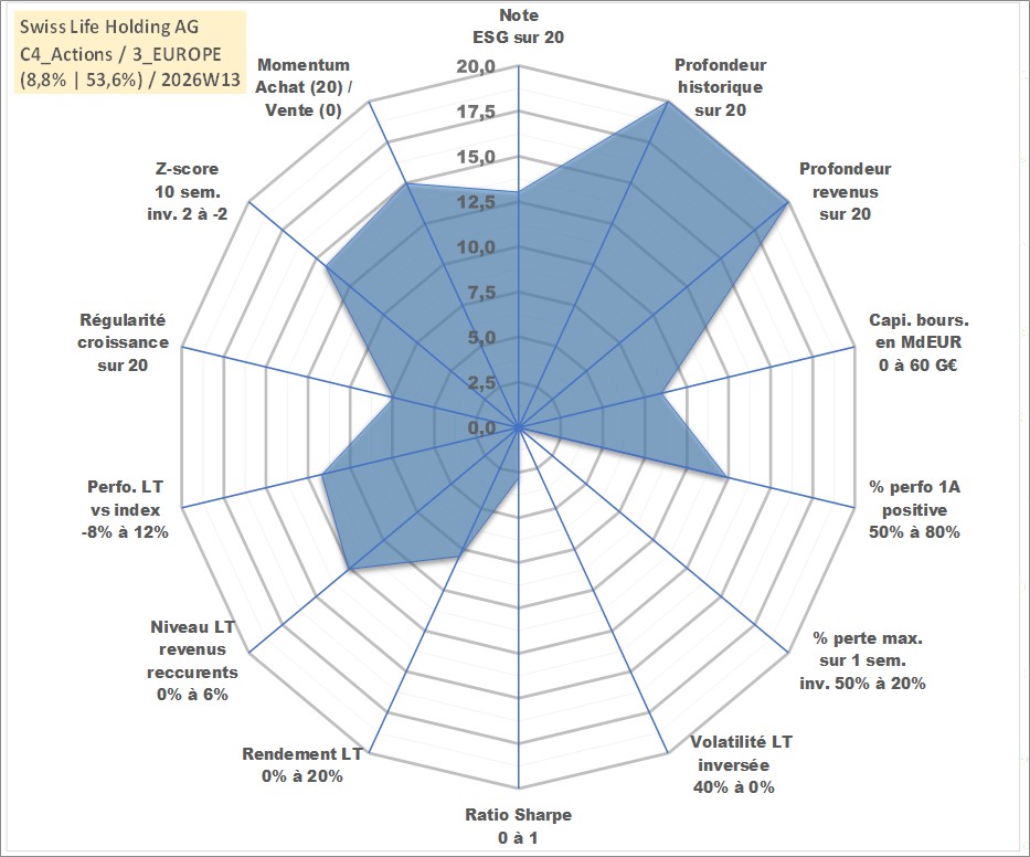 Site dédié aux investisseursPage dédiée sur site financeAnalyse des valorisations hebdomadaires de l'action Swiss Life Holding AG. Cet actif est cote en CHF. Les valorisations sont en contrevaleur EURO et couvrent les semaines 1997W01 a 2026W13. Les revenus de cet actif financier sont pris en compte depuis la semaine 1997W22. La note globale ESG de cet actif est estimee a 13.0 (apres rebasage entre 0 et 20).