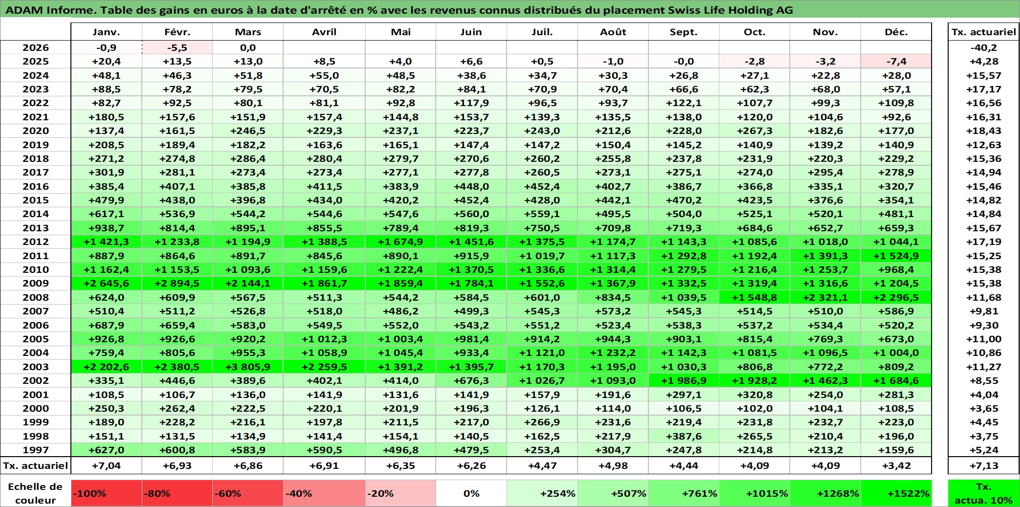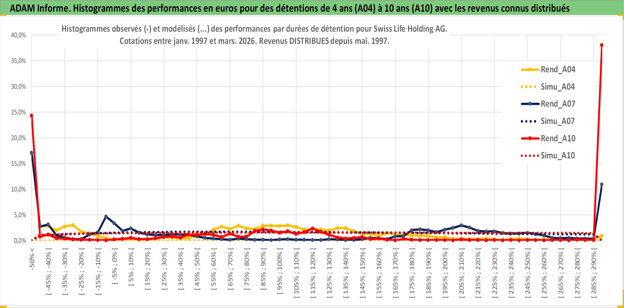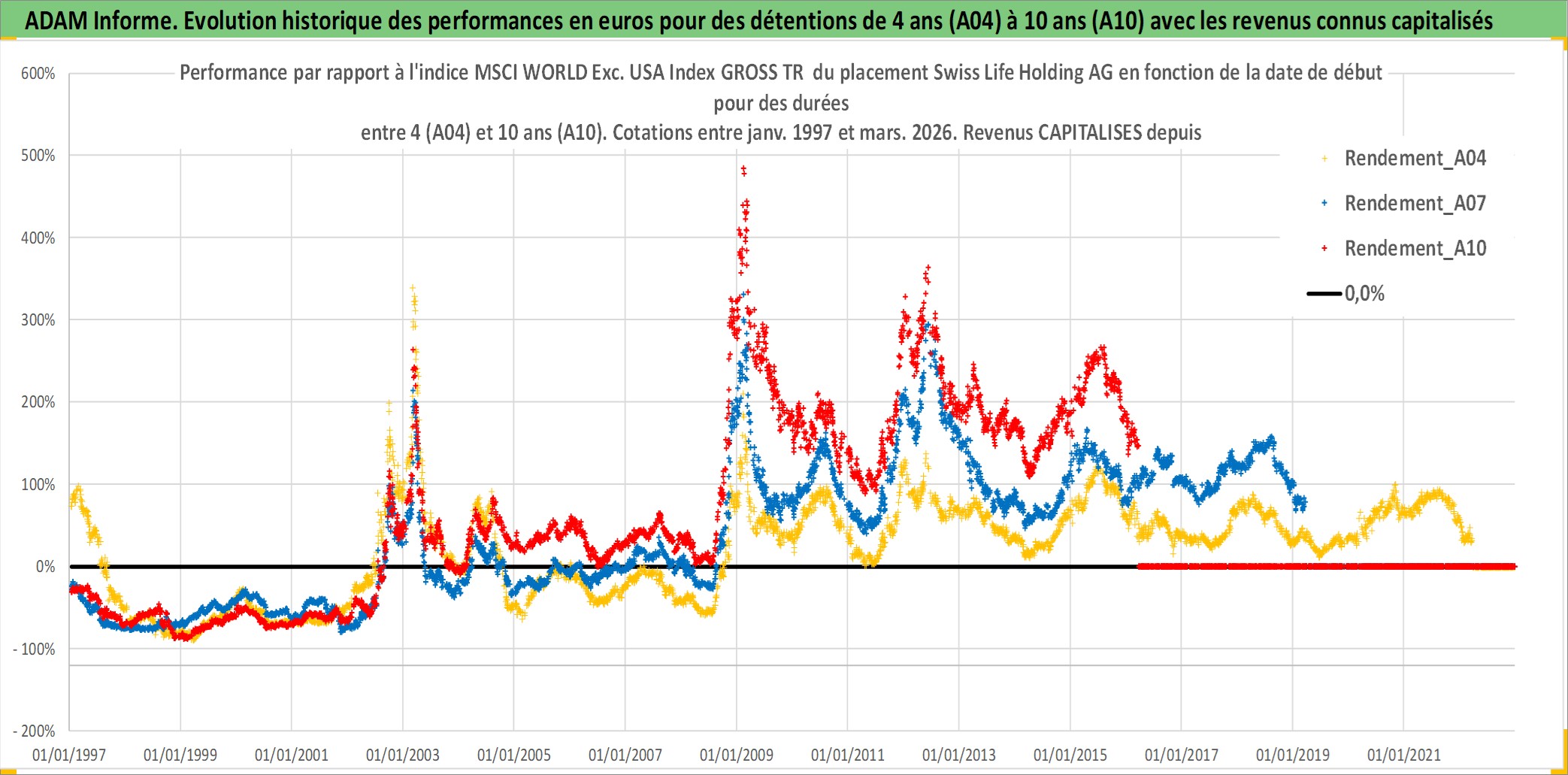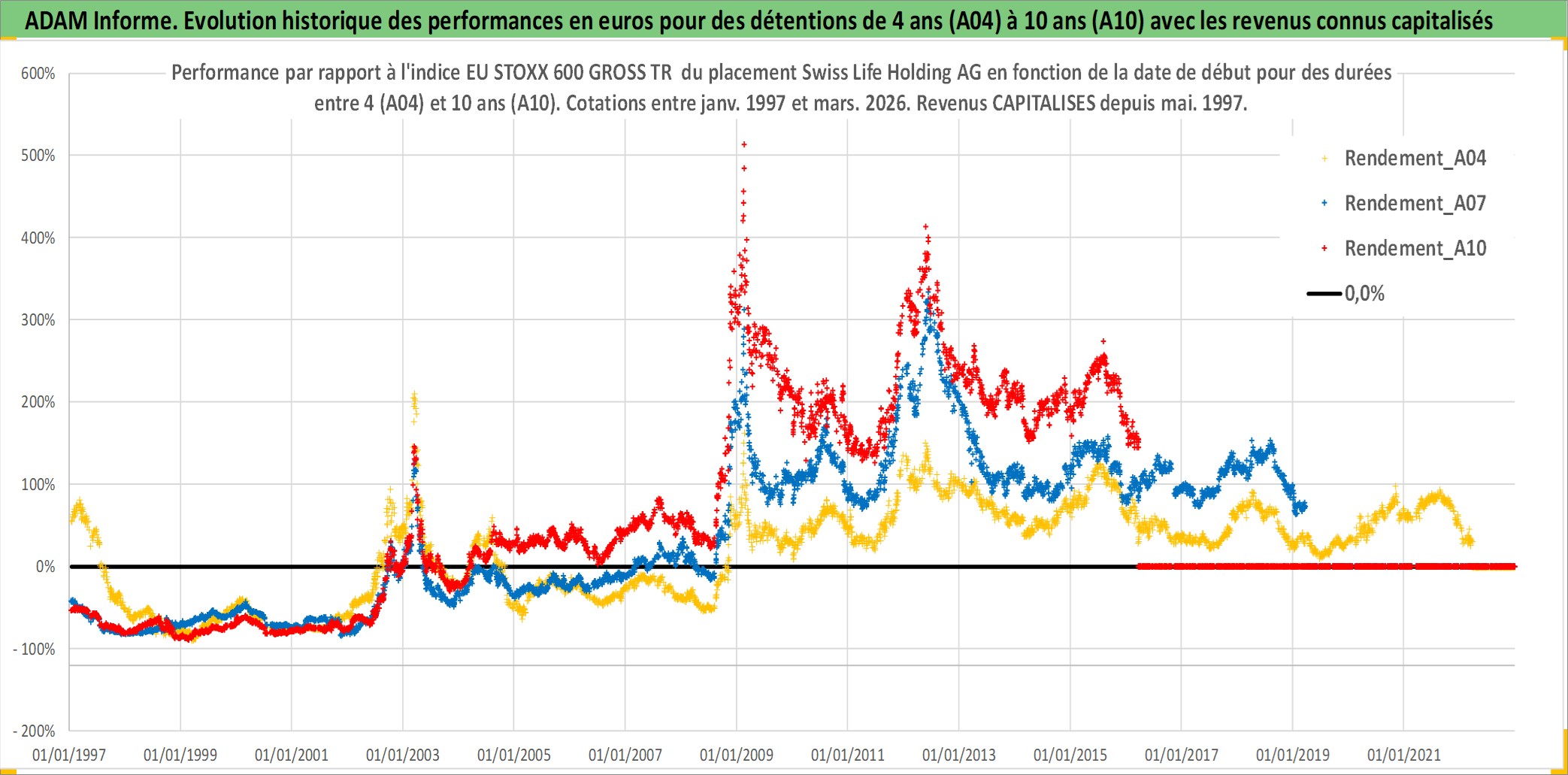 Site dédié aux investisseursPage dédiée sur site financeAnalyse des valorisations hebdomadaires de l'action Swiss Life Holding AG. Cet actif est cote en CHF. Les valorisations sont en contrevaleur EURO et couvrent les semaines 1997W01 a 2026W13. Les revenus de cet actif financier sont pris en compte depuis la semaine 1997W22. La note globale ESG de cet actif est estimee a 13.0 (apres rebasage entre 0 et 20).
