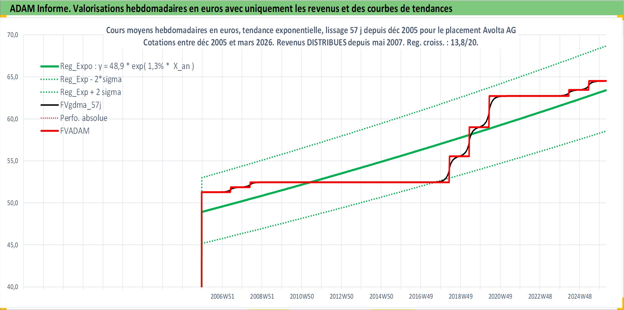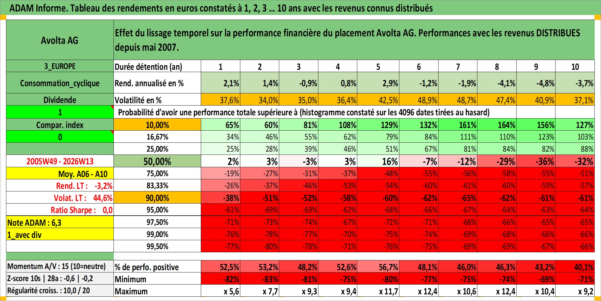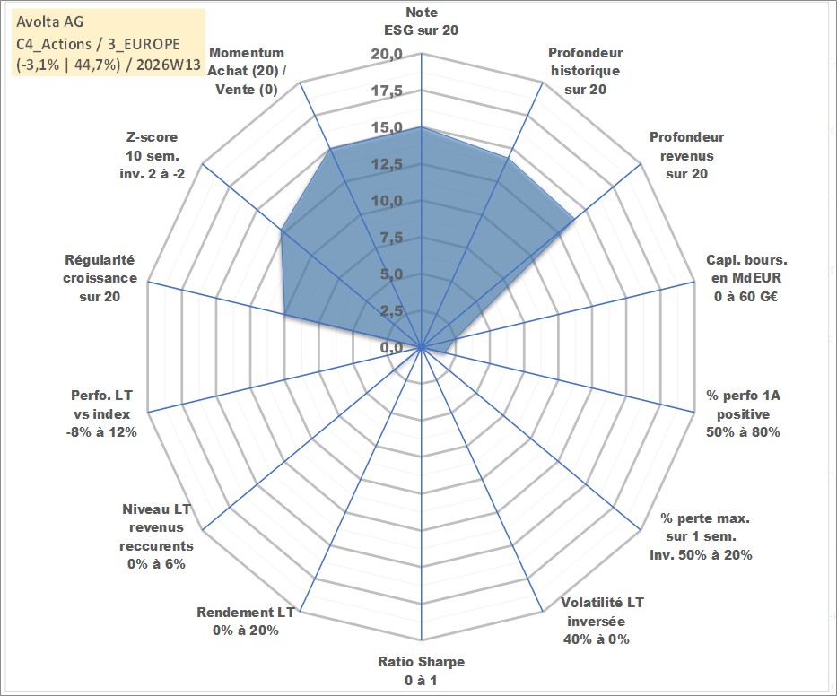 Site dédié aux investisseursPage dédiée sur site financeAnalyse des valorisations hebdomadaires de l'action Avolta AG. Cet actif est cote en CHF. Les valorisations sont en contrevaleur EURO et couvrent les semaines 2005W49 a 2026W13. Les revenus de cet actif financier sont pris en compte depuis la semaine 2007W21. La note globale ESG de cet actif est estimee a 15.0 (apres rebasage entre 0 et 20).