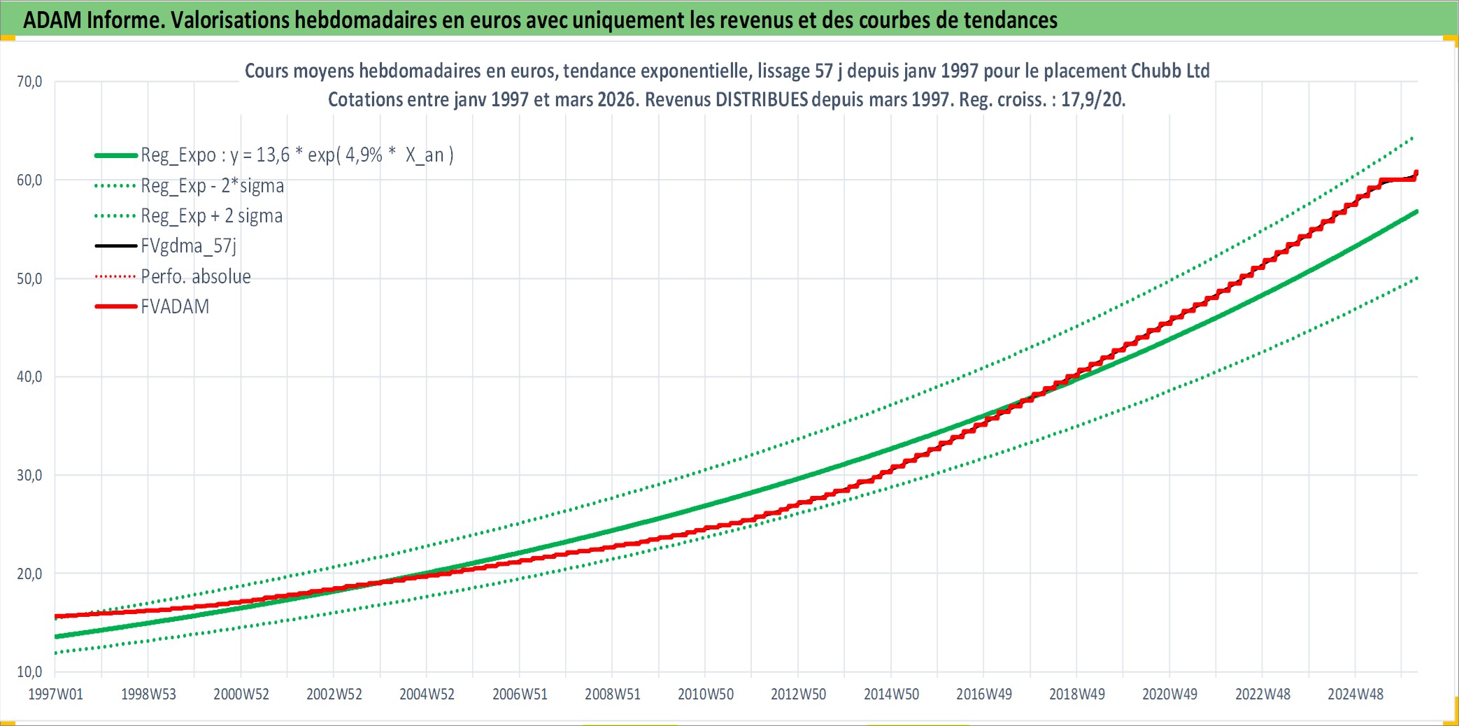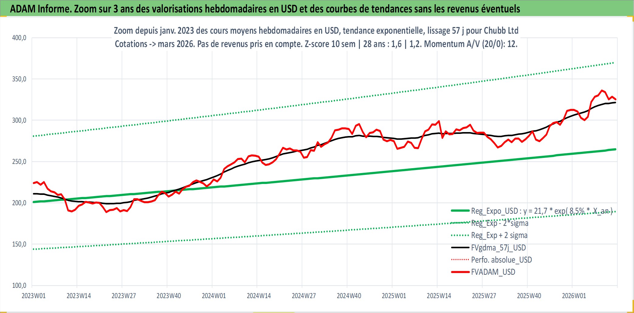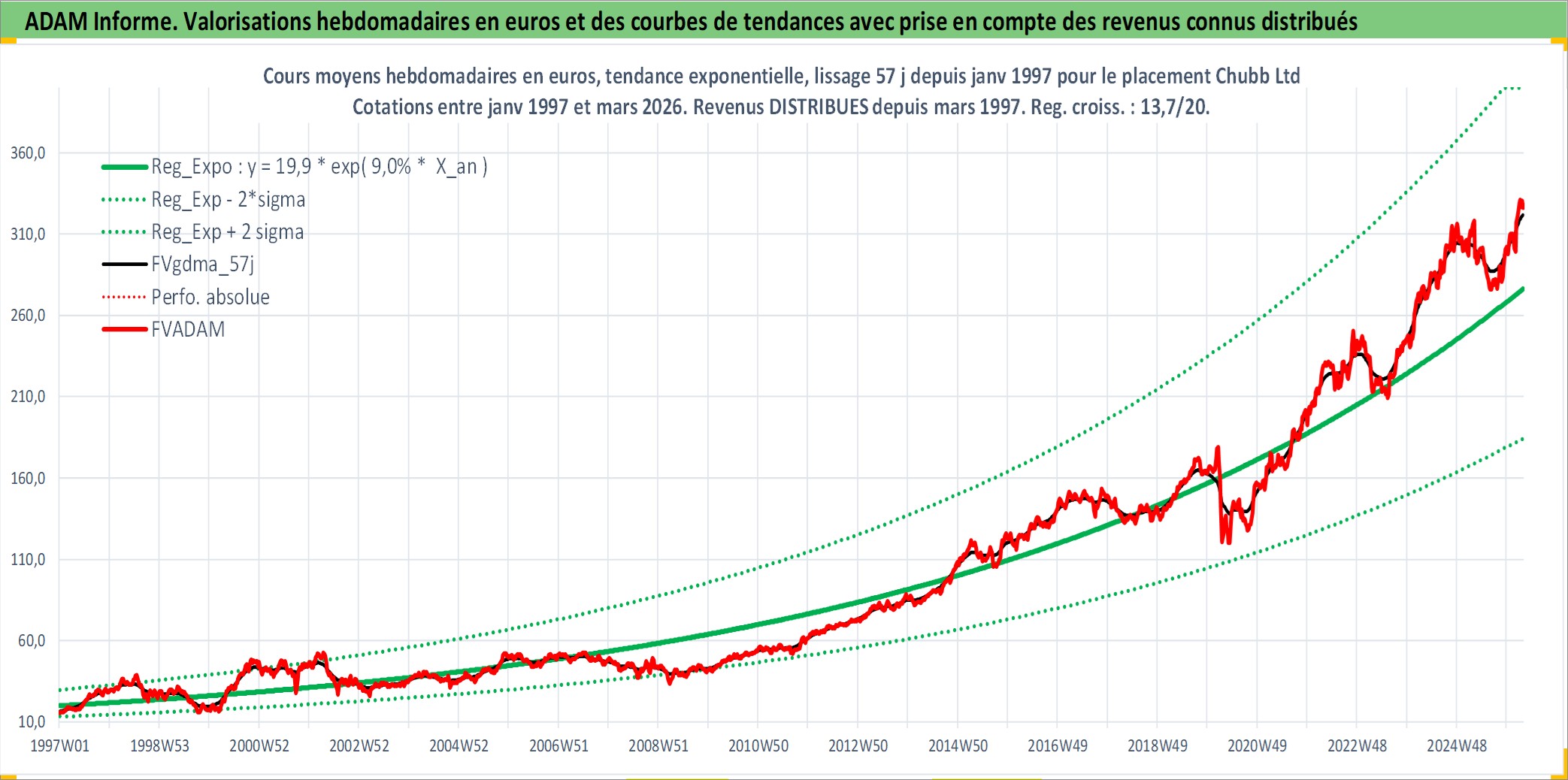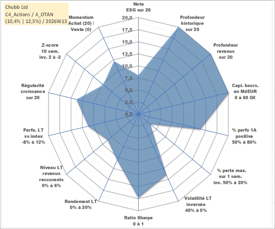 Site dédié aux investisseursPage dédiée sur site financeAnalyse des valorisations hebdomadaires de l'action Chubb Ltd. Cet actif est cote en USD. Les valorisations sont en contrevaleur EURO et couvrent les semaines 1997W01 a 2026W13. Les revenus de cet actif financier sont pris en compte depuis la semaine 1997W13. La note globale ESG de cet actif est estimee a 8.0 (apres rebasage entre 0 et 20).