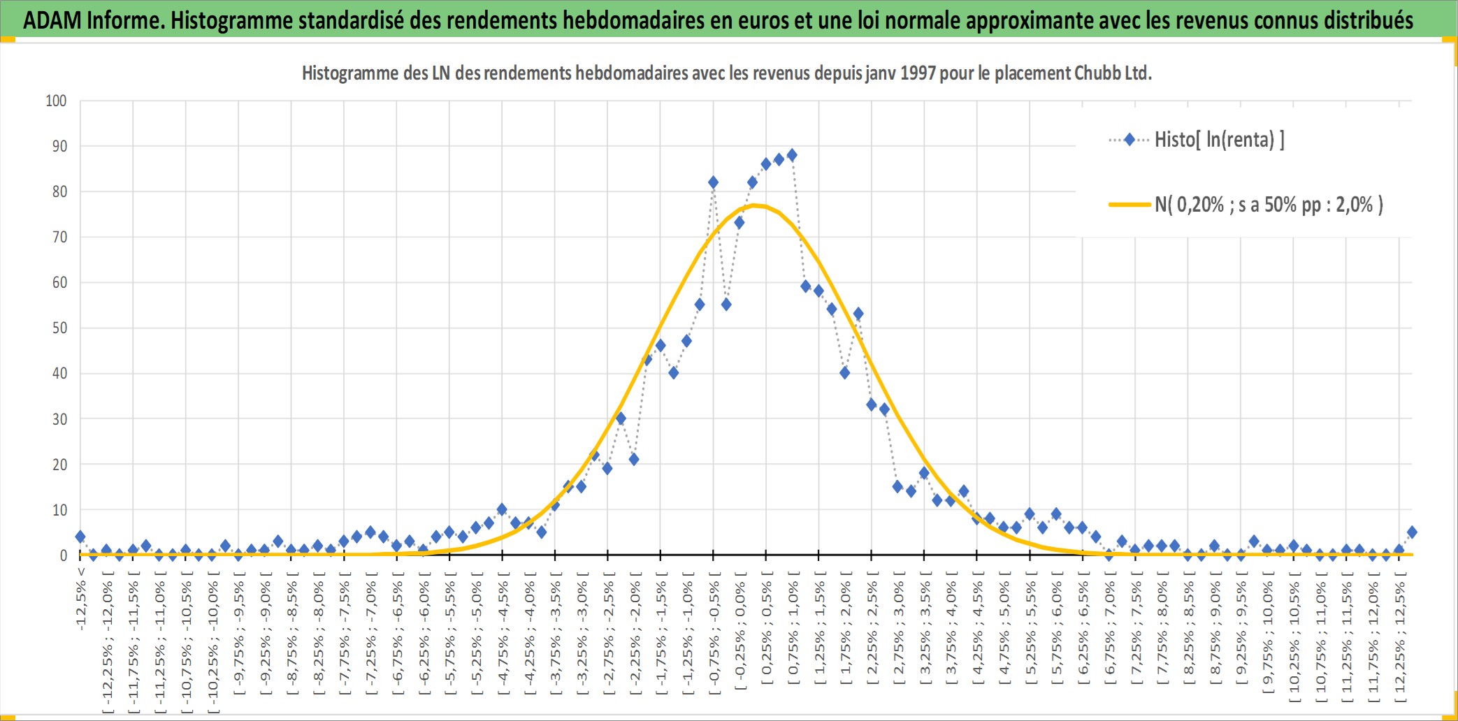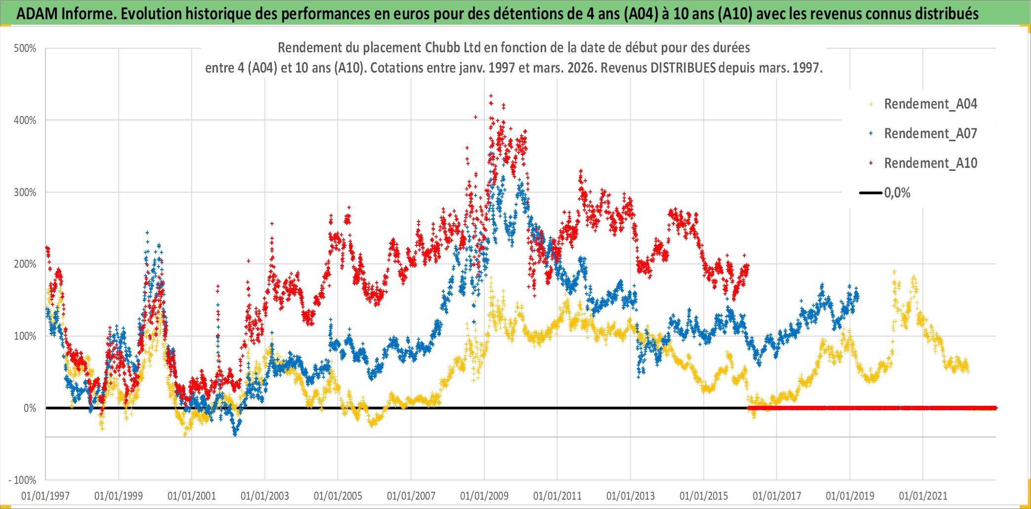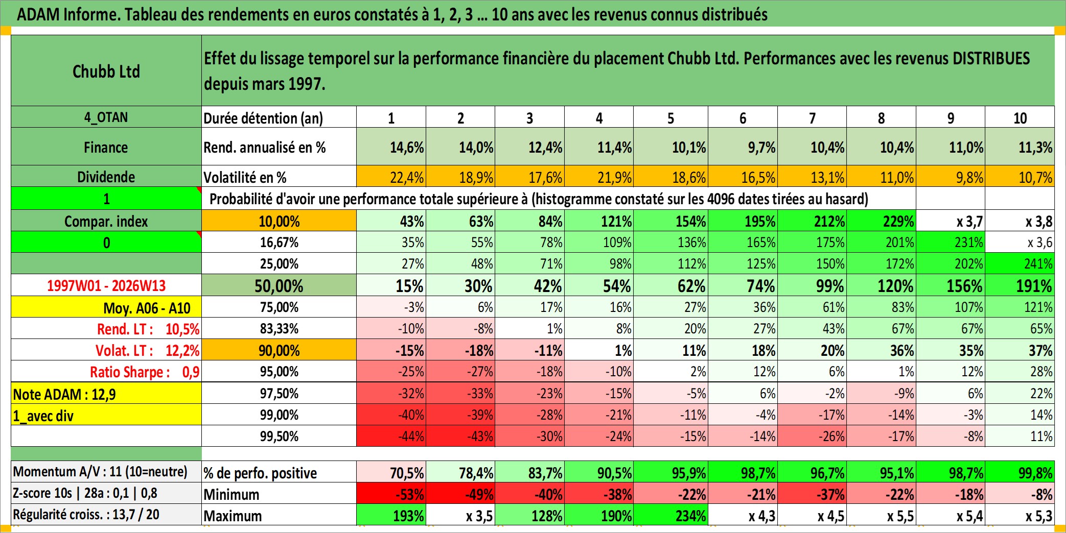 Site dédié aux investisseursPage dédiée sur site financeAnalyse des valorisations hebdomadaires de l'action Chubb Ltd. Cet actif est cote en USD. Les valorisations sont en contrevaleur EURO et couvrent les semaines 1997W01 a 2026W13. Les revenus de cet actif financier sont pris en compte depuis la semaine 1997W13. La note globale ESG de cet actif est estimee a 8.0 (apres rebasage entre 0 et 20).