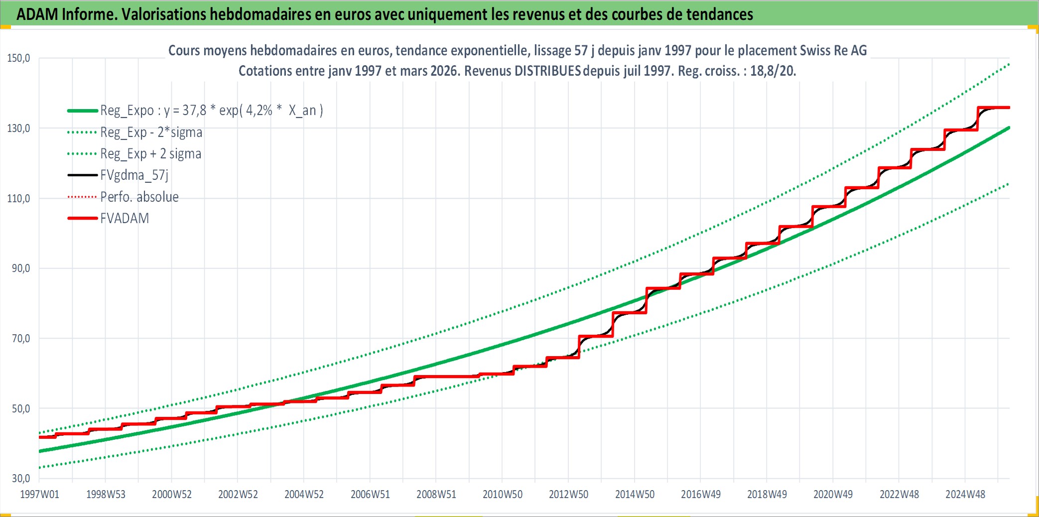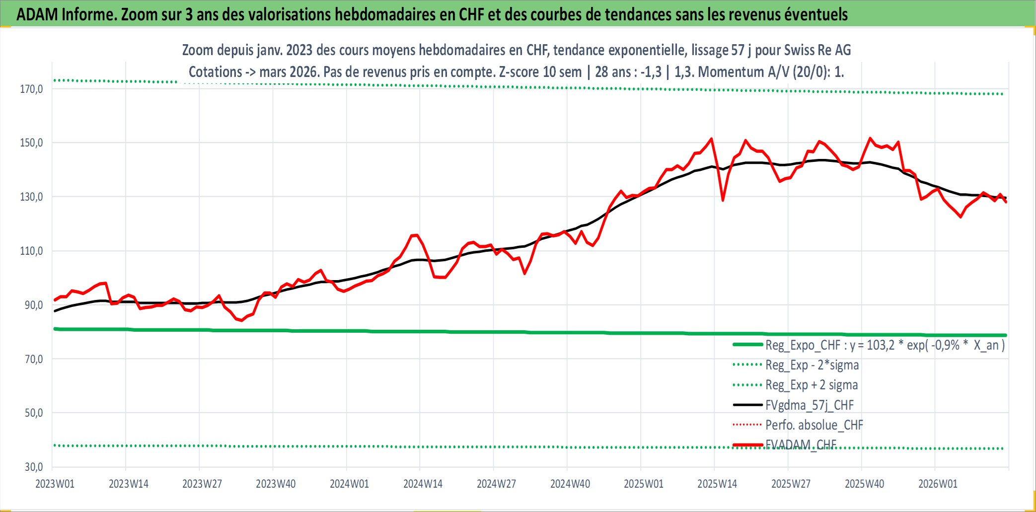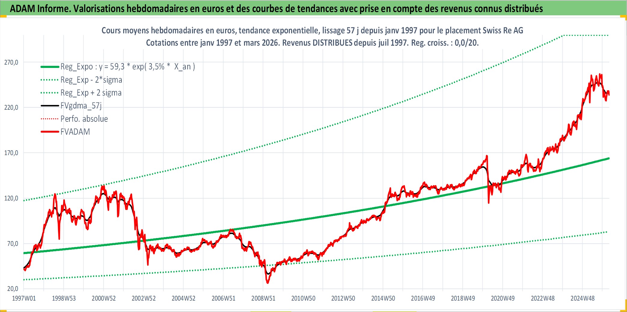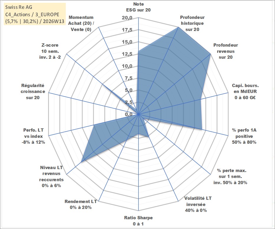 Site dédié aux investisseursPage dédiée sur site financeAnalyse des valorisations hebdomadaires de l'action Swiss Re AG. Cet actif est cote en CHF. Les valorisations sont en contrevaleur EURO et couvrent les semaines 1997W01 a 2026W13. Les revenus de cet actif financier sont pris en compte depuis la semaine 1997W27. La note globale ESG de cet actif est estimee a 13.0 (apres rebasage entre 0 et 20).