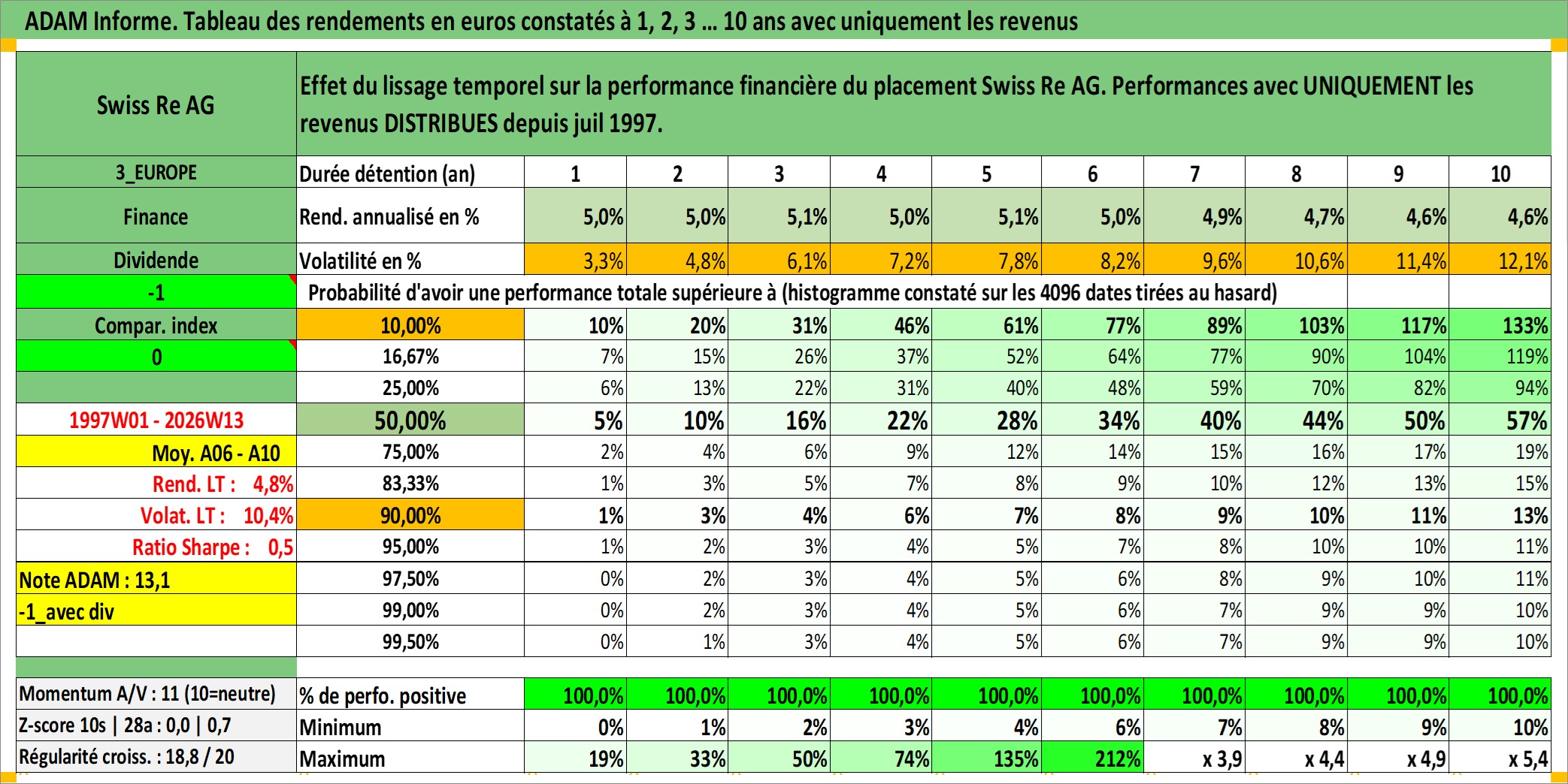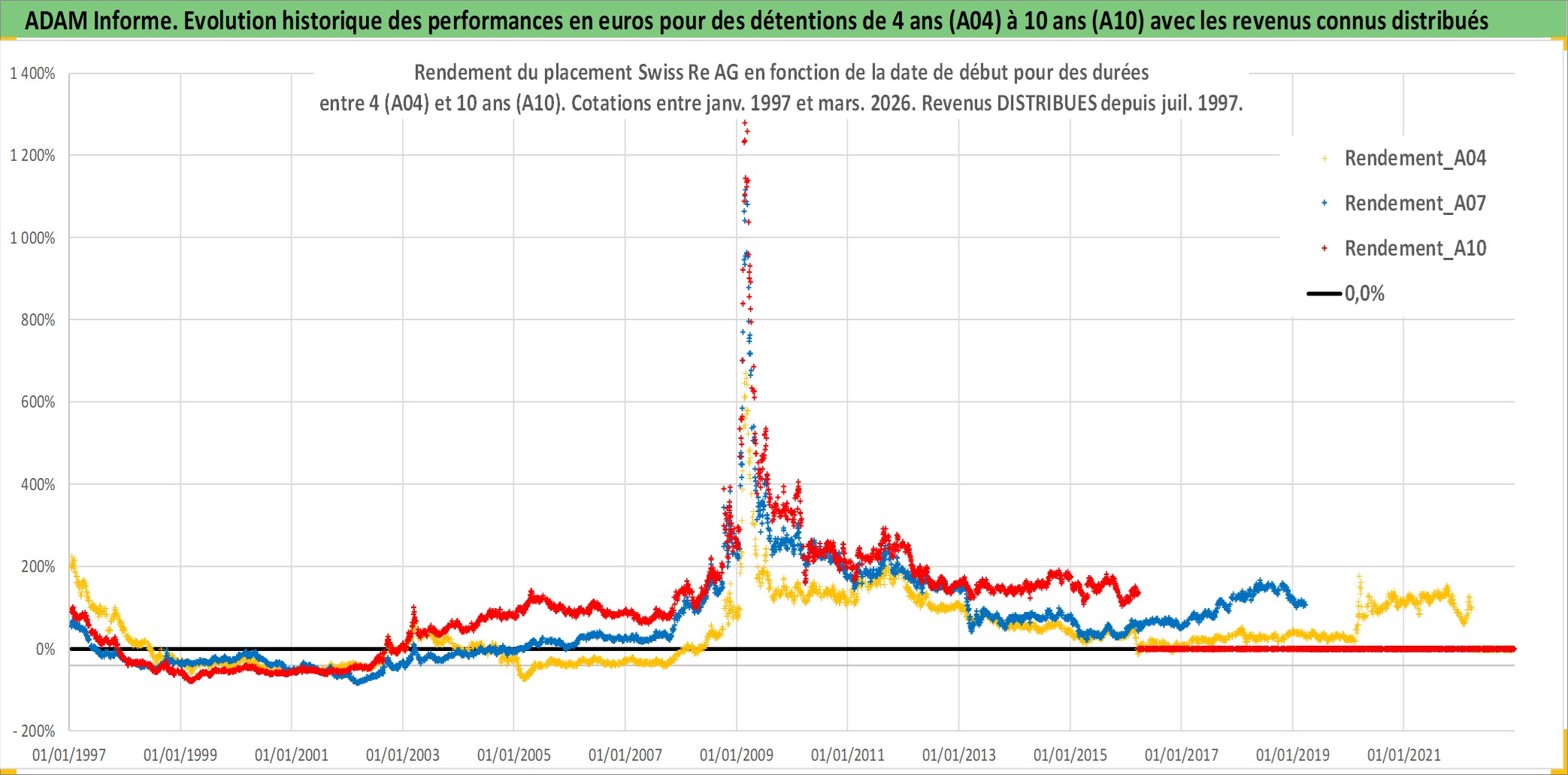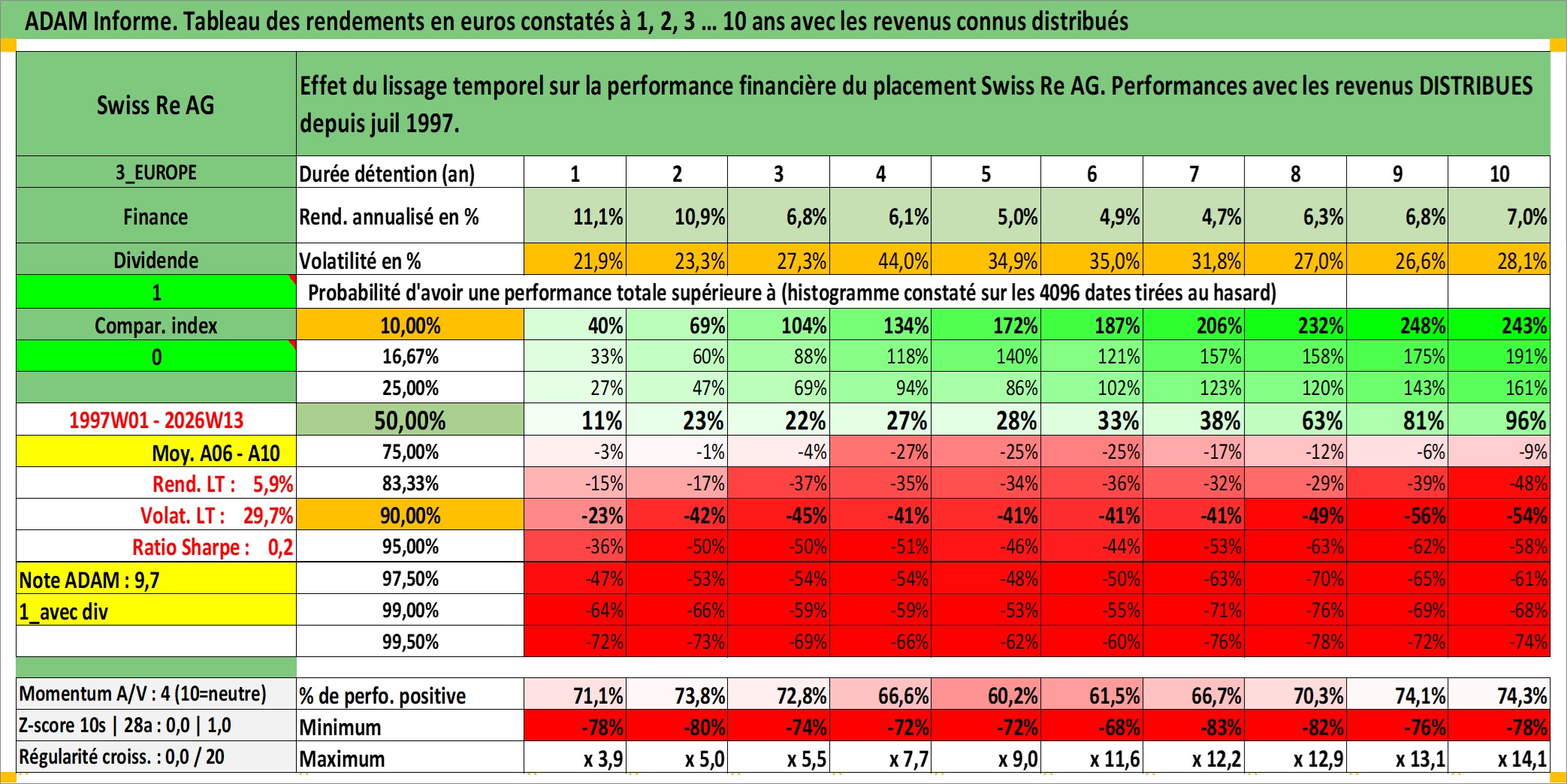 Site dédié aux investisseursPage dédiée sur site financeAnalyse des valorisations hebdomadaires de l'action Swiss Re AG. Cet actif est cote en CHF. Les valorisations sont en contrevaleur EURO et couvrent les semaines 1997W01 a 2026W13. Les revenus de cet actif financier sont pris en compte depuis la semaine 1997W27. La note globale ESG de cet actif est estimee a 13.0 (apres rebasage entre 0 et 20).