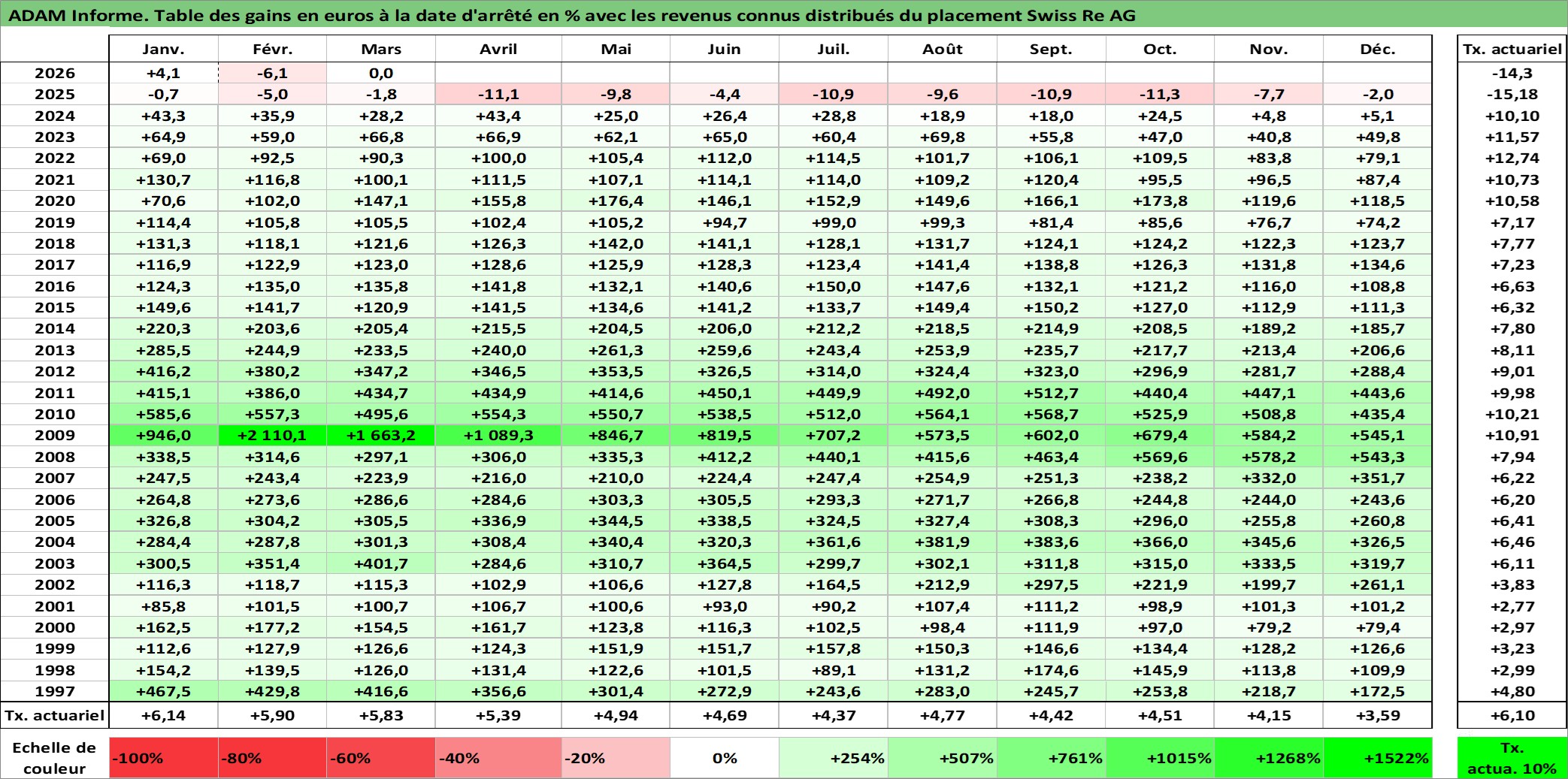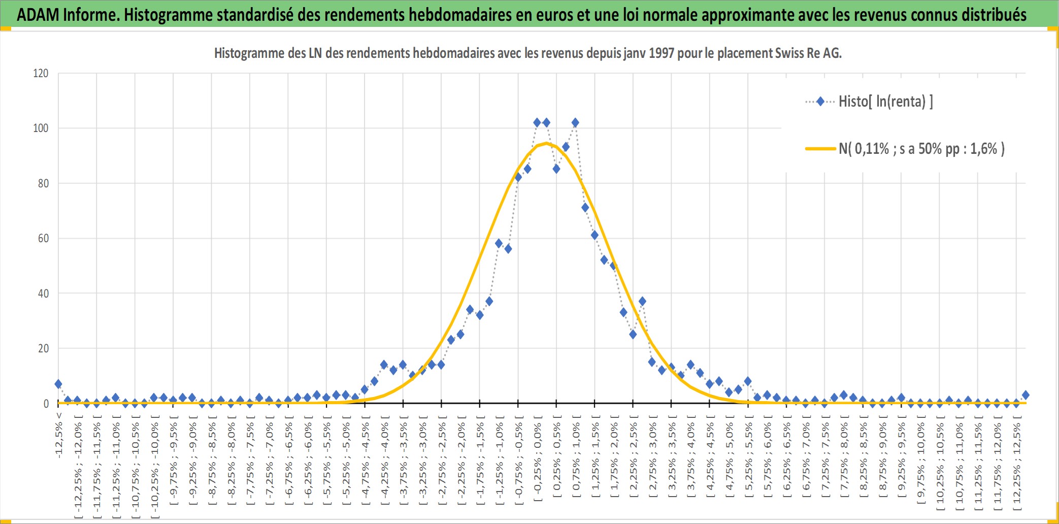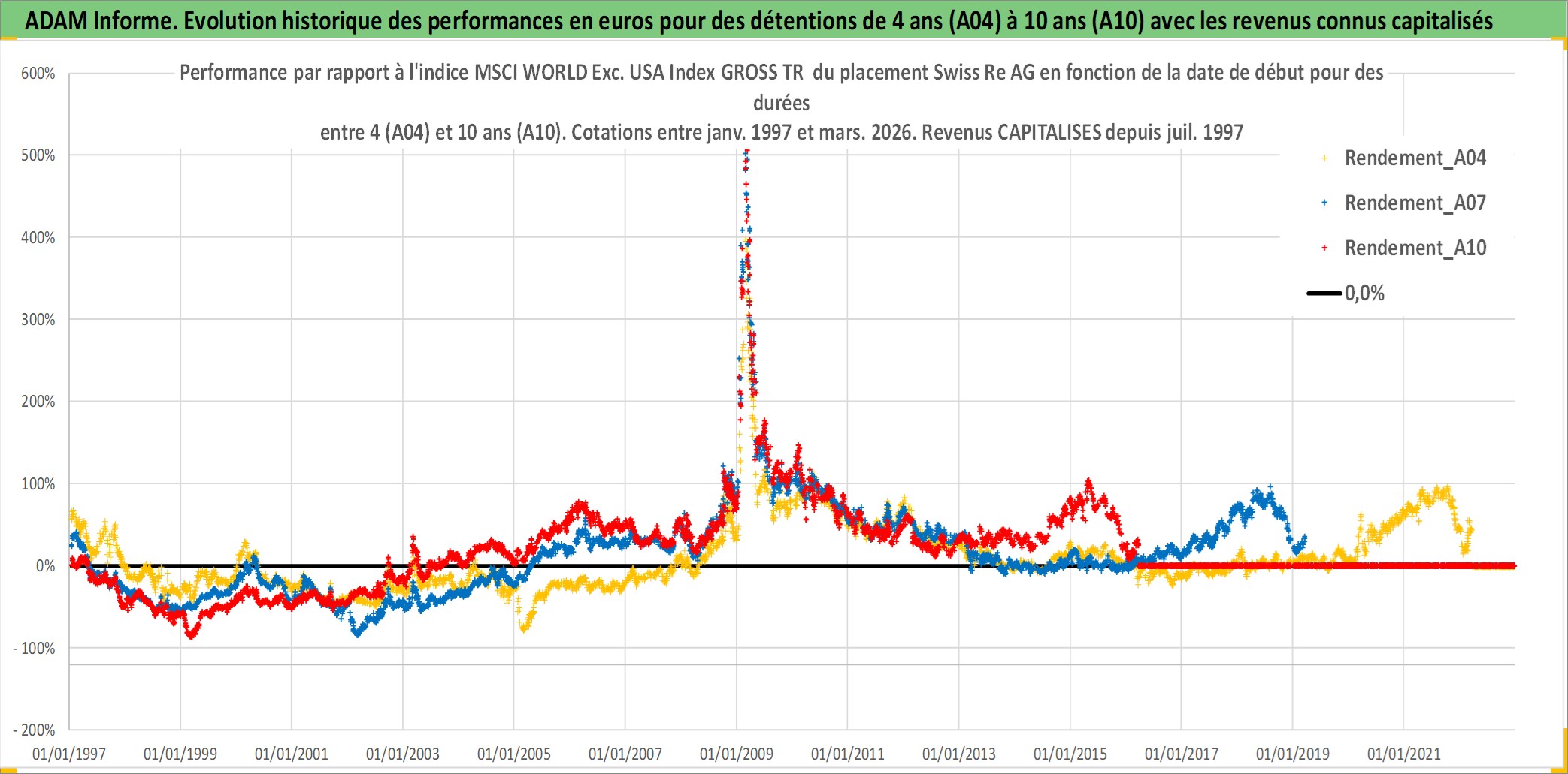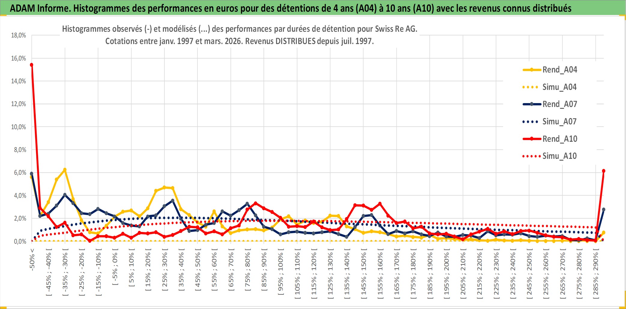 Site dédié aux investisseursPage dédiée sur site financeAnalyse des valorisations hebdomadaires de l'action Swiss Re AG. Cet actif est cote en CHF. Les valorisations sont en contrevaleur EURO et couvrent les semaines 1997W01 a 2026W13. Les revenus de cet actif financier sont pris en compte depuis la semaine 1997W27. La note globale ESG de cet actif est estimee a 13.0 (apres rebasage entre 0 et 20).