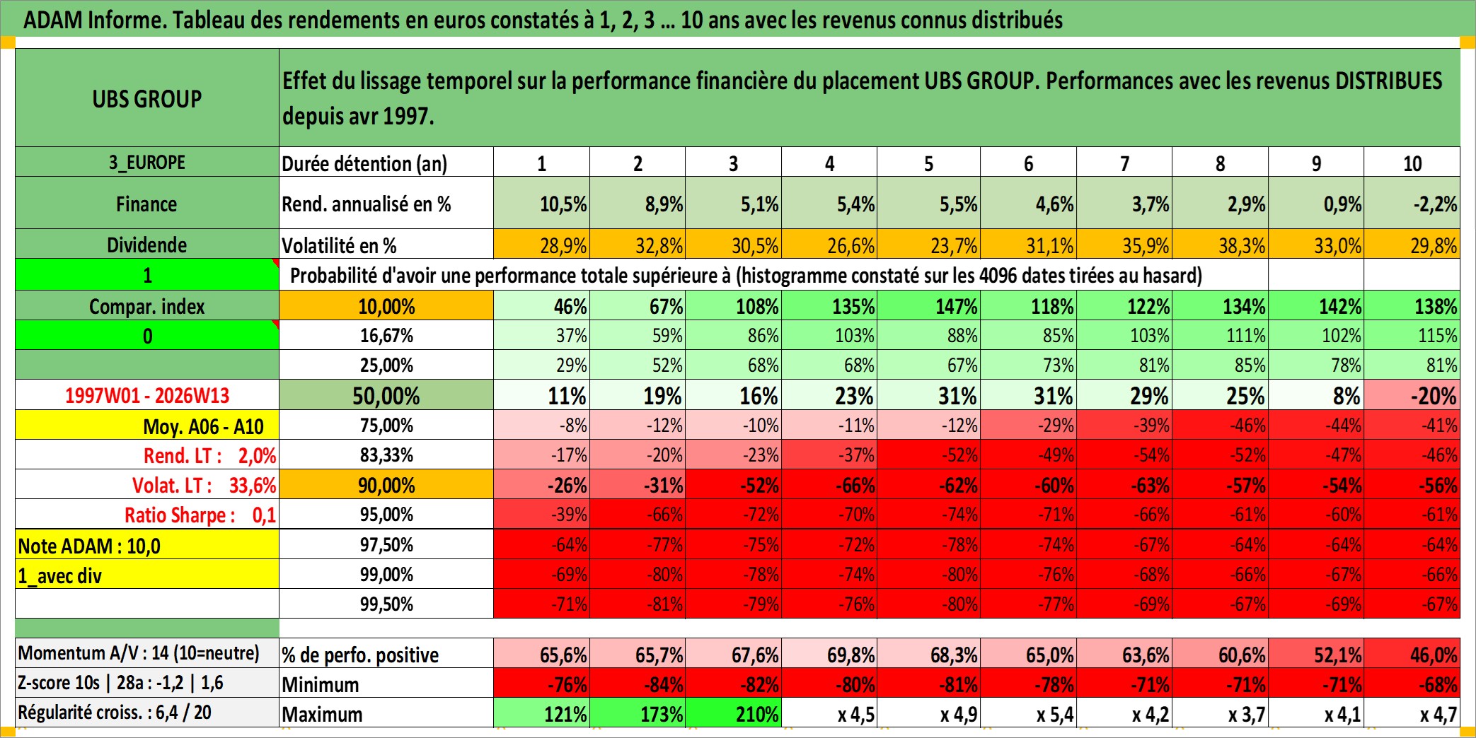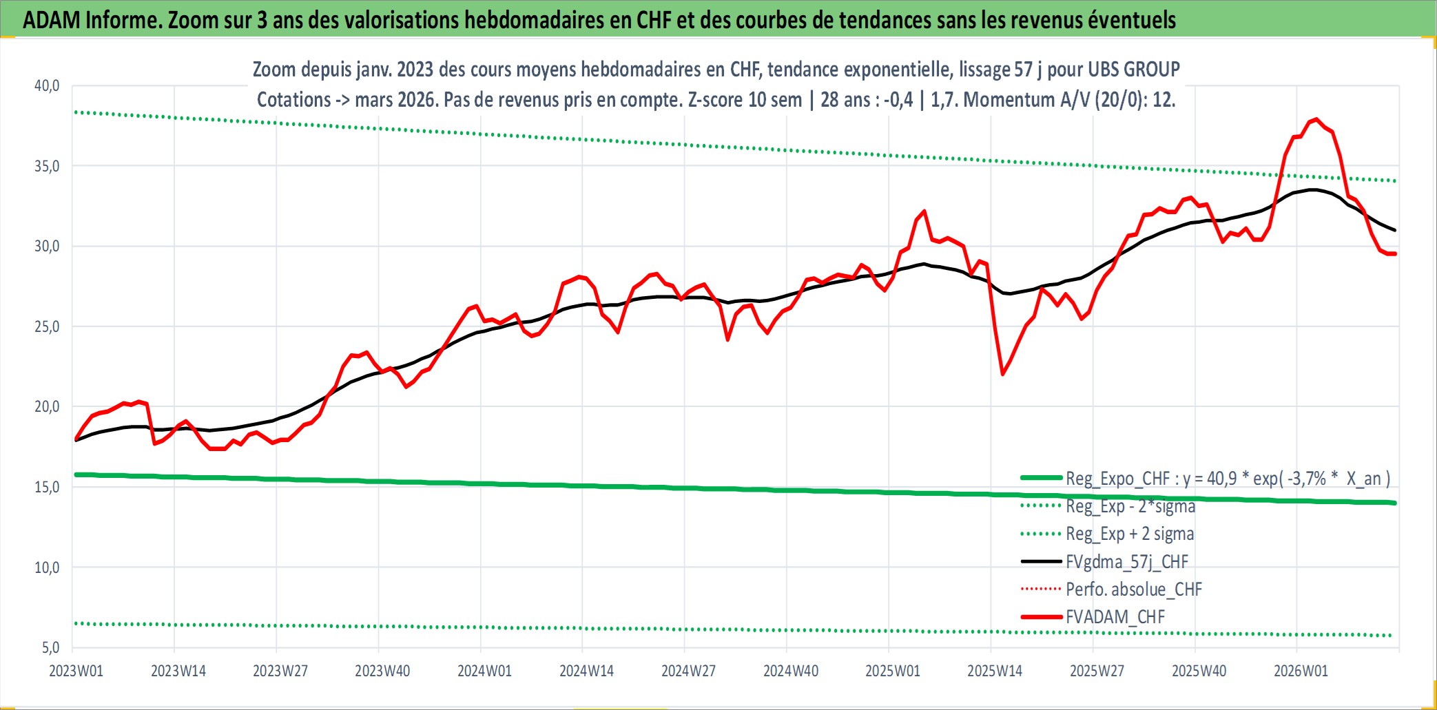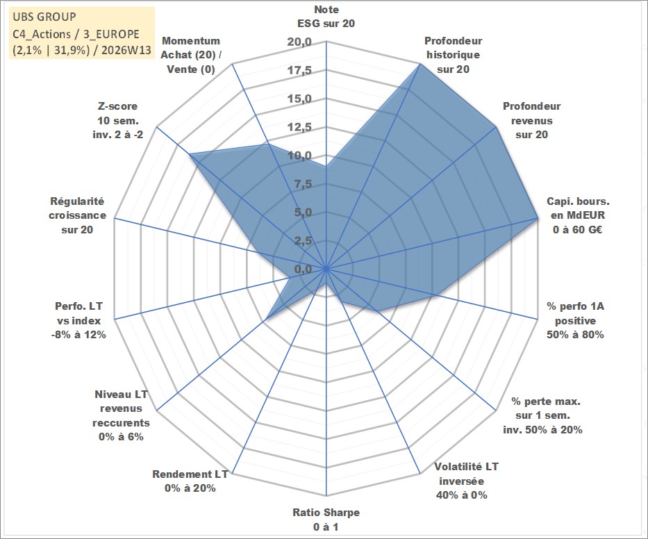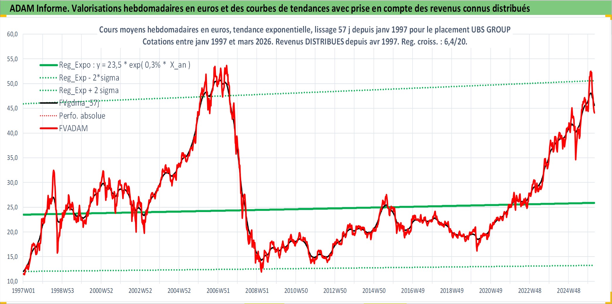 Site dédié aux investisseursPage dédiée sur site financeAnalyse des valorisations hebdomadaires de l'action UBS GROUP. Cet actif est cote en CHF. Les valorisations sont en contrevaleur EURO et couvrent les semaines 1997W01 a 2026W13. Les revenus de cet actif financier sont pris en compte depuis la semaine 1997W17. La note globale ESG de cet actif est estimee a 9.0 (apres rebasage entre 0 et 20).