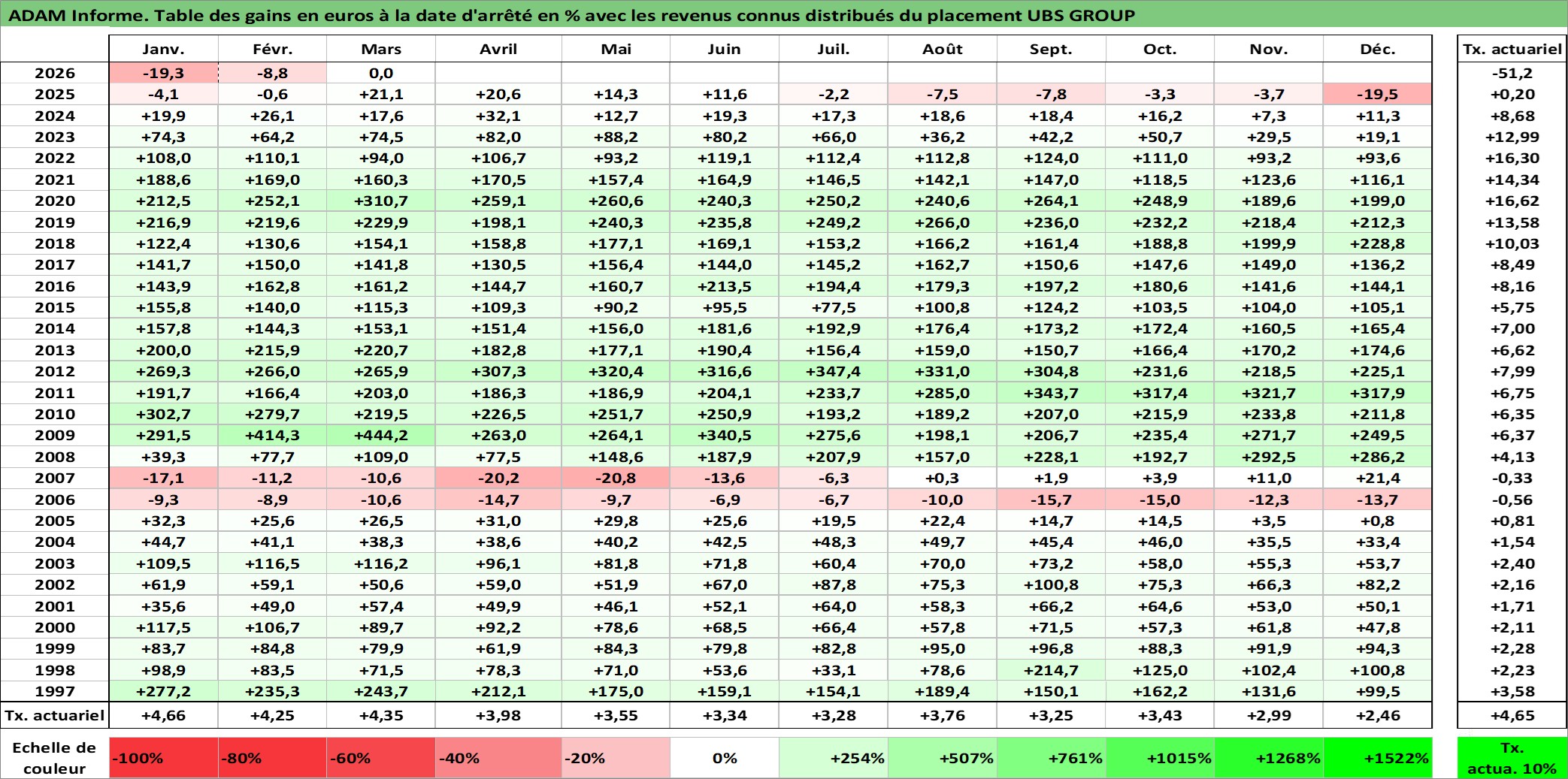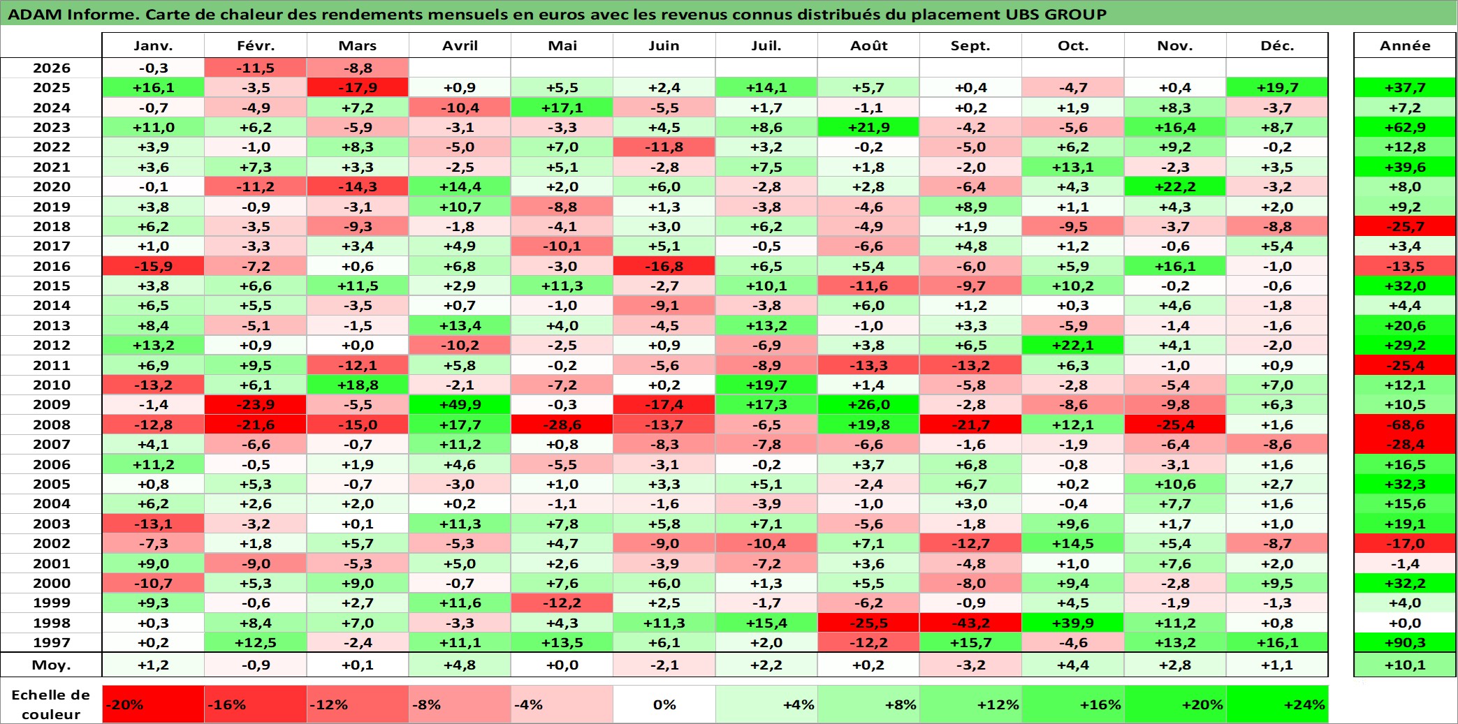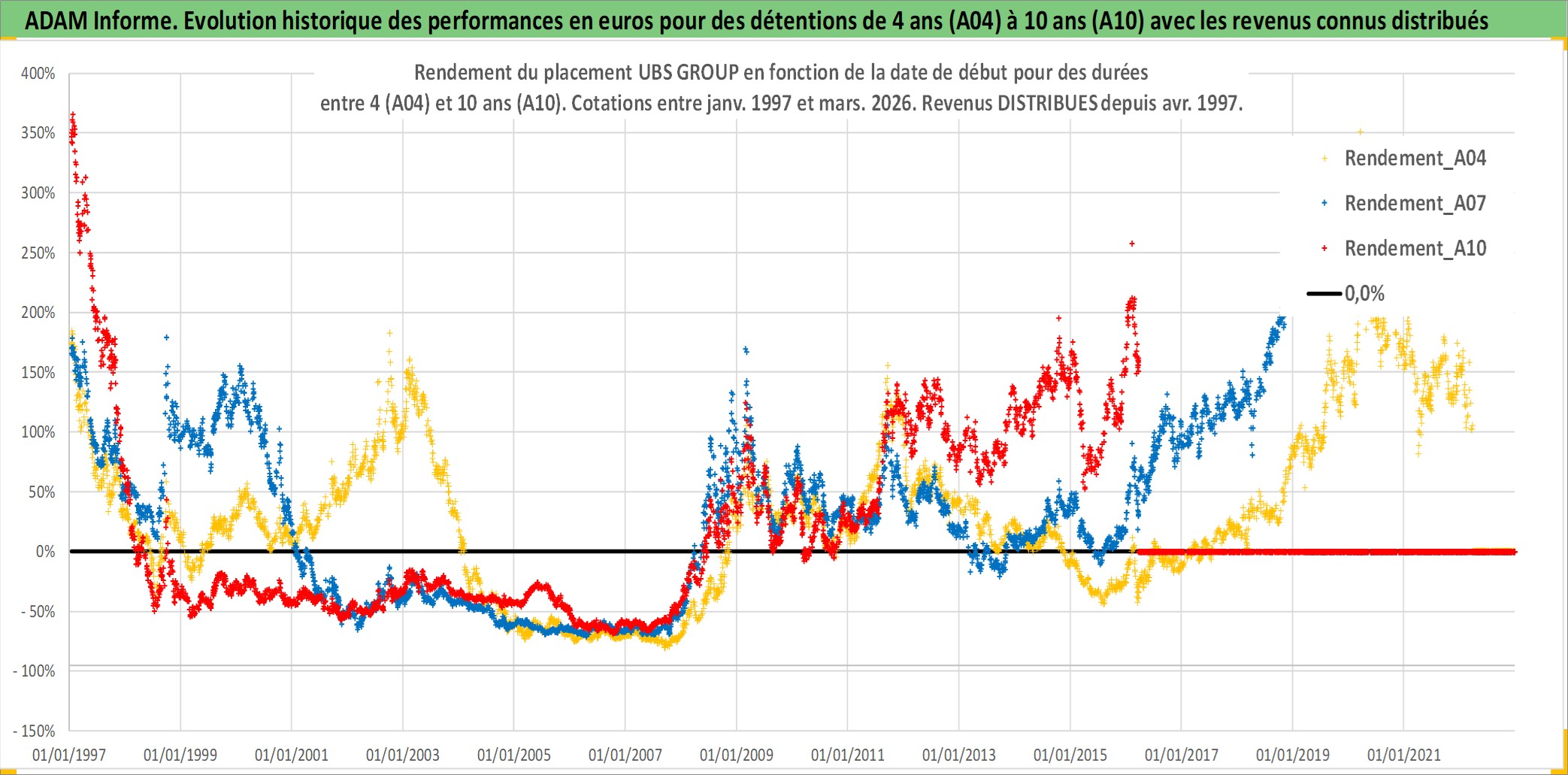 Site dédié aux investisseursPage dédiée sur site financeAnalyse des valorisations hebdomadaires de l'action UBS GROUP. Cet actif est cote en CHF. Les valorisations sont en contrevaleur EURO et couvrent les semaines 1997W01 a 2026W13. Les revenus de cet actif financier sont pris en compte depuis la semaine 1997W17. La note globale ESG de cet actif est estimee a 9.0 (apres rebasage entre 0 et 20).