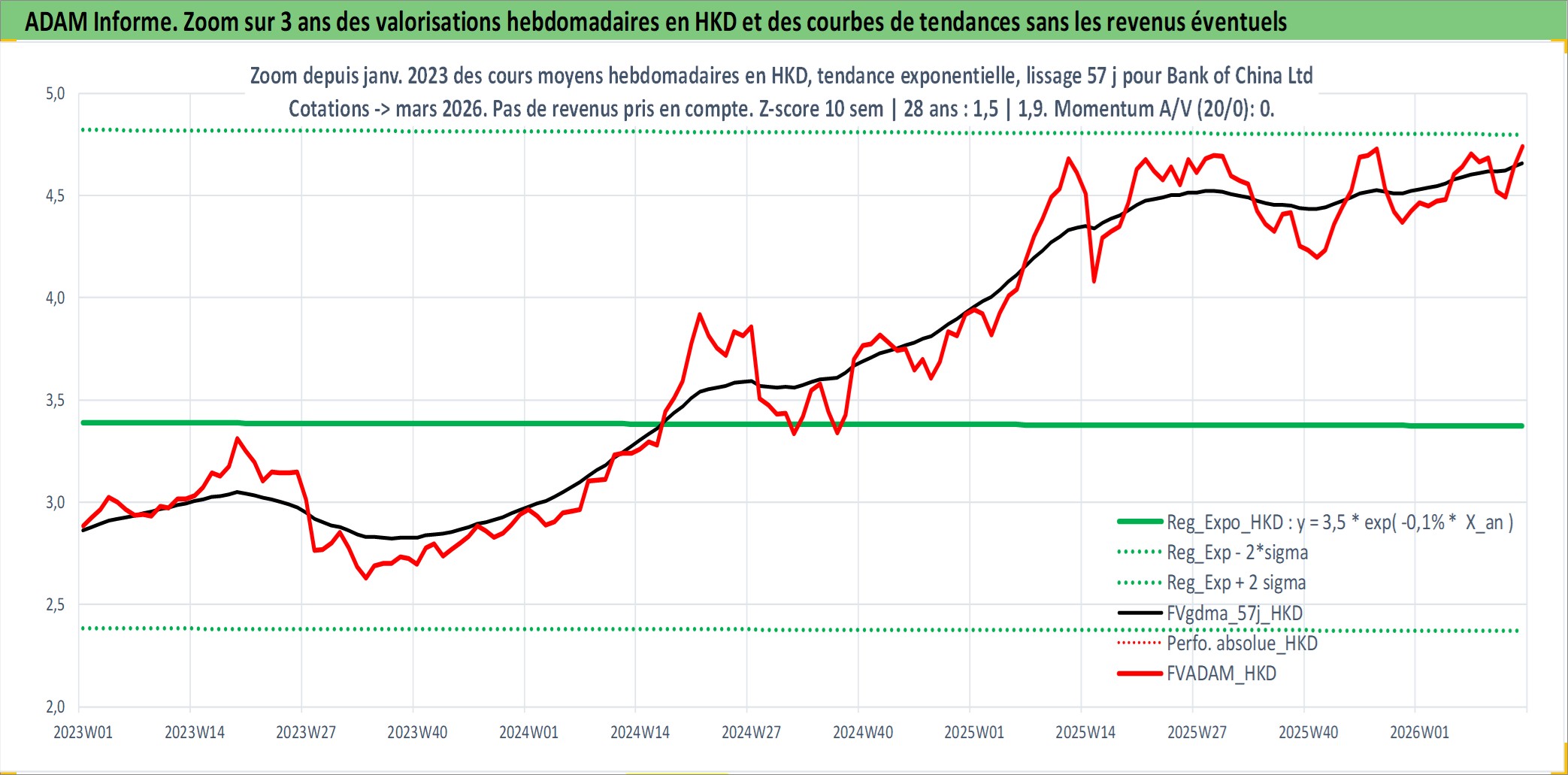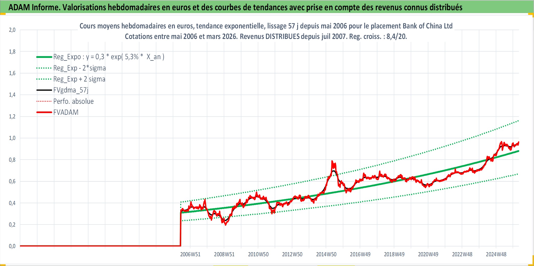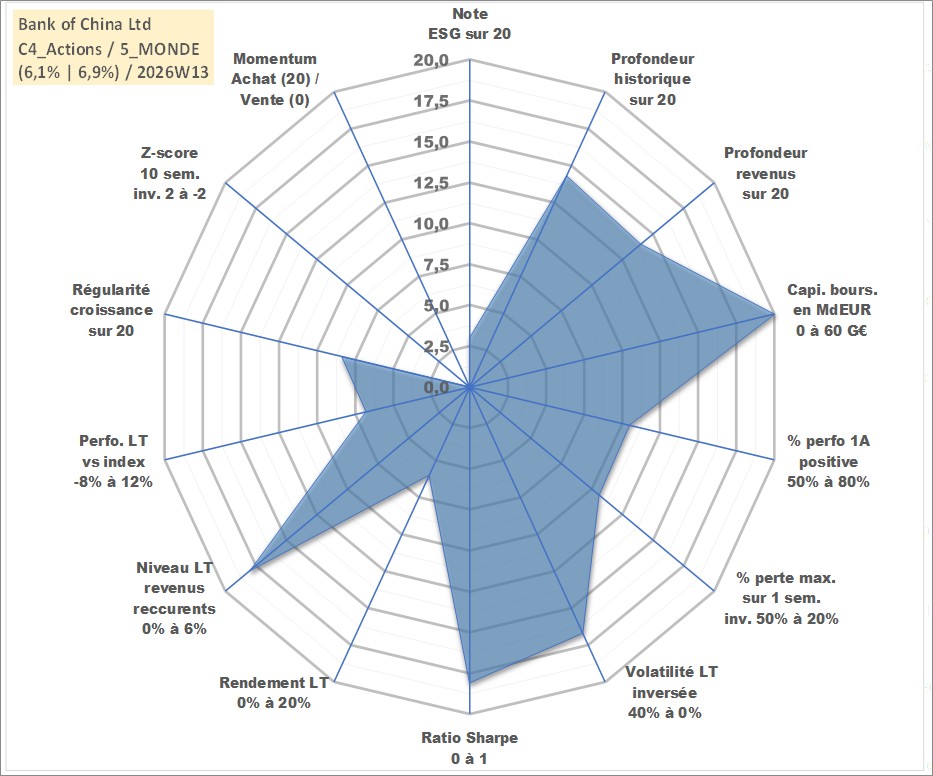 Site dédié aux investisseursPage dédiée sur site financeAnalyse des valorisations hebdomadaires de l'action Bank of China Ltd. Cet actif est cote en HKD. Les valorisations sont en contrevaleur EURO et couvrent les semaines 2006W22 a 2026W13. Les revenus de cet actif financier sont pris en compte depuis la semaine 2007W27. La note globale ESG de cet actif est estimee a 3.0 (apres rebasage entre 0 et 20).