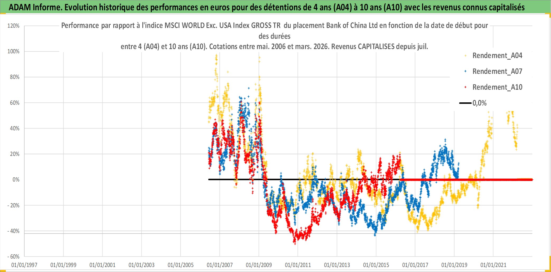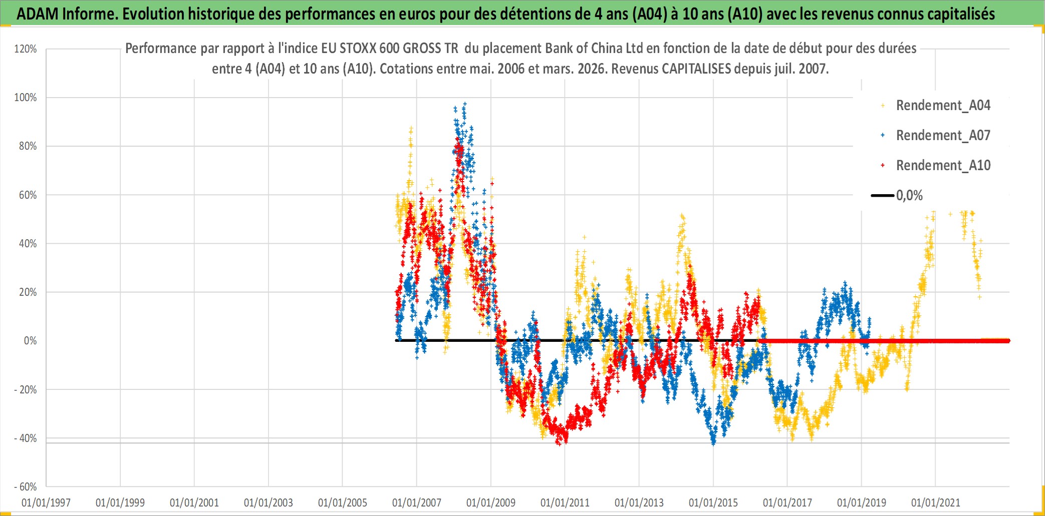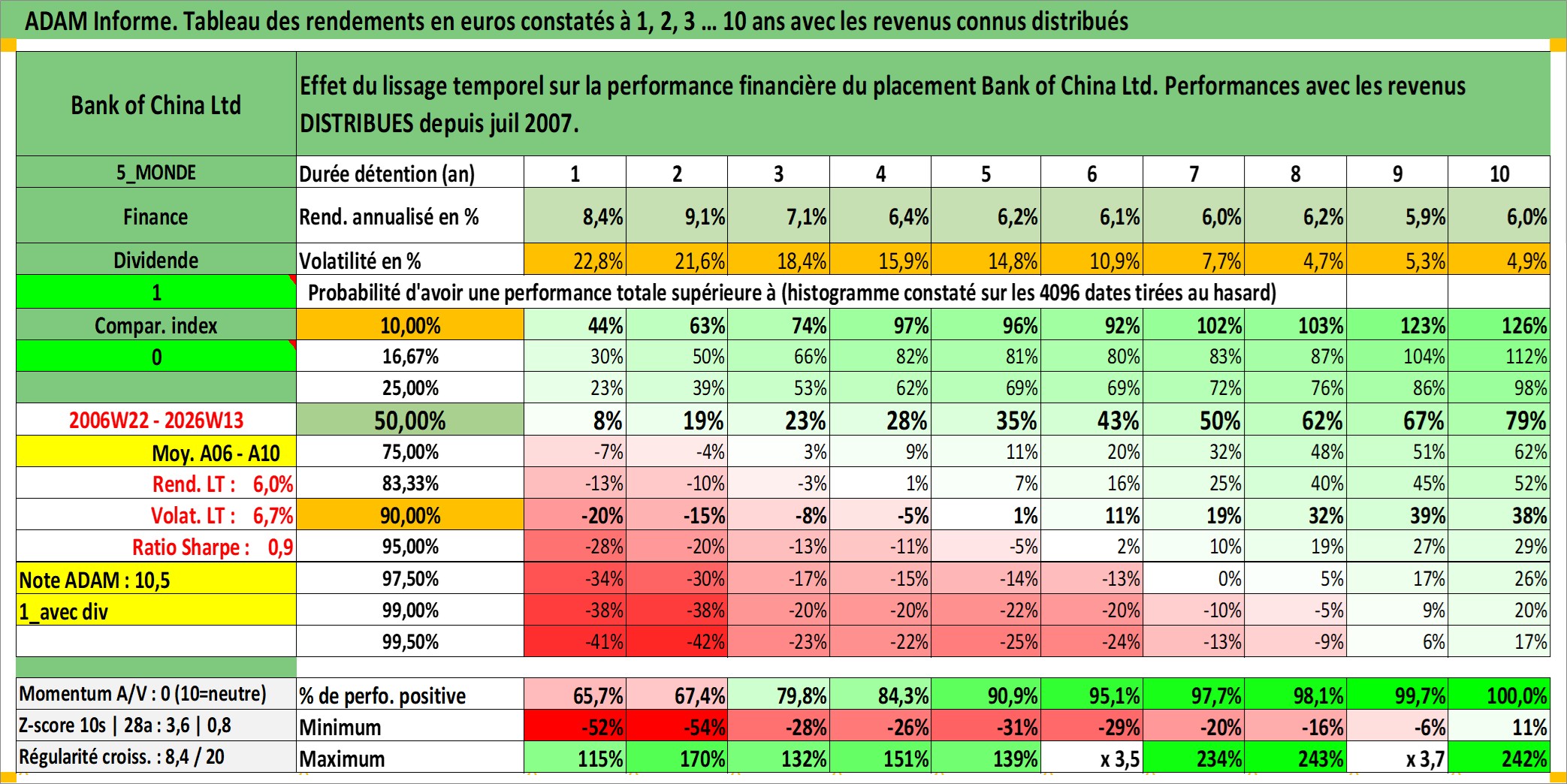 Site dédié aux investisseursPage dédiée sur site financeAnalyse des valorisations hebdomadaires de l'action Bank of China Ltd. Cet actif est cote en HKD. Les valorisations sont en contrevaleur EURO et couvrent les semaines 2006W22 a 2026W13. Les revenus de cet actif financier sont pris en compte depuis la semaine 2007W27. La note globale ESG de cet actif est estimee a 3.0 (apres rebasage entre 0 et 20).