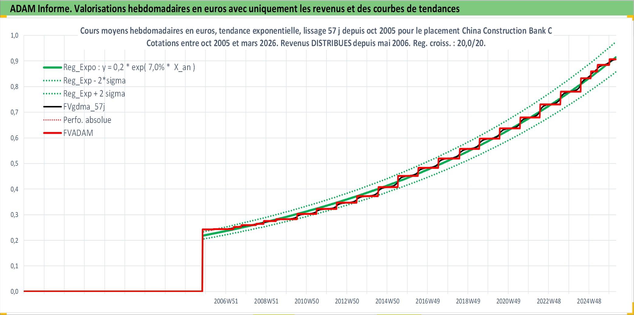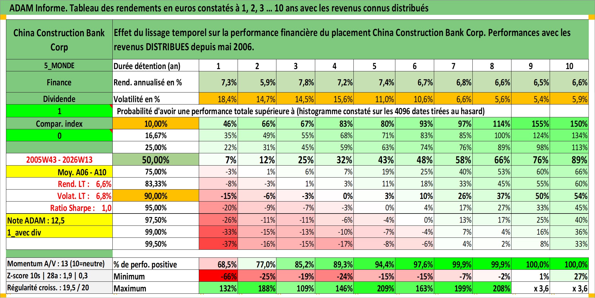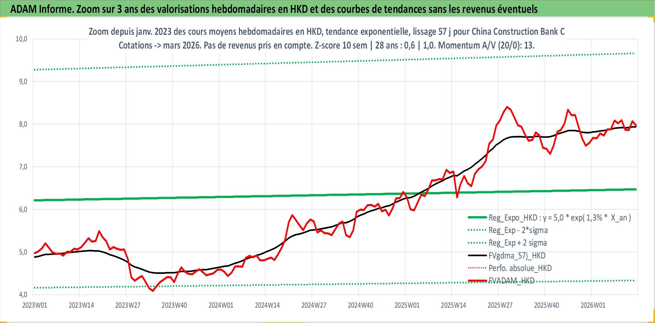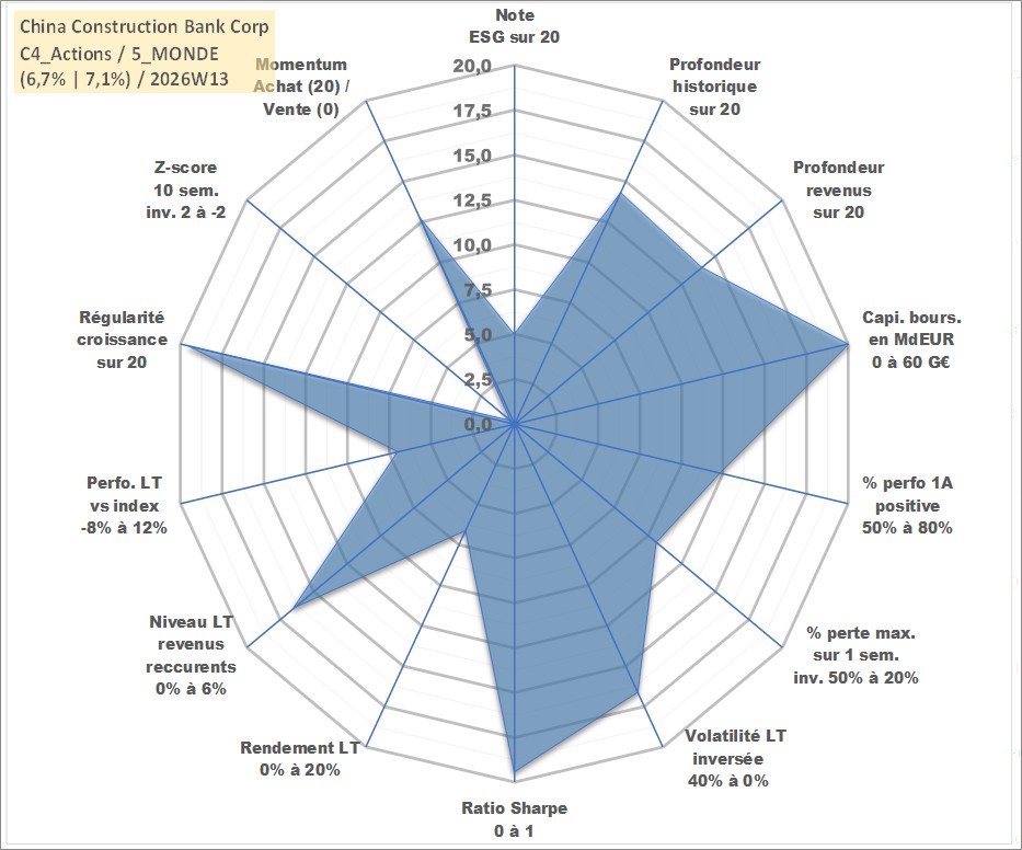 Site dédié aux investisseursPage dédiée sur site financeAnalyse des valorisations hebdomadaires de l'action China Construction Bank Corp. Cet actif est cote en HKD. Les valorisations sont en contrevaleur EURO et couvrent les semaines 2005W43 a 2026W13. Les revenus de cet actif financier sont pris en compte depuis la semaine 2006W19. La note globale ESG de cet actif est estimee a 5.0 (apres rebasage entre 0 et 20).