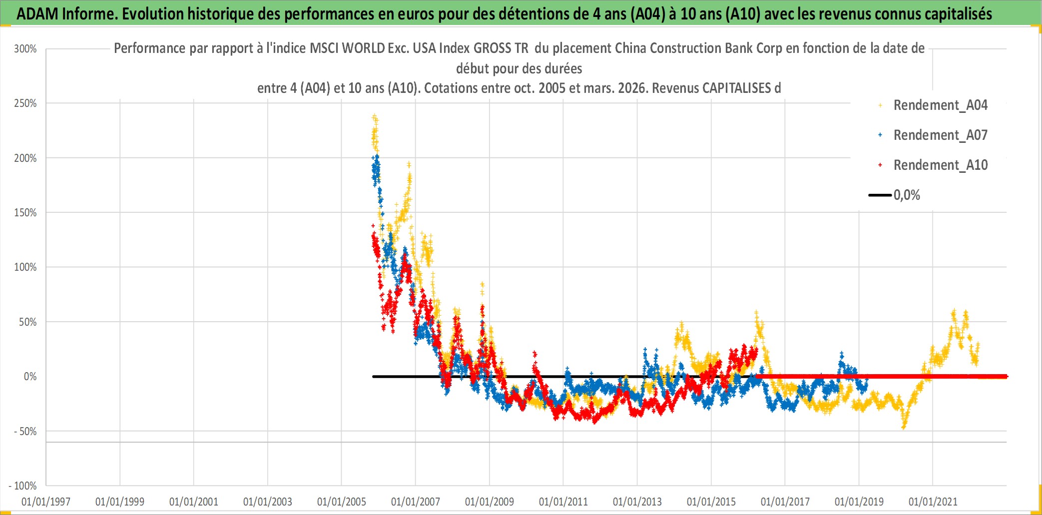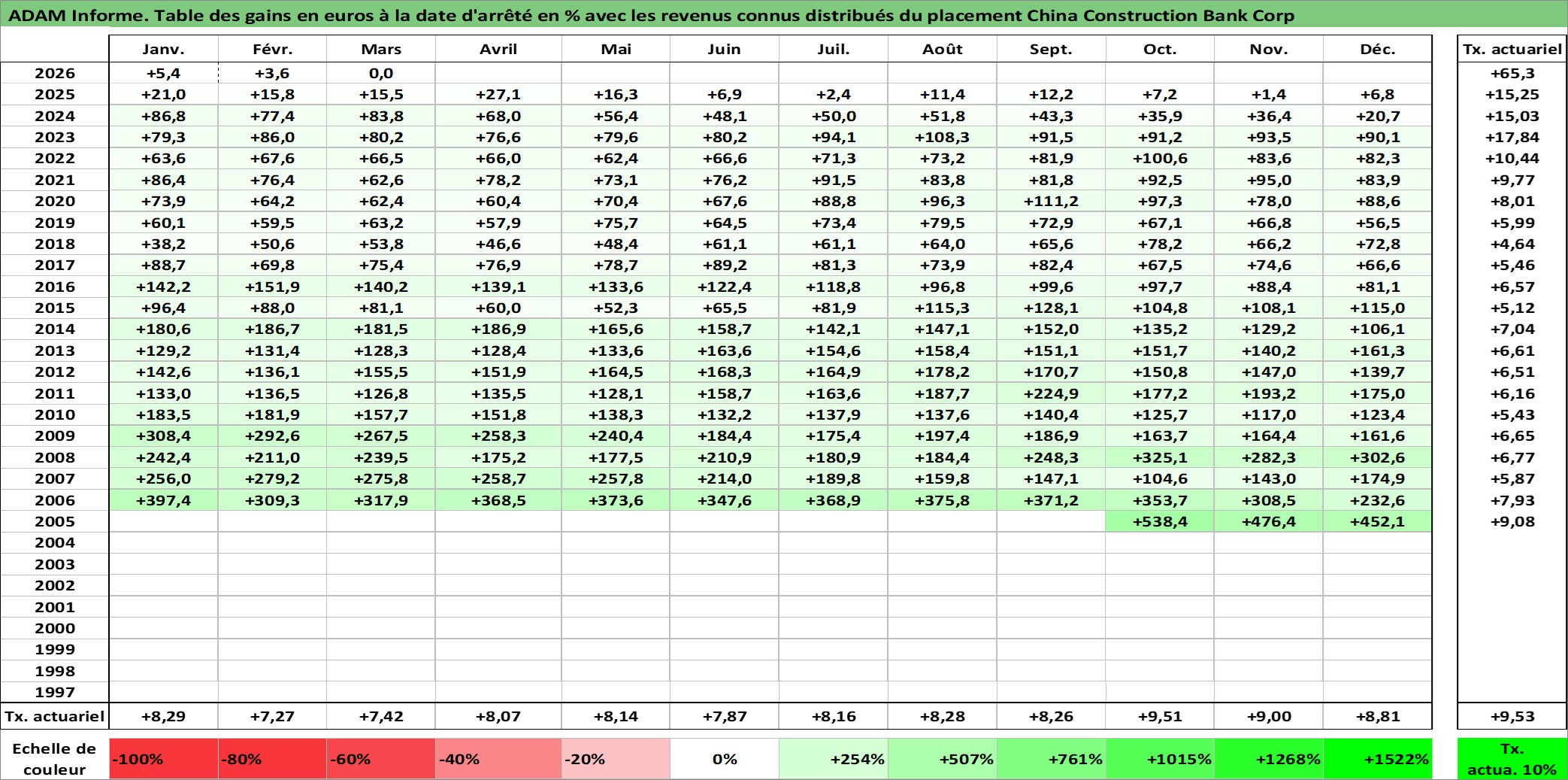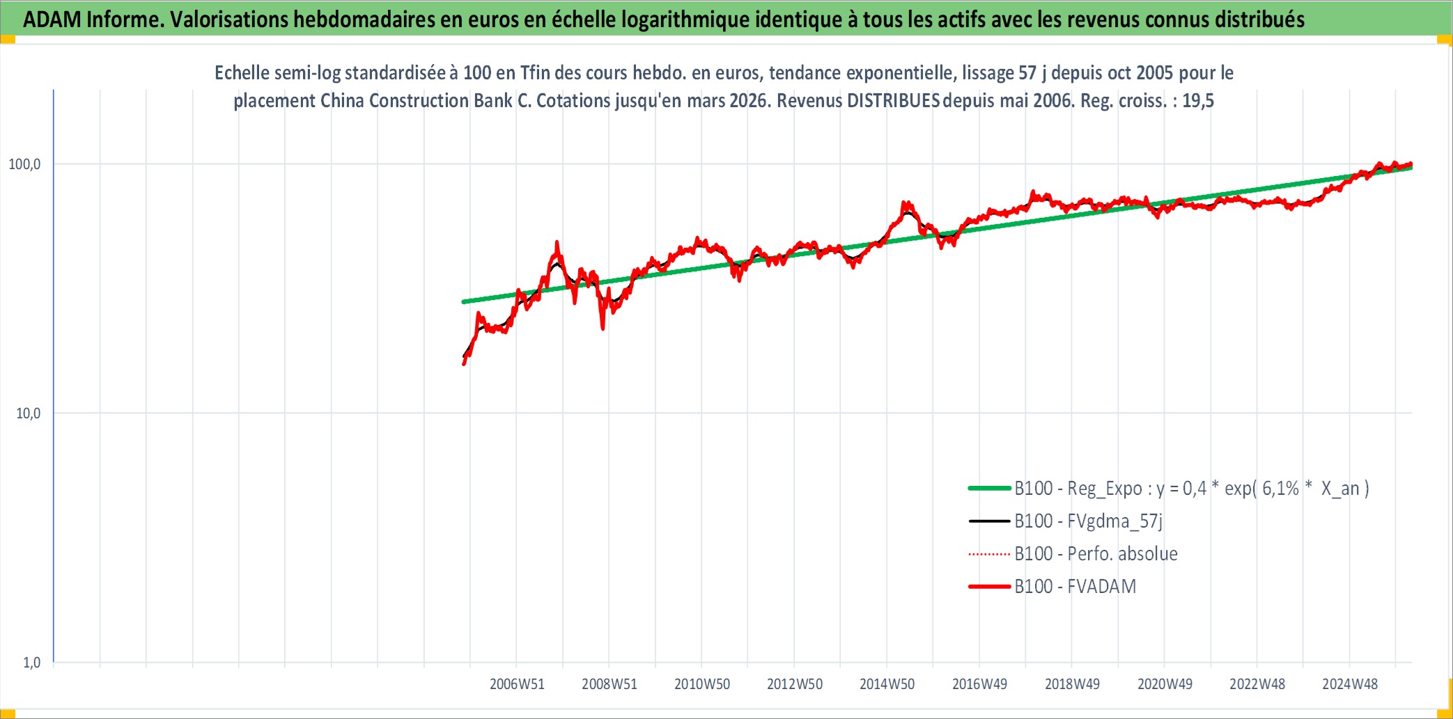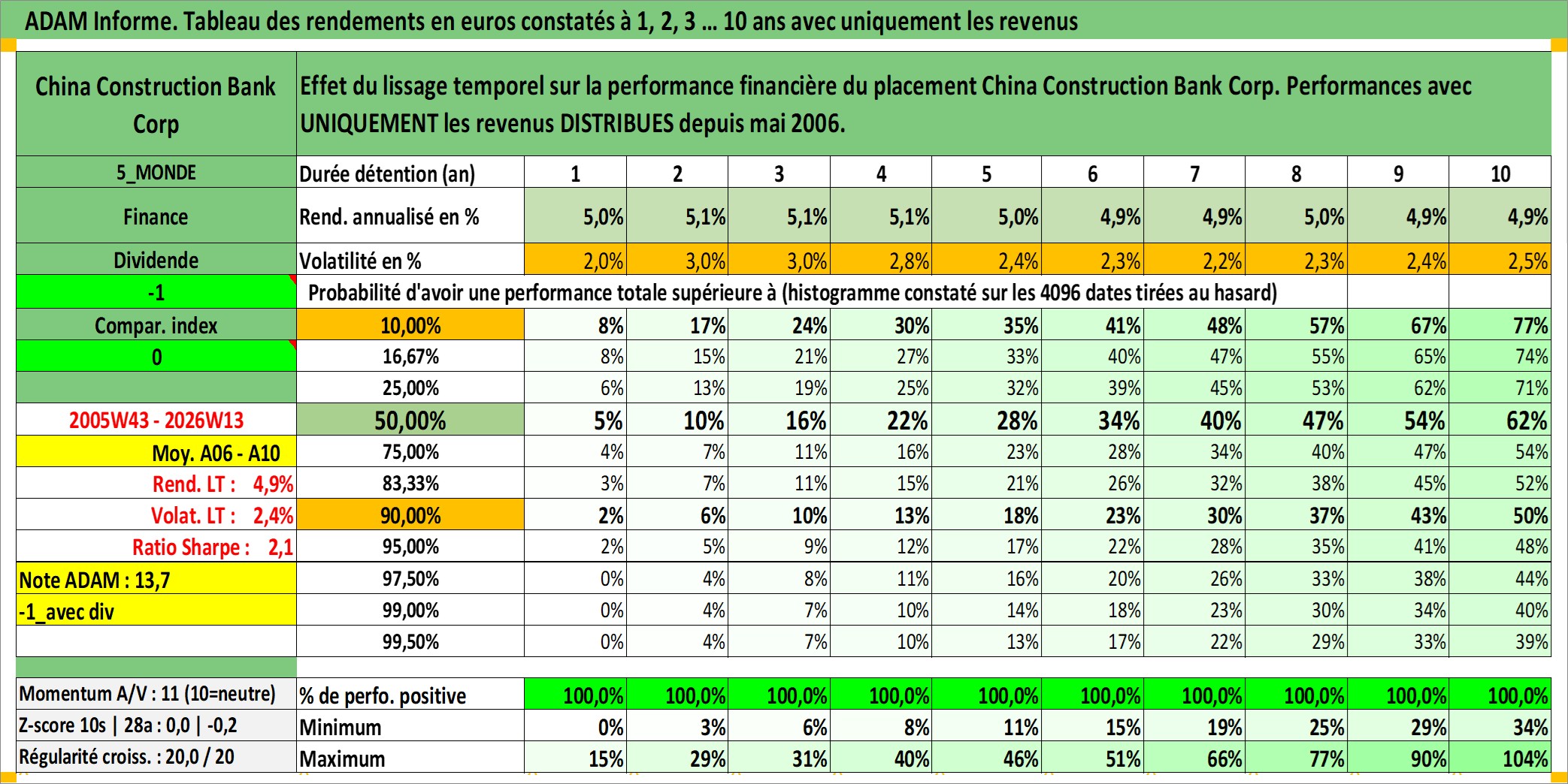 Site dédié aux investisseursPage dédiée sur site financeAnalyse des valorisations hebdomadaires de l'action China Construction Bank Corp. Cet actif est cote en HKD. Les valorisations sont en contrevaleur EURO et couvrent les semaines 2005W43 a 2026W13. Les revenus de cet actif financier sont pris en compte depuis la semaine 2006W19. La note globale ESG de cet actif est estimee a 5.0 (apres rebasage entre 0 et 20).