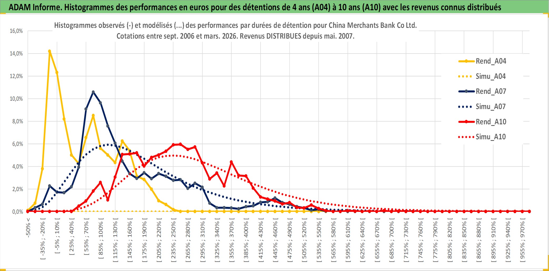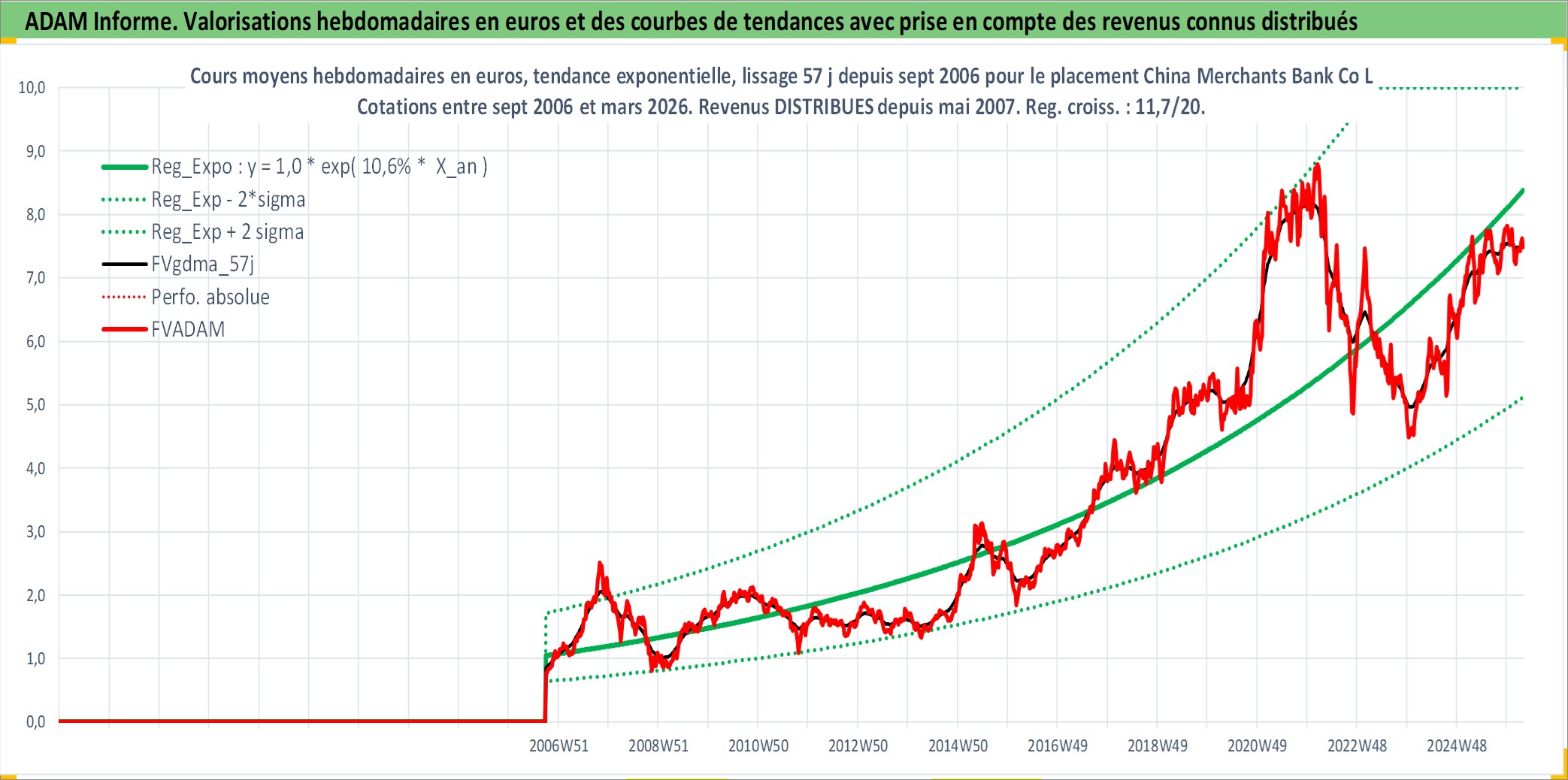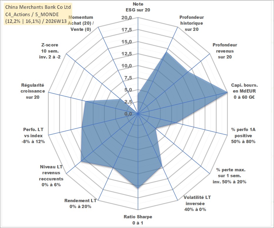 Site dédié aux investisseursPage dédiée sur site financeAnalyse des valorisations hebdomadaires de l'action China Merchants Bank Co Ltd. Cet actif est cote en HKD. Les valorisations sont en contrevaleur EURO et couvrent les semaines 2006W38 a 2026W13. Les revenus de cet actif financier sont pris en compte depuis la semaine 2007W20. La note globale ESG de cet actif est estimee a 4.0 (apres rebasage entre 0 et 20).