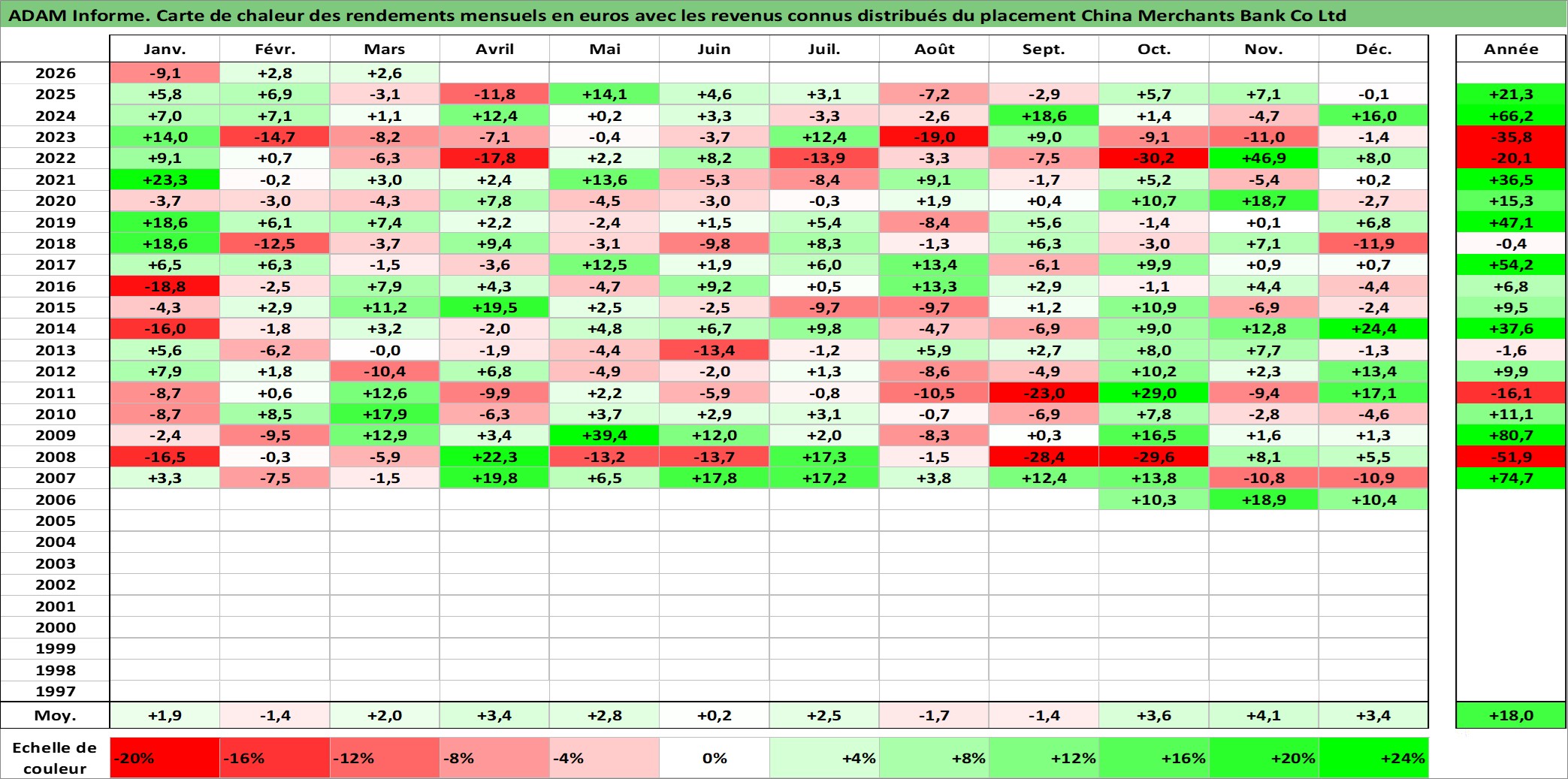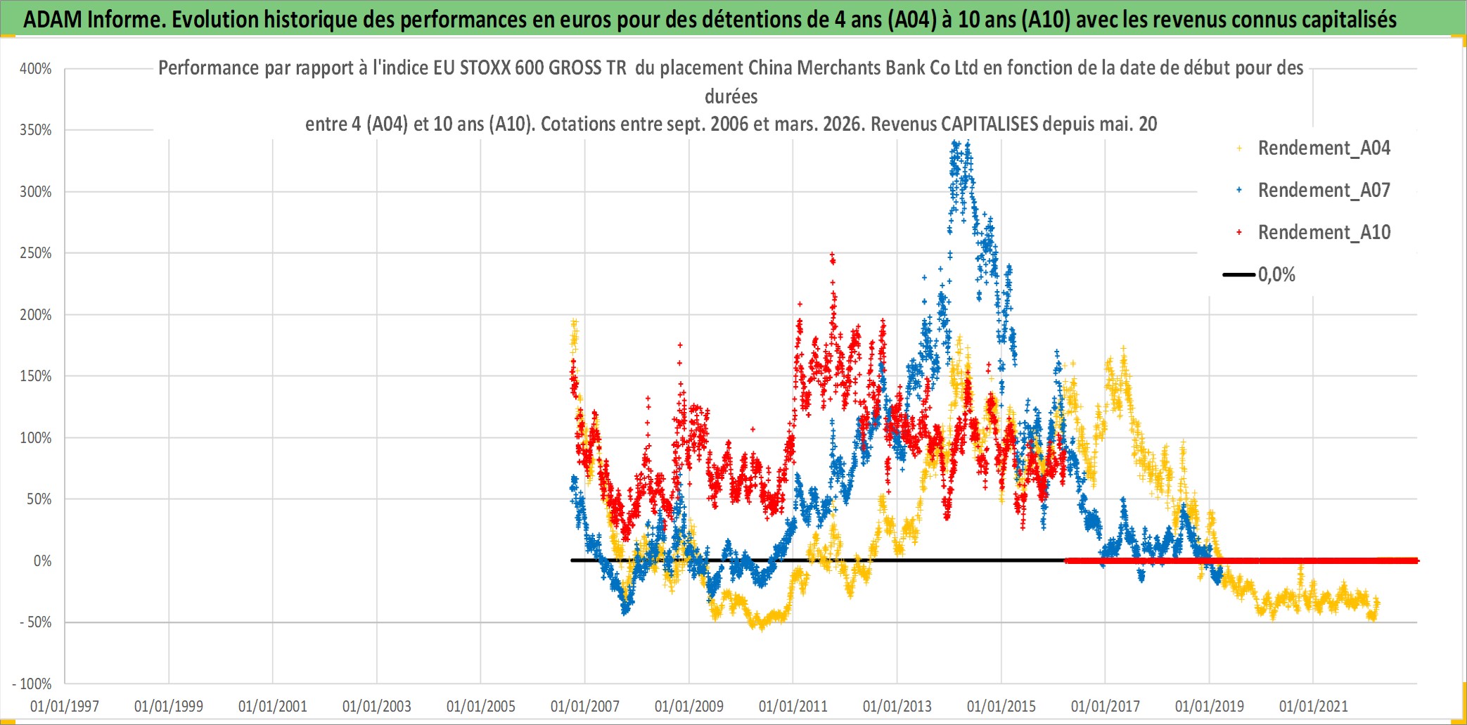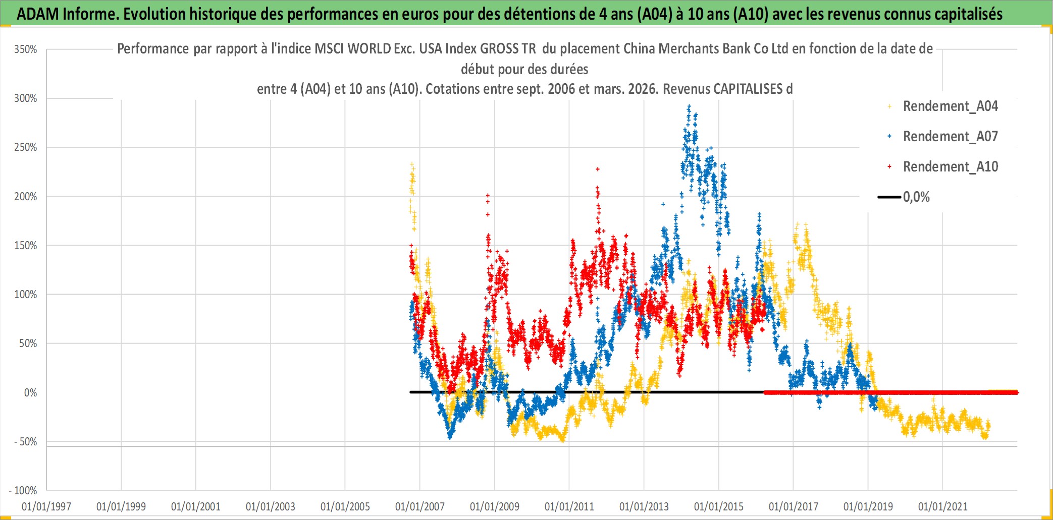 Site dédié aux investisseursPage dédiée sur site financeAnalyse des valorisations hebdomadaires de l'action China Merchants Bank Co Ltd. Cet actif est cote en HKD. Les valorisations sont en contrevaleur EURO et couvrent les semaines 2006W38 a 2026W13. Les revenus de cet actif financier sont pris en compte depuis la semaine 2007W20. La note globale ESG de cet actif est estimee a 4.0 (apres rebasage entre 0 et 20).
