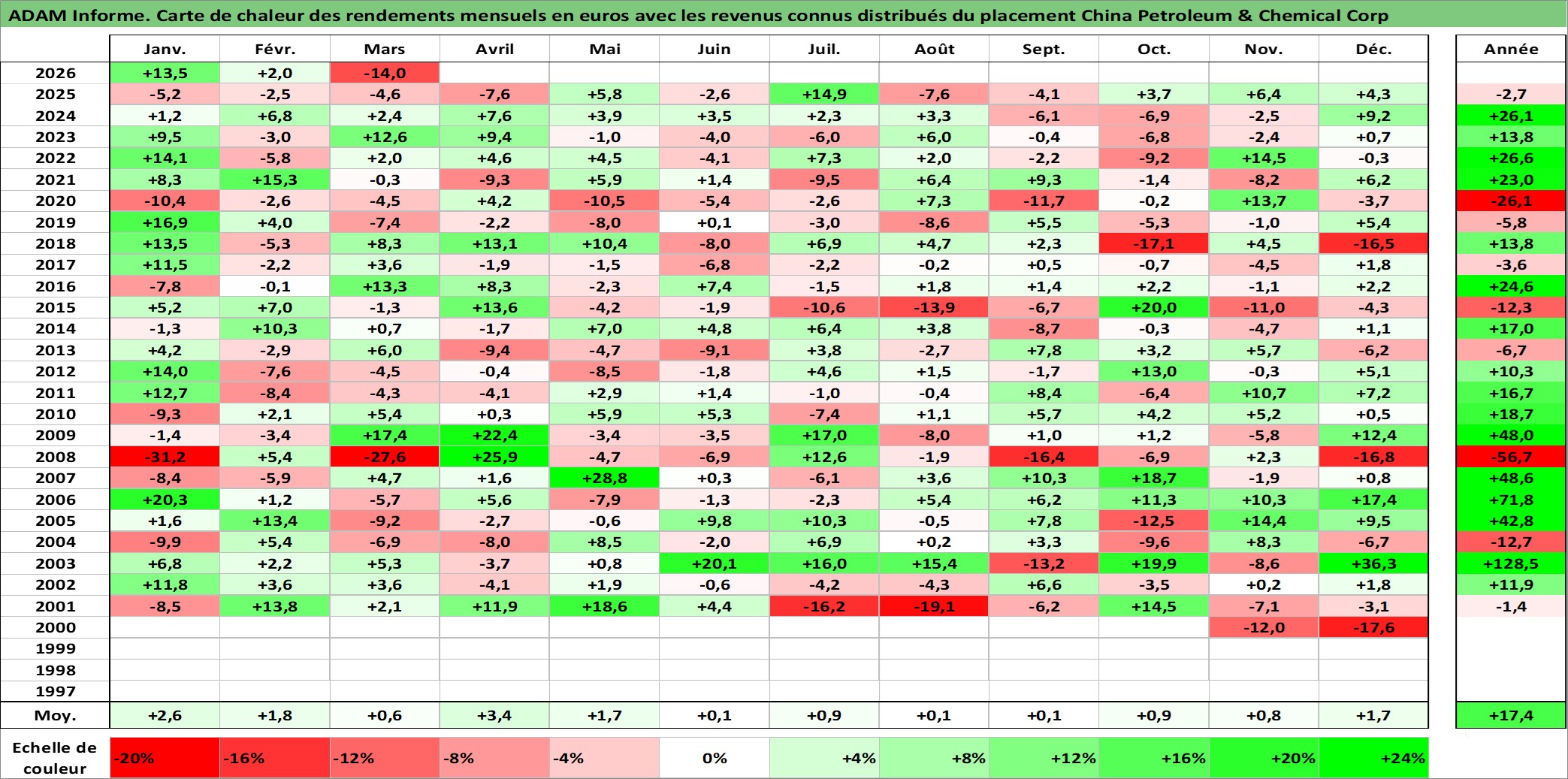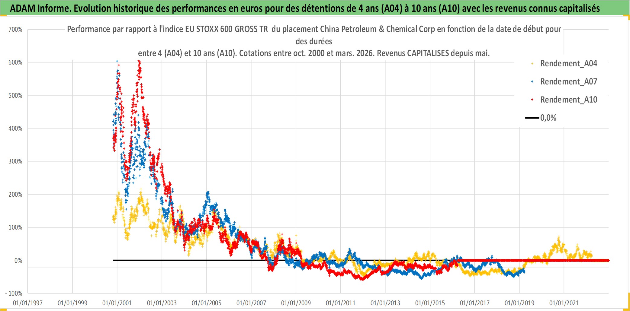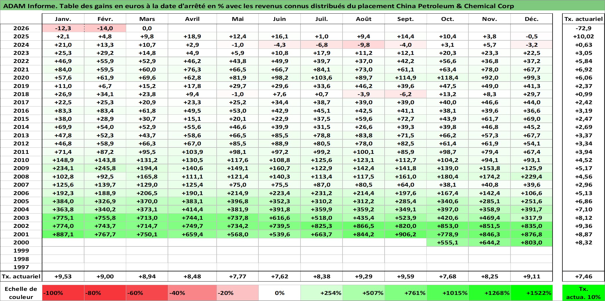 Site dédié aux investisseursPage dédiée sur site financeAnalyse des valorisations hebdomadaires de l'action China Petroleum & Chemical Corp. Cet actif est cote en HKD. Les valorisations sont en contrevaleur EURO et couvrent les semaines 2000W42 a 2026W13. Les revenus de cet actif financier sont pris en compte depuis la semaine 2001W18. La note ESG de cet actif n'est pas connue.