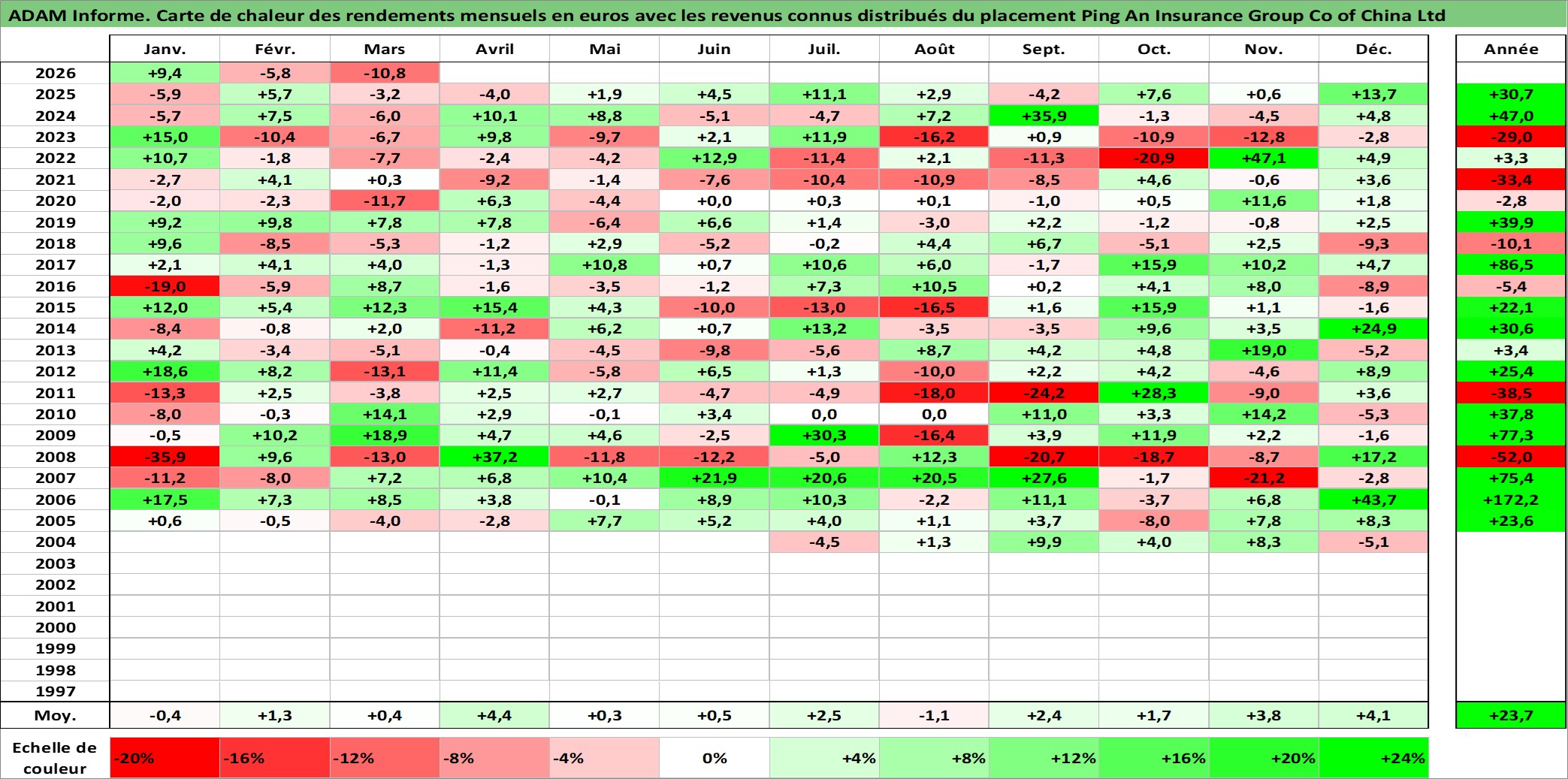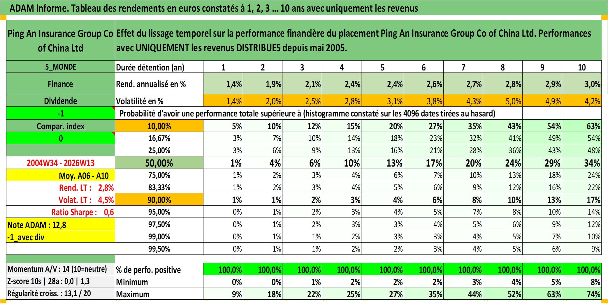 Site dédié aux investisseursPage dédiée sur site financeAnalyse des valorisations hebdomadaires de l'action Ping An Insurance Group Co of China Ltd. Cet actif est cote en HKD. Les valorisations sont en contrevaleur EURO et couvrent les semaines 2004W34 a 2026W13. Les revenus de cet actif financier sont pris en compte depuis la semaine 2005W20. La note globale ESG de cet actif est estimee a 11.0 (apres rebasage entre 0 et 20).