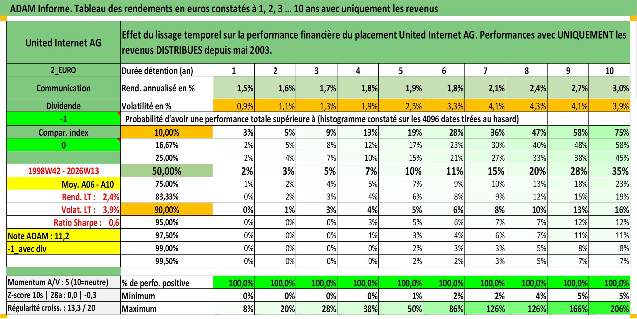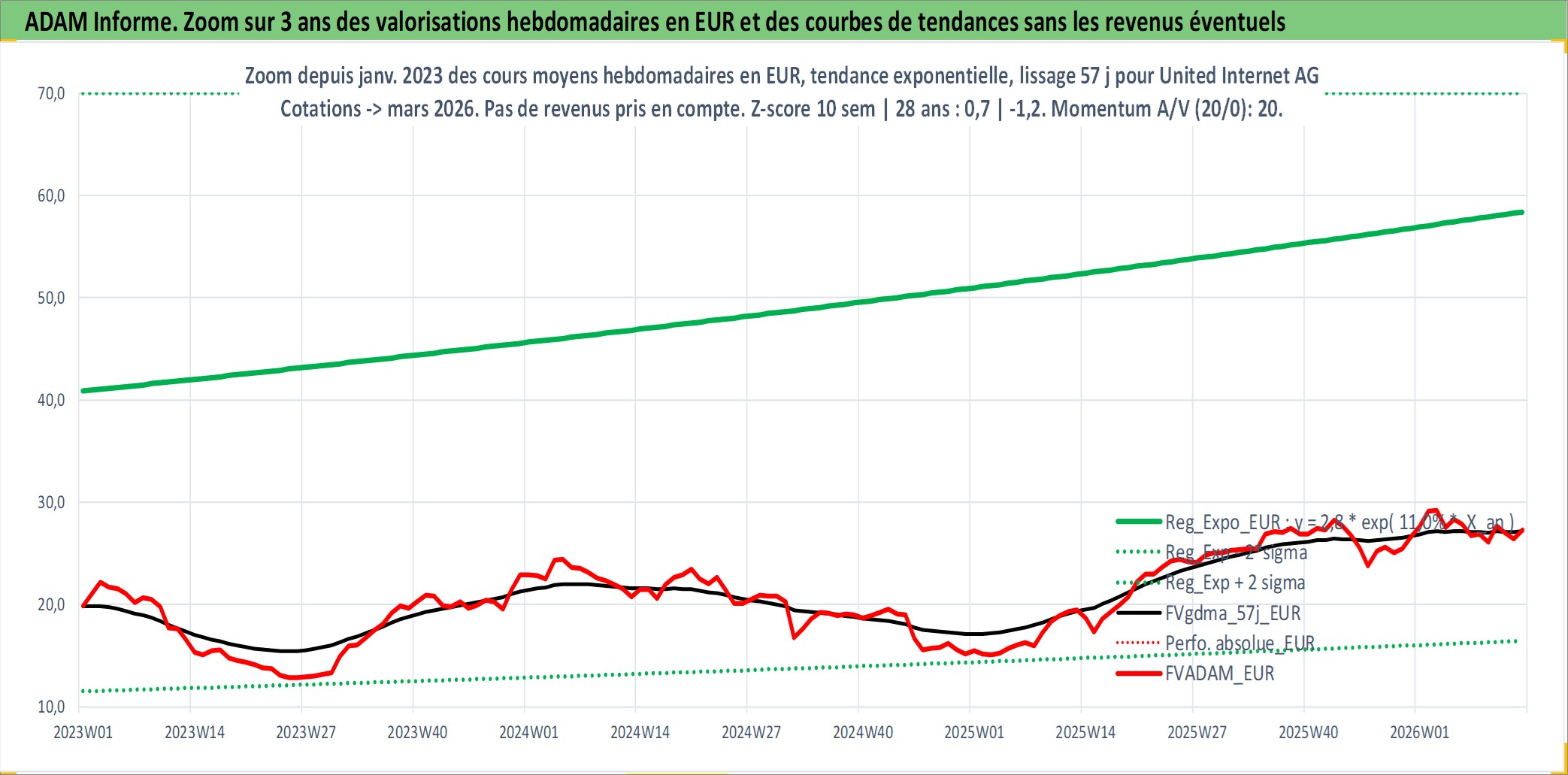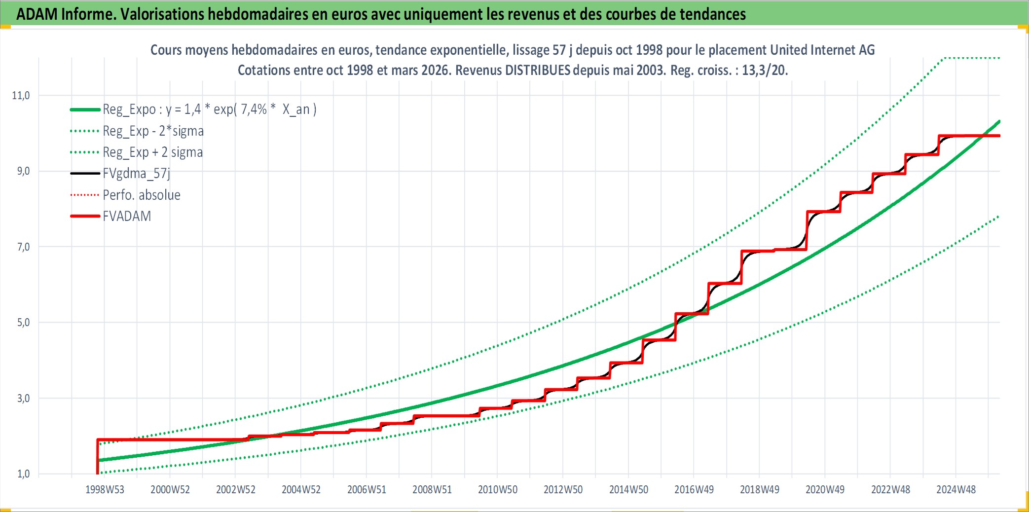 Site dédié aux investisseursPage dédiée sur site financeAnalyse des valorisations hebdomadaires de l'action United Internet AG. Cet actif est cote en EUR. Les valorisations couvrent les semaines 1998W42 a 2026W13. Les revenus de cet actif financier sont pris en compte depuis la semaine 2003W21. La note globale ESG de cet actif est estimee a 9.0 (apres rebasage entre 0 et 20).