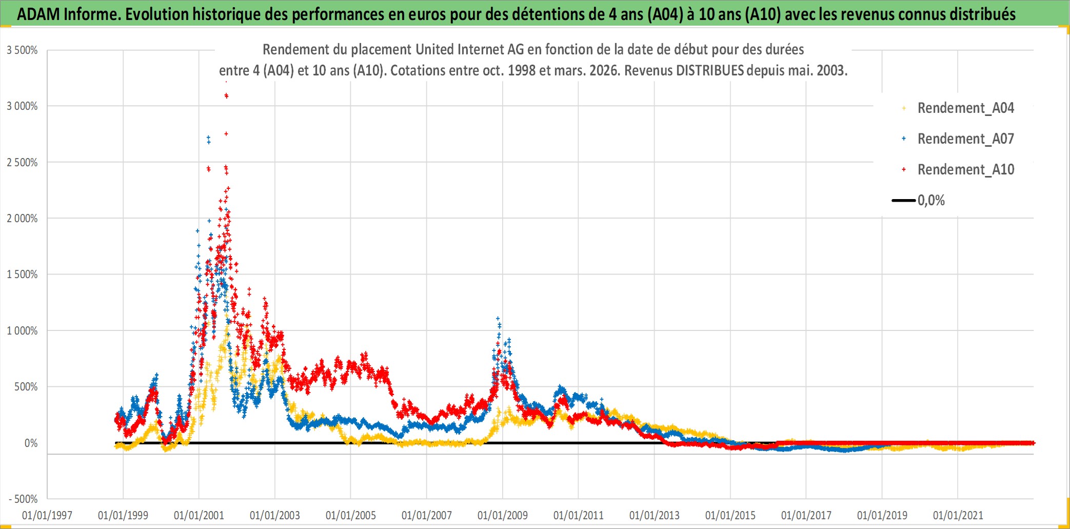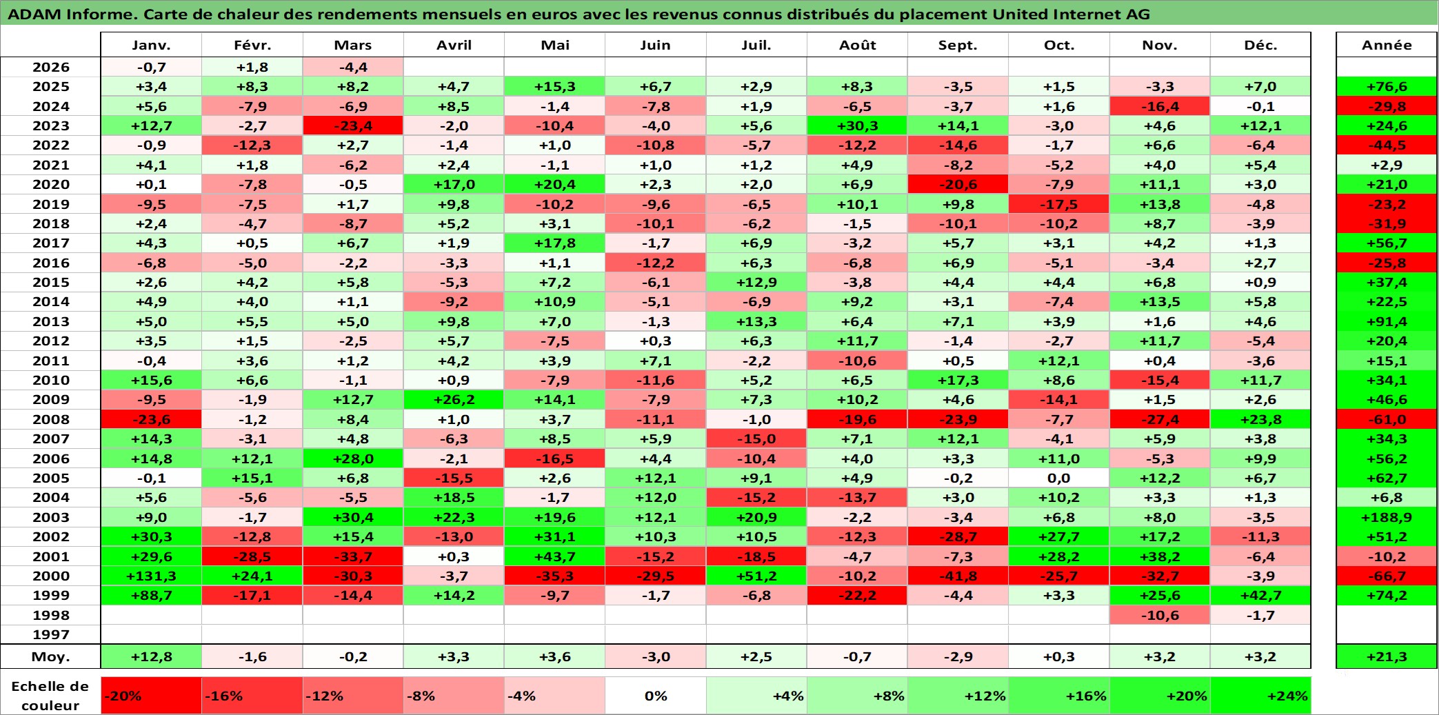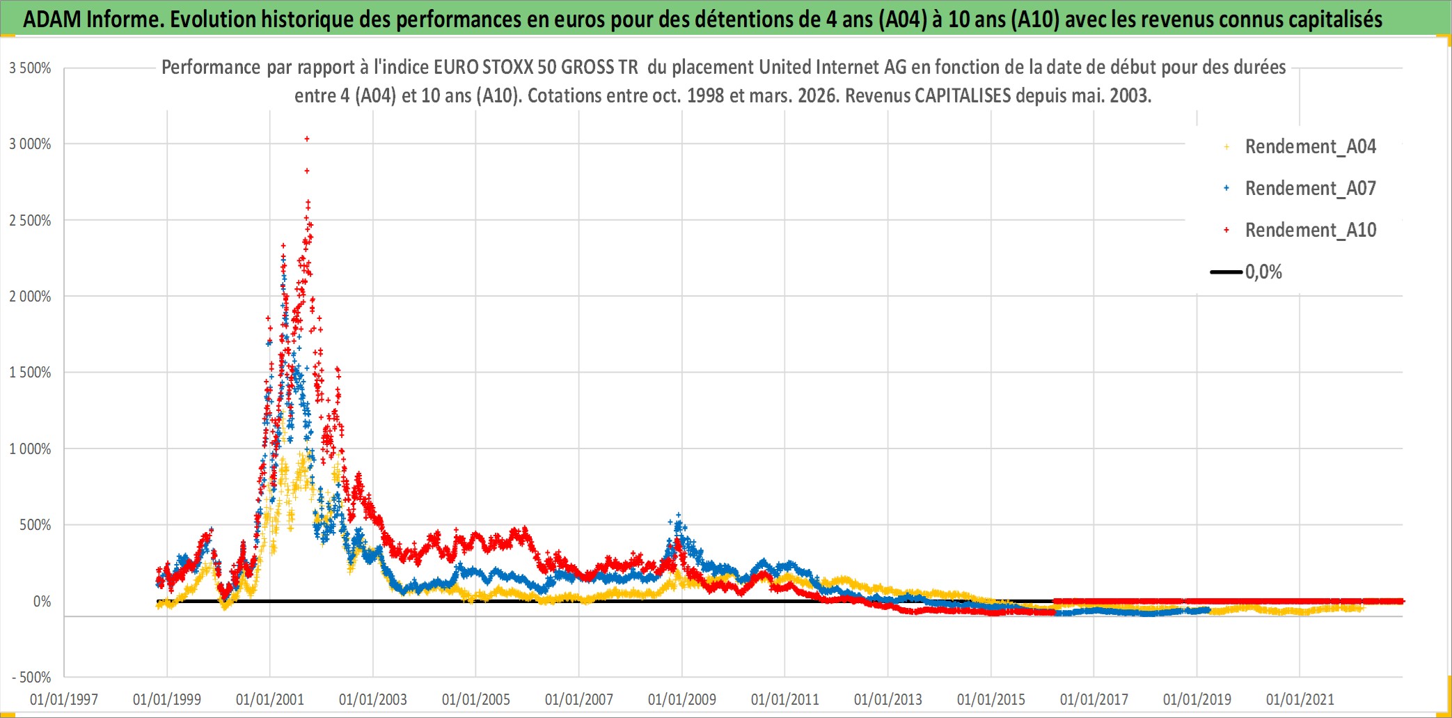 Site dédié aux investisseursPage dédiée sur site financeAnalyse des valorisations hebdomadaires de l'action United Internet AG. Cet actif est cote en EUR. Les valorisations couvrent les semaines 1998W42 a 2026W13. Les revenus de cet actif financier sont pris en compte depuis la semaine 2003W21. La note globale ESG de cet actif est estimee a 9.0 (apres rebasage entre 0 et 20).