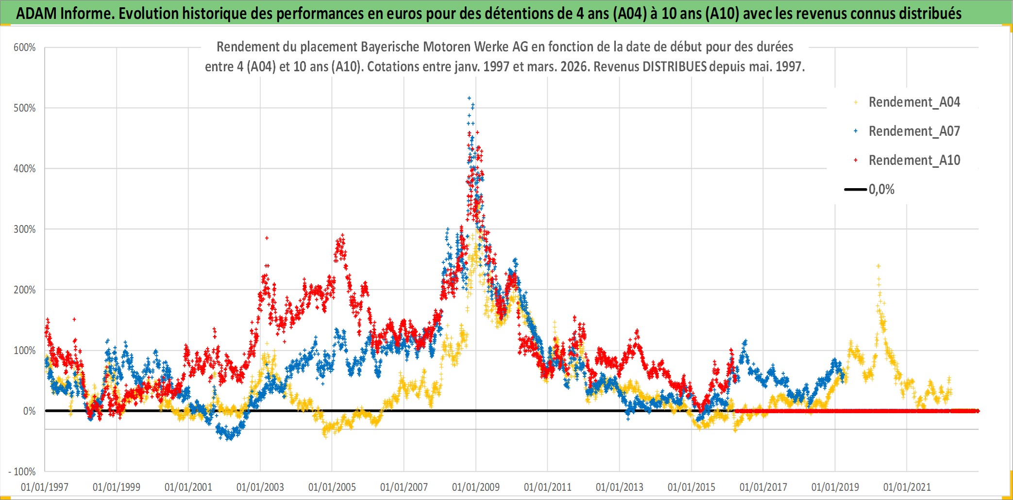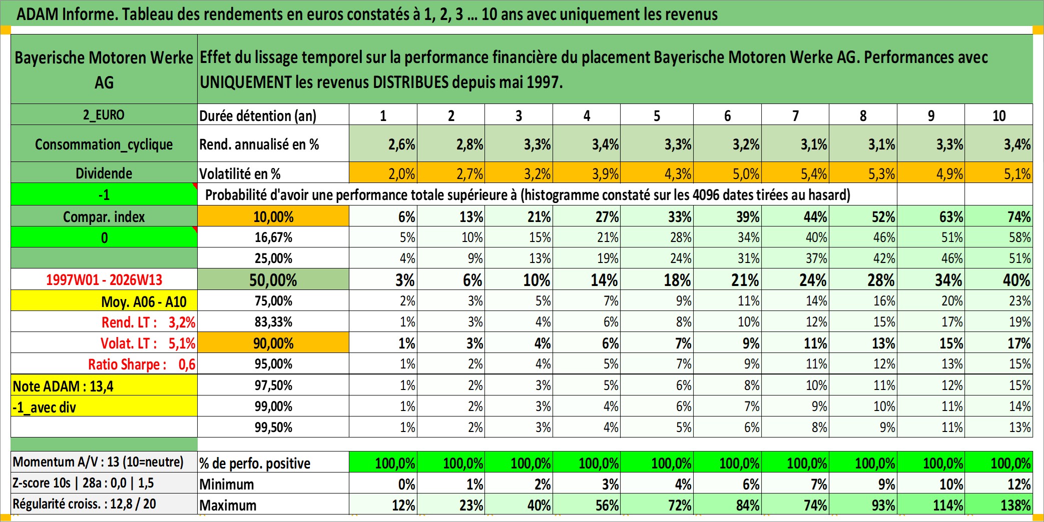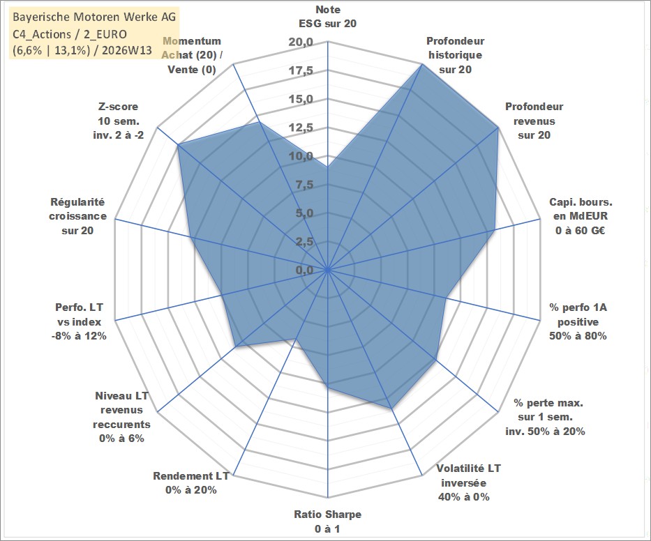 Site dédié aux investisseursPage dédiée sur site financeAnalyse des valorisations hebdomadaires de l'action Bayerische Motoren Werke AG. Cet actif est cote en EUR. Les valorisations couvrent les semaines 1997W01 a 2026W13. Les revenus de cet actif financier sont pris en compte depuis la semaine 1997W20. La note globale ESG de cet actif est estimee a 9.0 (apres rebasage entre 0 et 20).