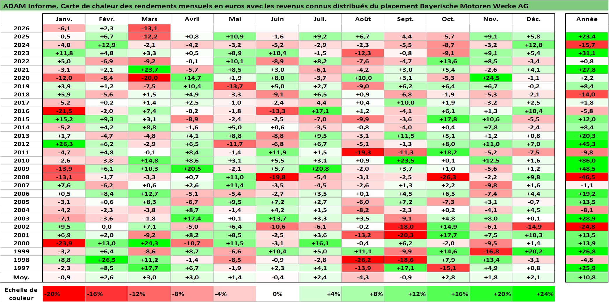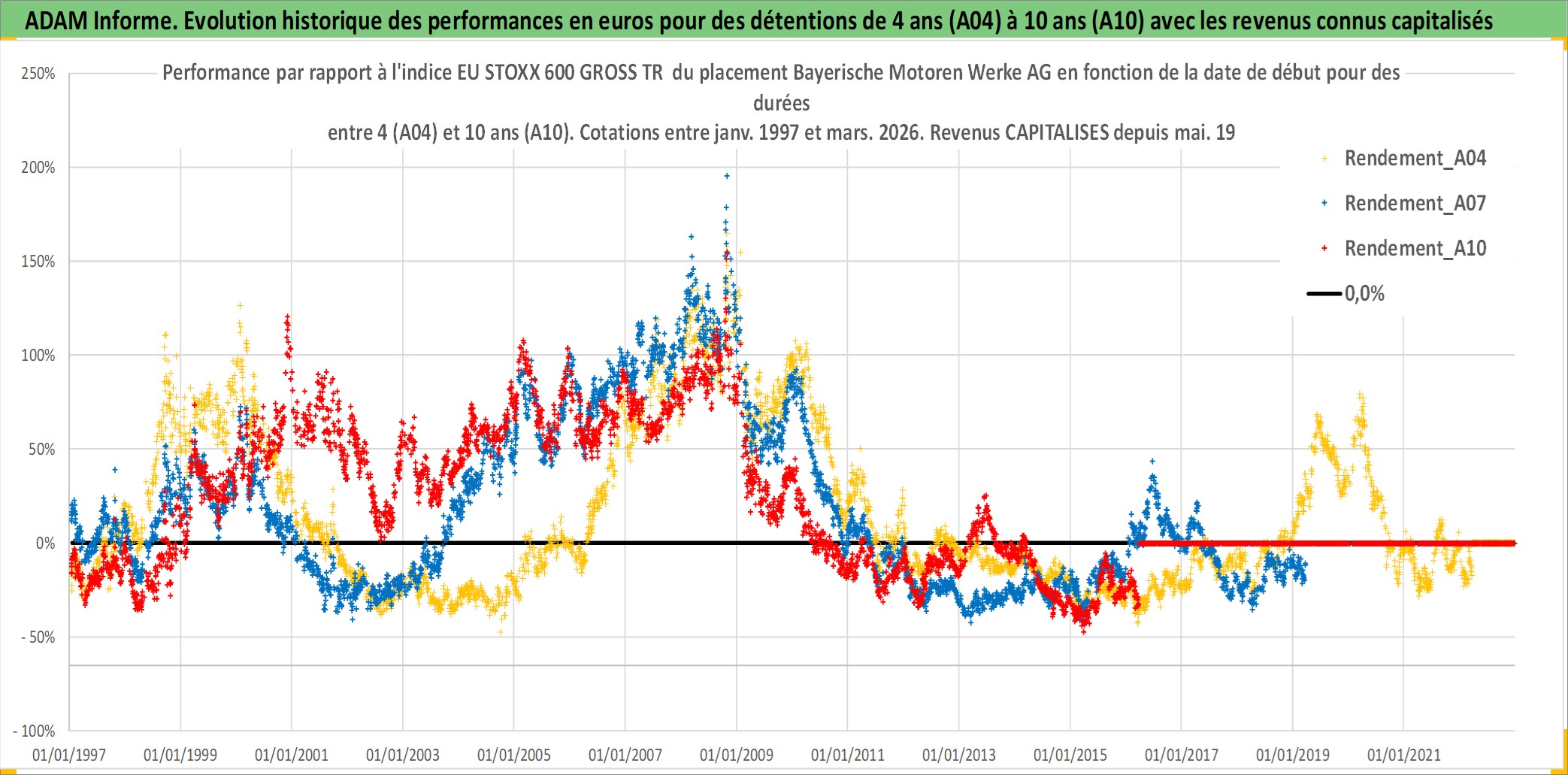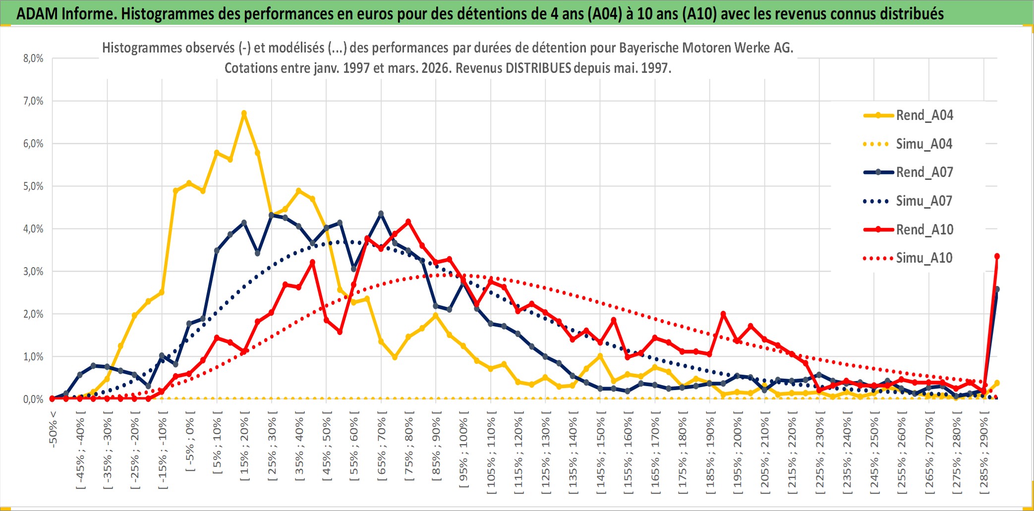Site dédié aux investisseursPage dédiée sur site financeAnalyse des valorisations hebdomadaires de l'action Bayerische Motoren Werke AG. Cet actif est cote en EUR. Les valorisations couvrent les semaines 1997W01 a 2026W13. Les revenus de cet actif financier sont pris en compte depuis la semaine 1997W20. La note globale ESG de cet actif est estimee a 9.0 (apres rebasage entre 0 et 20).