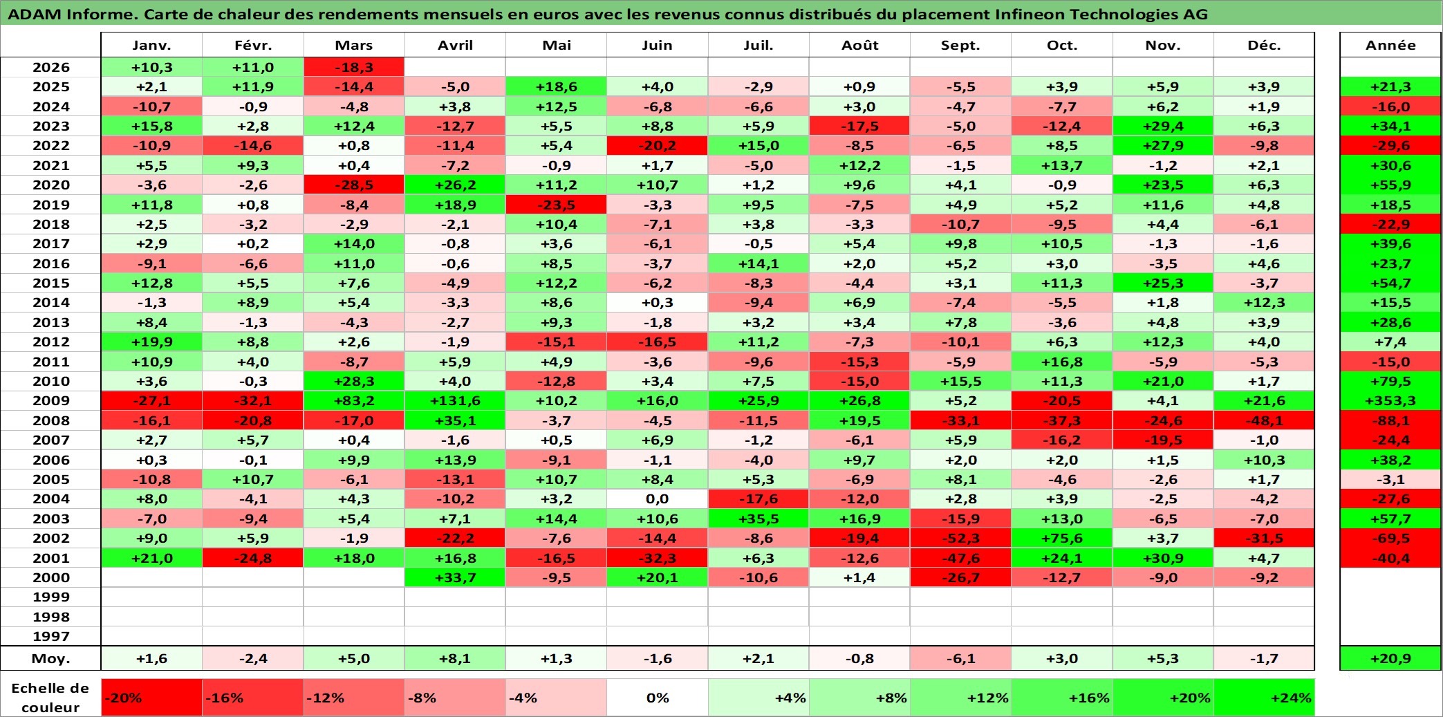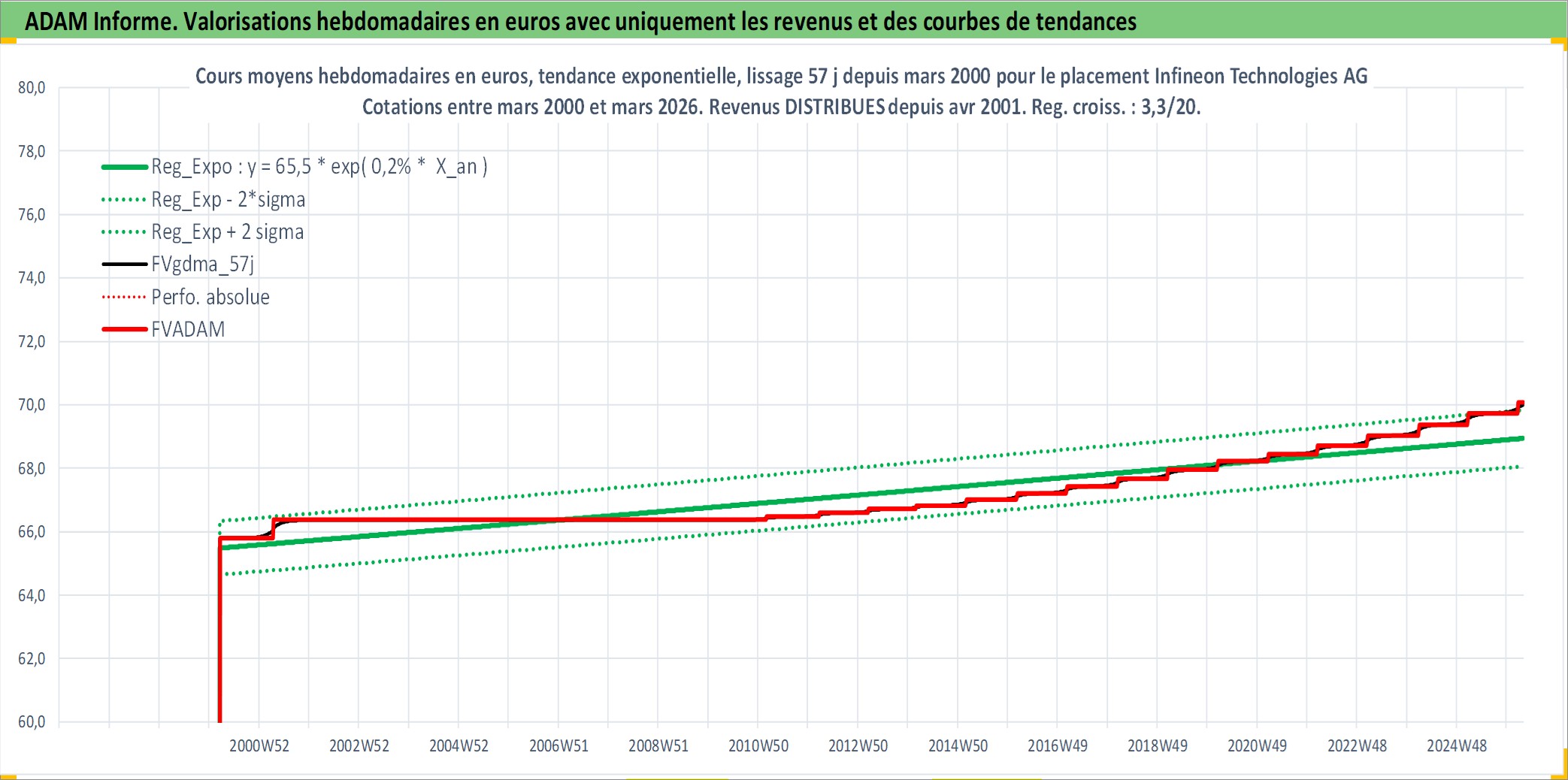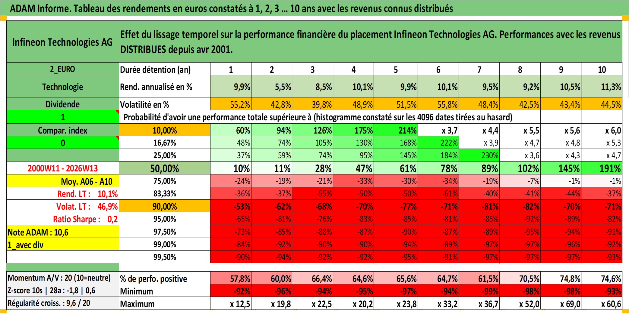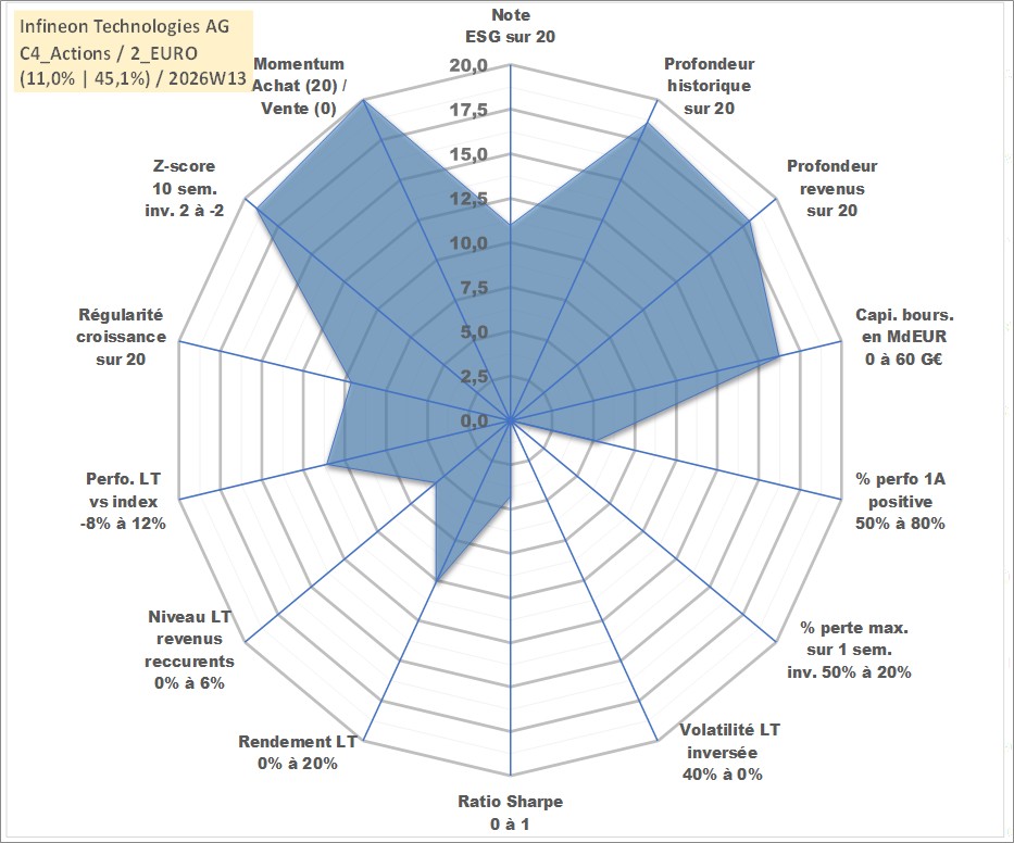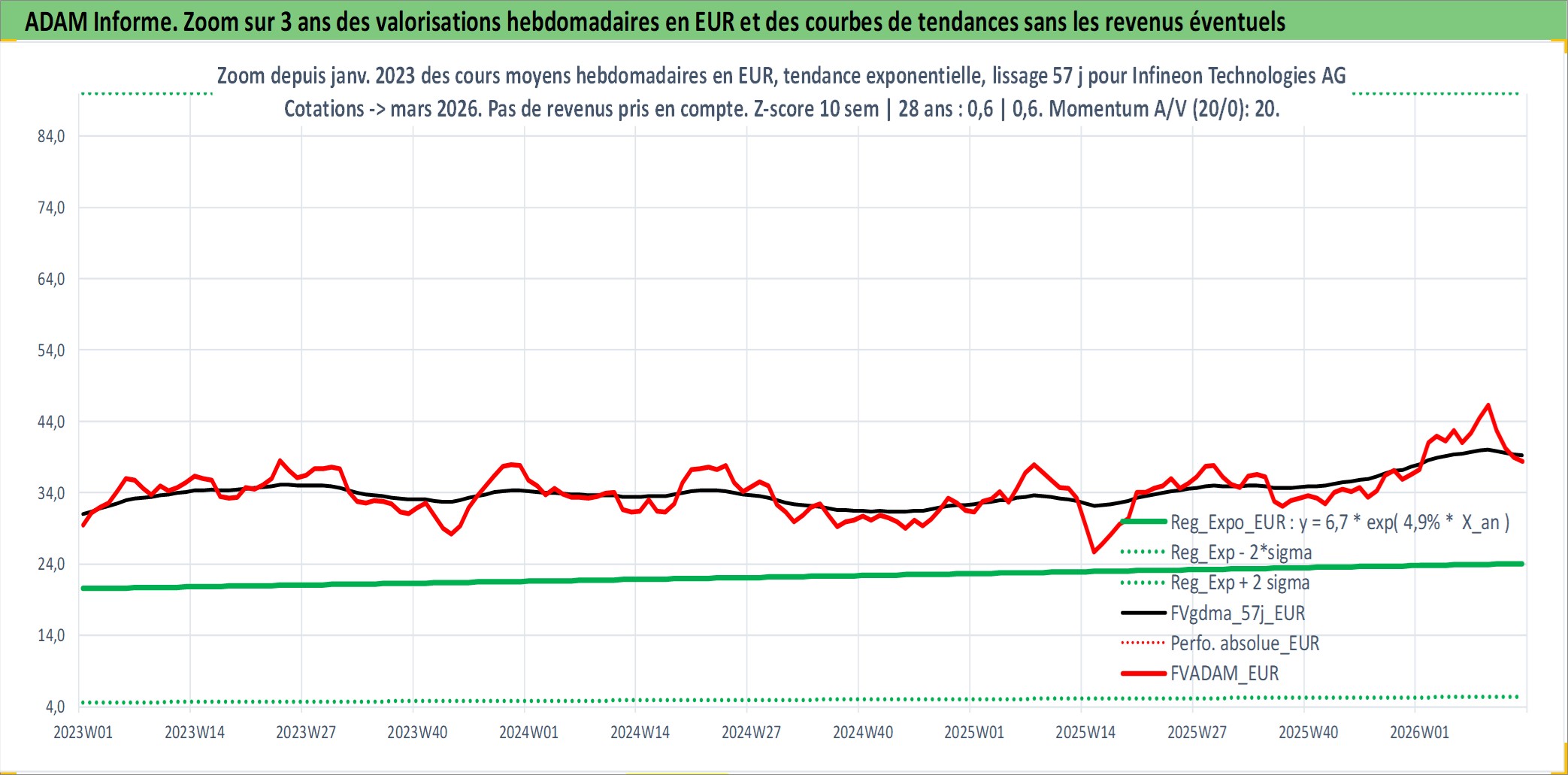 Site dédié aux investisseursPage dédiée sur site financeAnalyse des valorisations hebdomadaires de l'action Infineon Technologies AG. Cet actif est cote en EUR. Les valorisations couvrent les semaines 2000W11 a 2026W13. Les revenus de cet actif financier sont pris en compte depuis la semaine 2001W15. La note globale ESG de cet actif est estimee a 11.0 (apres rebasage entre 0 et 20).