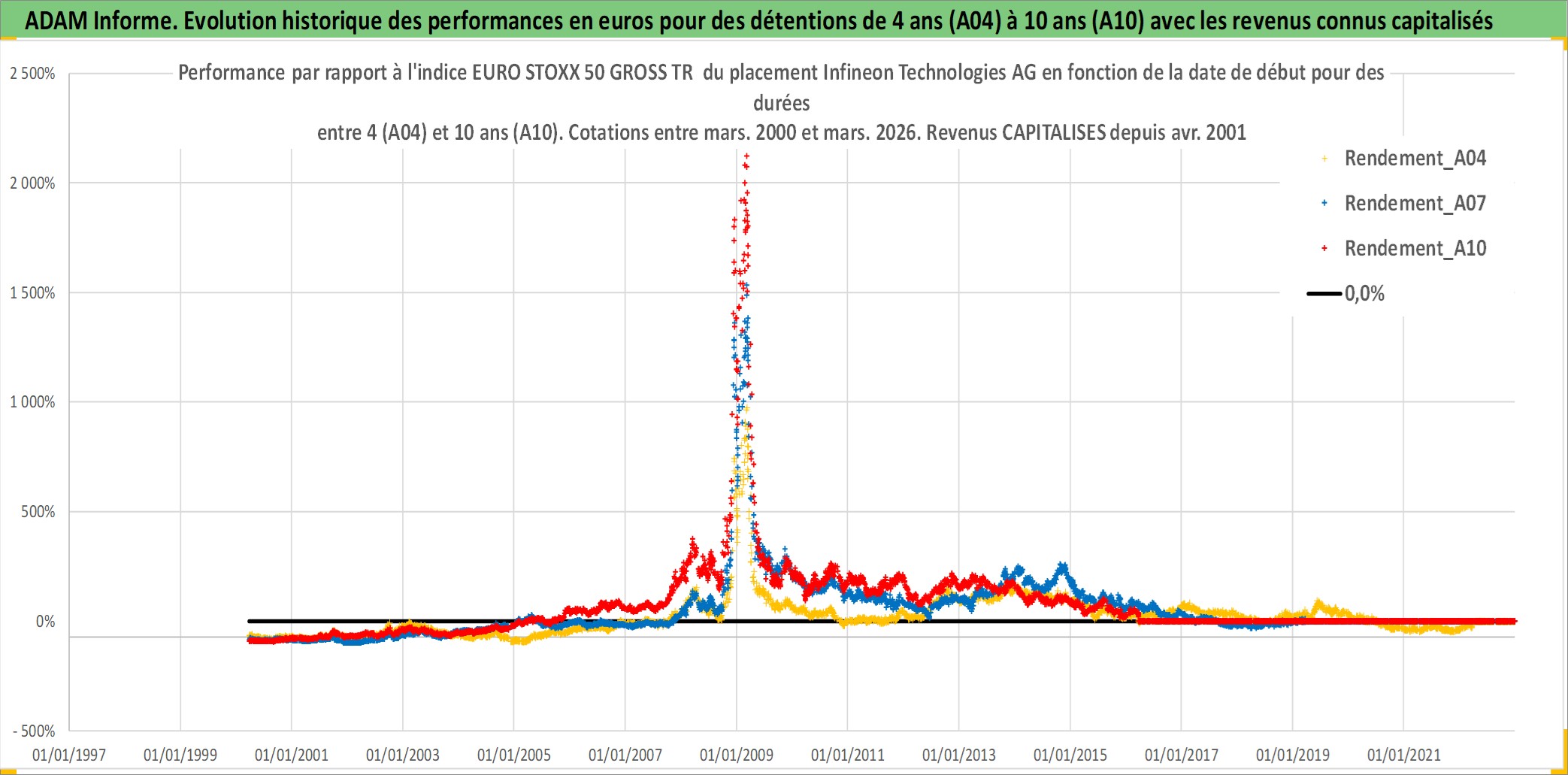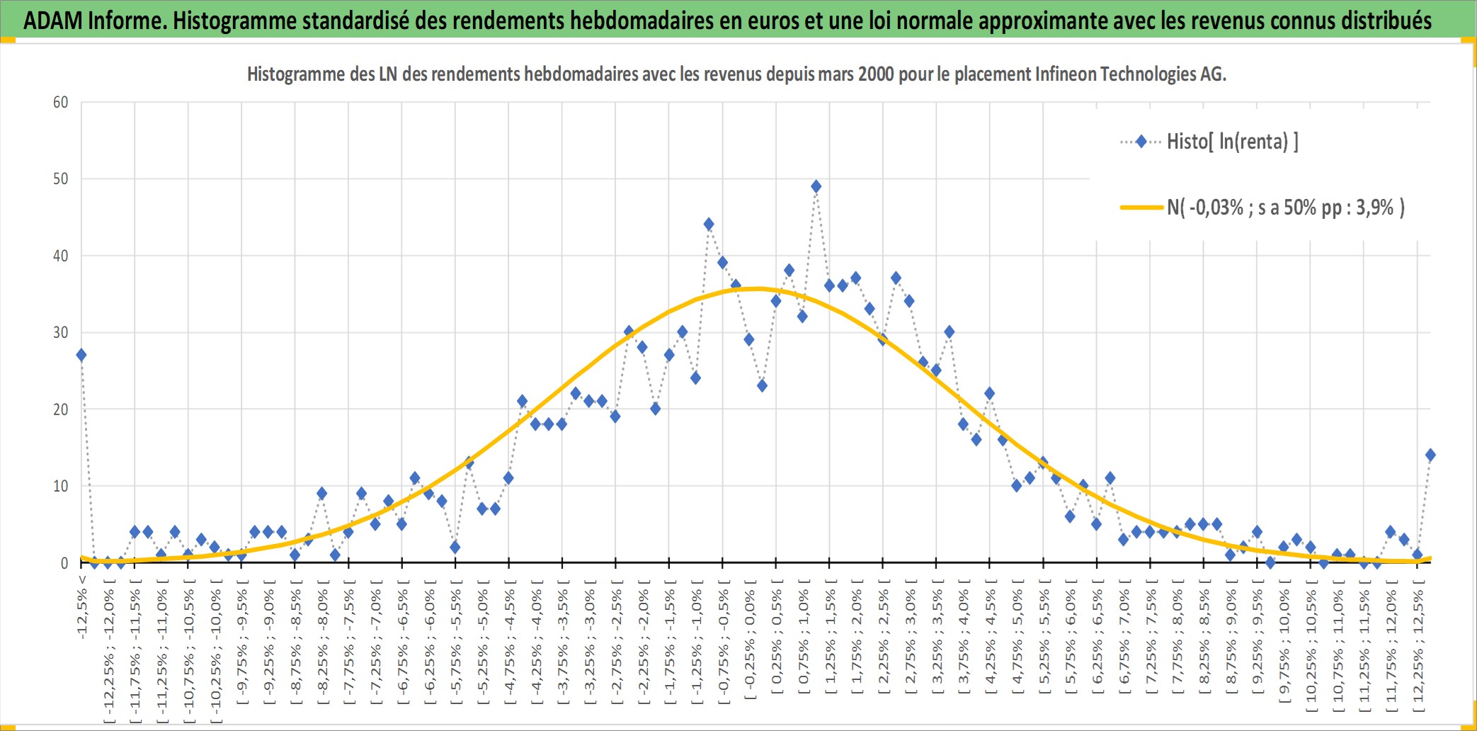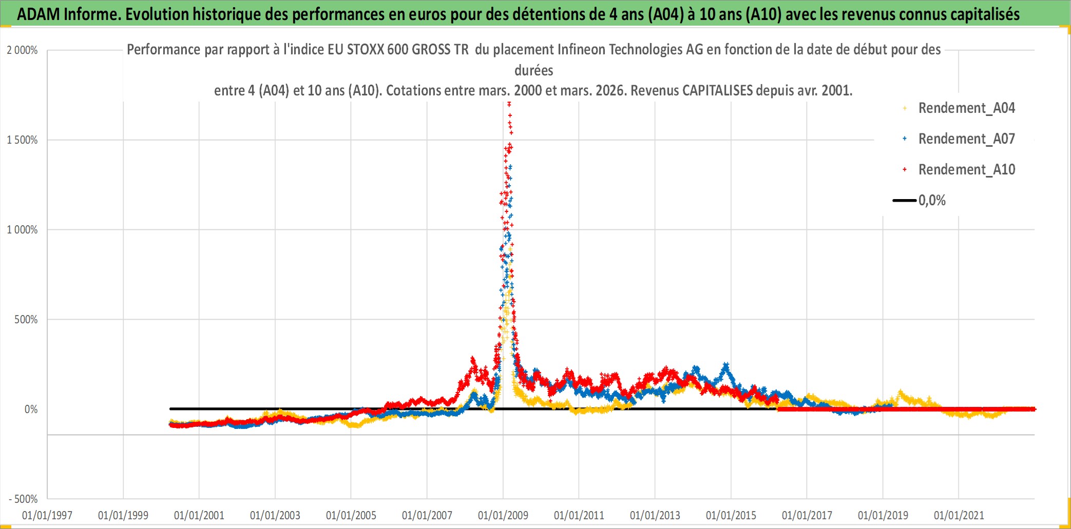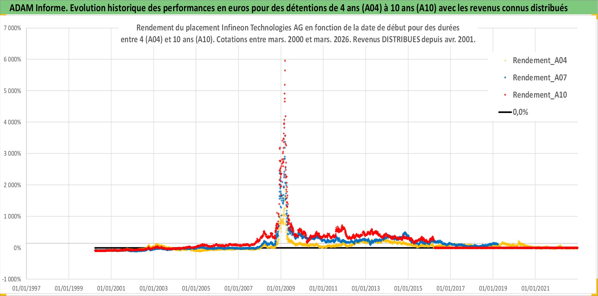 Site dédié aux investisseursPage dédiée sur site financeAnalyse des valorisations hebdomadaires de l'action Infineon Technologies AG. Cet actif est cote en EUR. Les valorisations couvrent les semaines 2000W11 a 2026W13. Les revenus de cet actif financier sont pris en compte depuis la semaine 2001W15. La note globale ESG de cet actif est estimee a 11.0 (apres rebasage entre 0 et 20).
