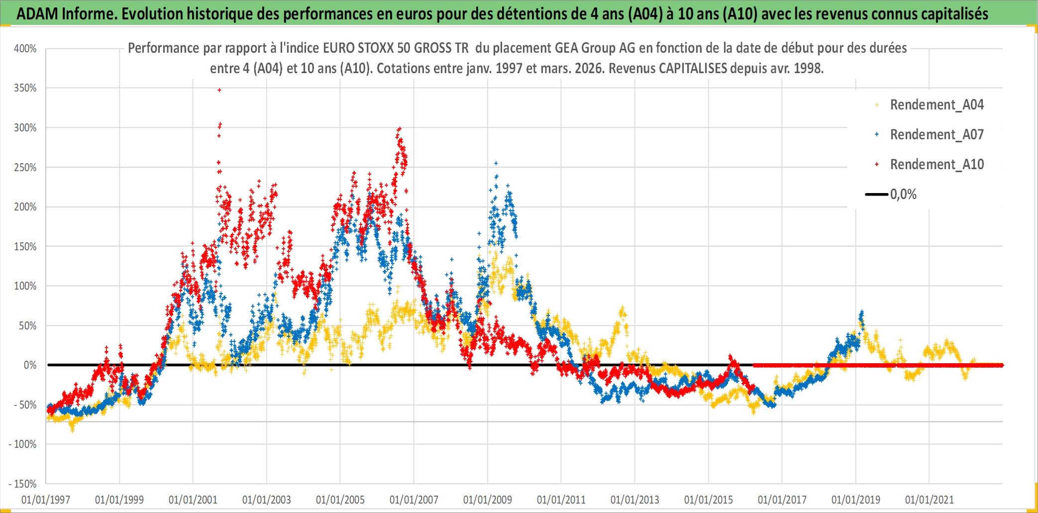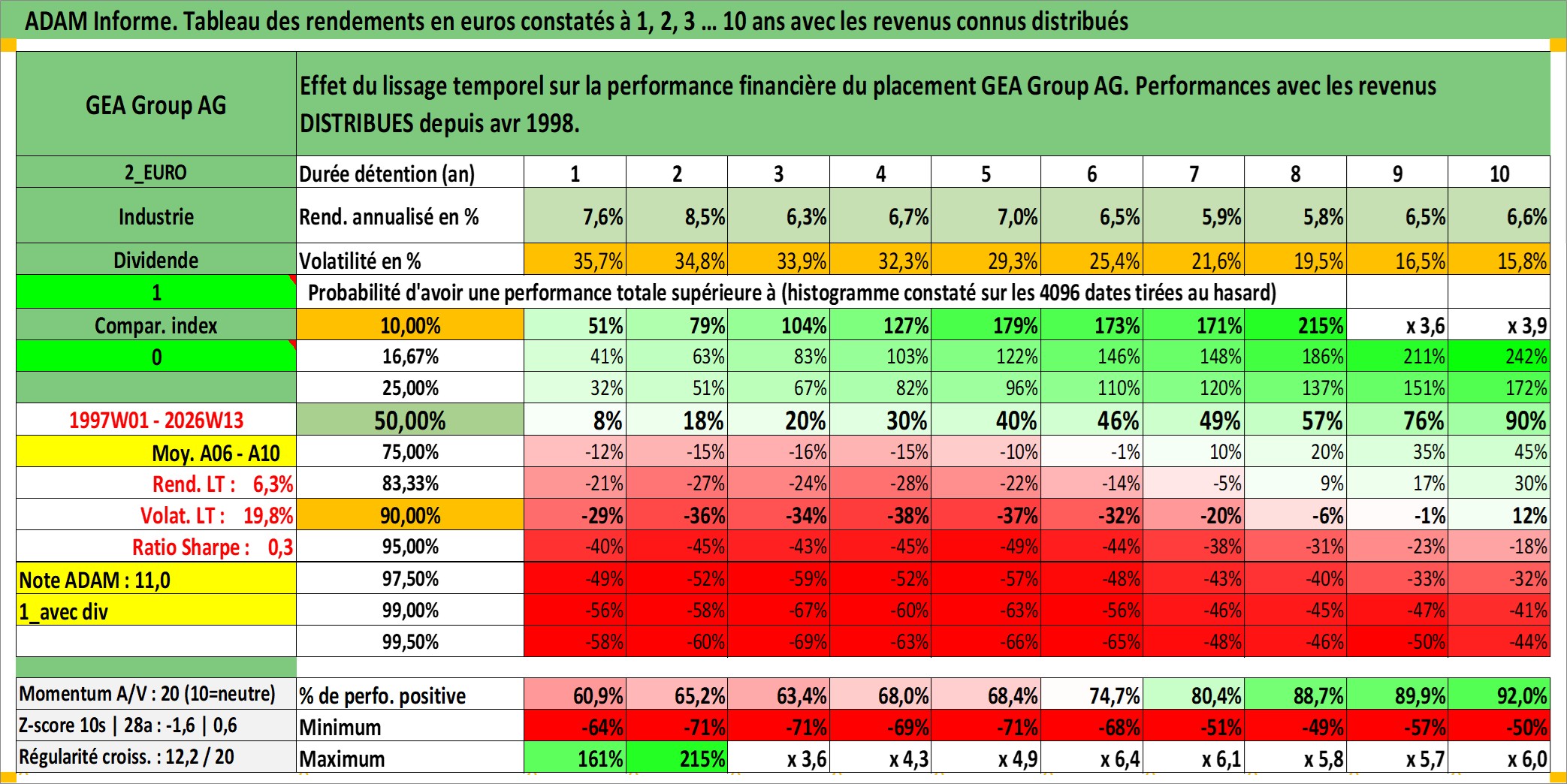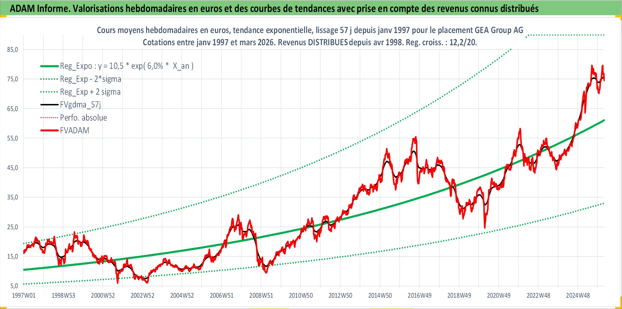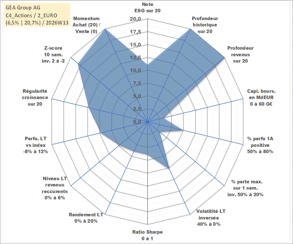Site dédié aux investisseursPage dédiée sur site financeAnalyse des valorisations hebdomadaires de l'action GEA Group AG. Cet actif est cote en EUR. Les valorisations couvrent les semaines 1997W01 a 2026W13. Les revenus de cet actif financier sont pris en compte depuis la semaine 1998W14. La note globale ESG de cet actif est estimee a 11.0 (apres rebasage entre 0 et 20).