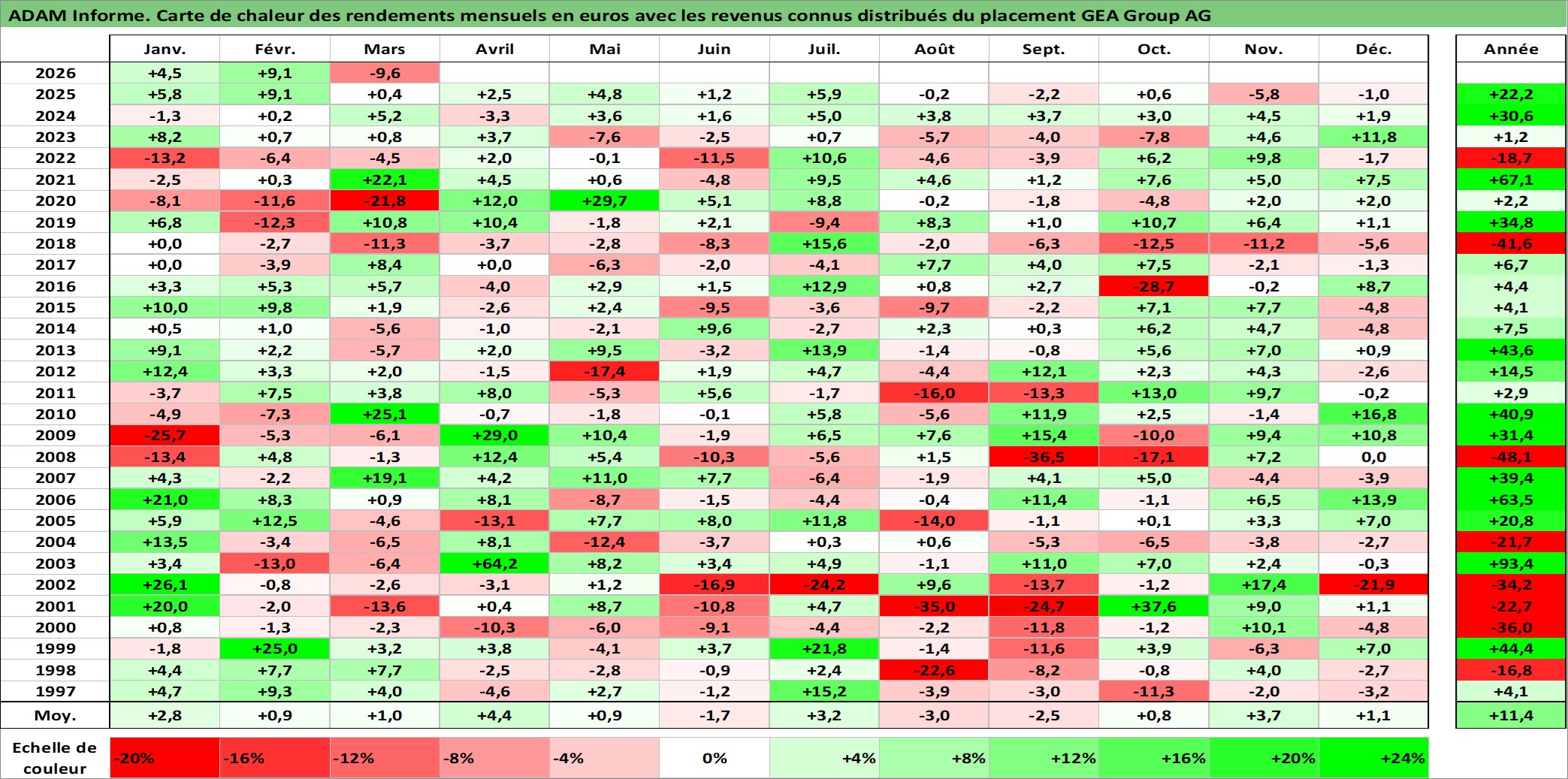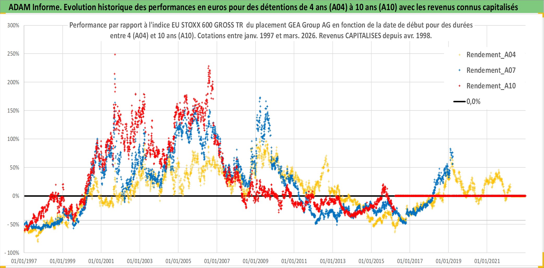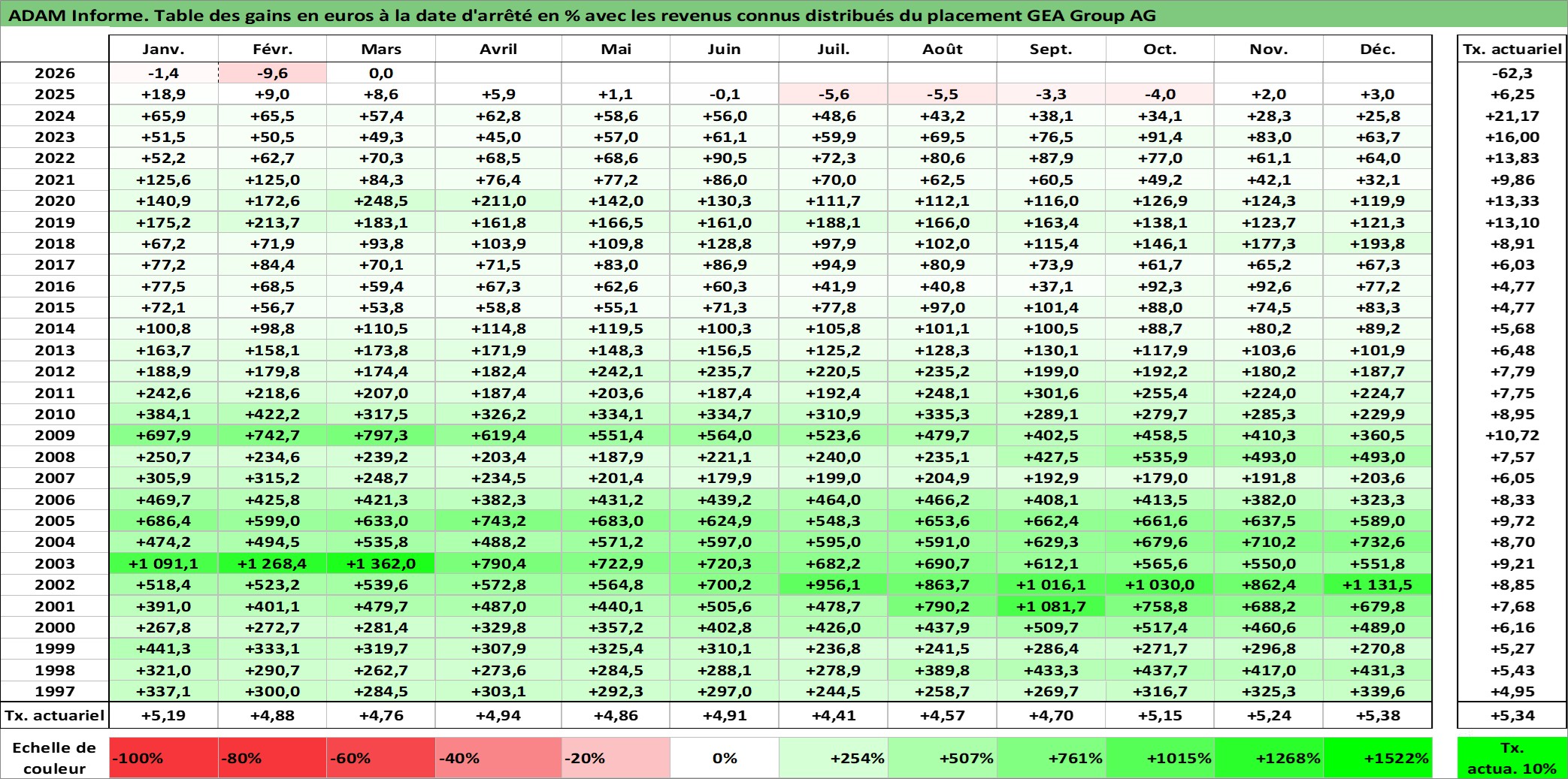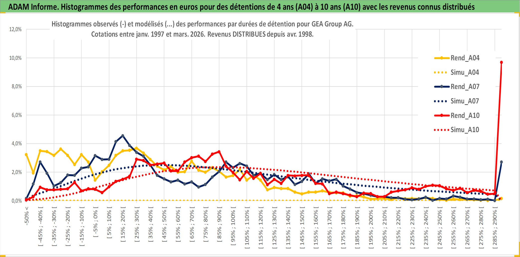 Site dédié aux investisseursPage dédiée sur site financeAnalyse des valorisations hebdomadaires de l'action GEA Group AG. Cet actif est cote en EUR. Les valorisations couvrent les semaines 1997W01 a 2026W13. Les revenus de cet actif financier sont pris en compte depuis la semaine 1998W14. La note globale ESG de cet actif est estimee a 11.0 (apres rebasage entre 0 et 20).
