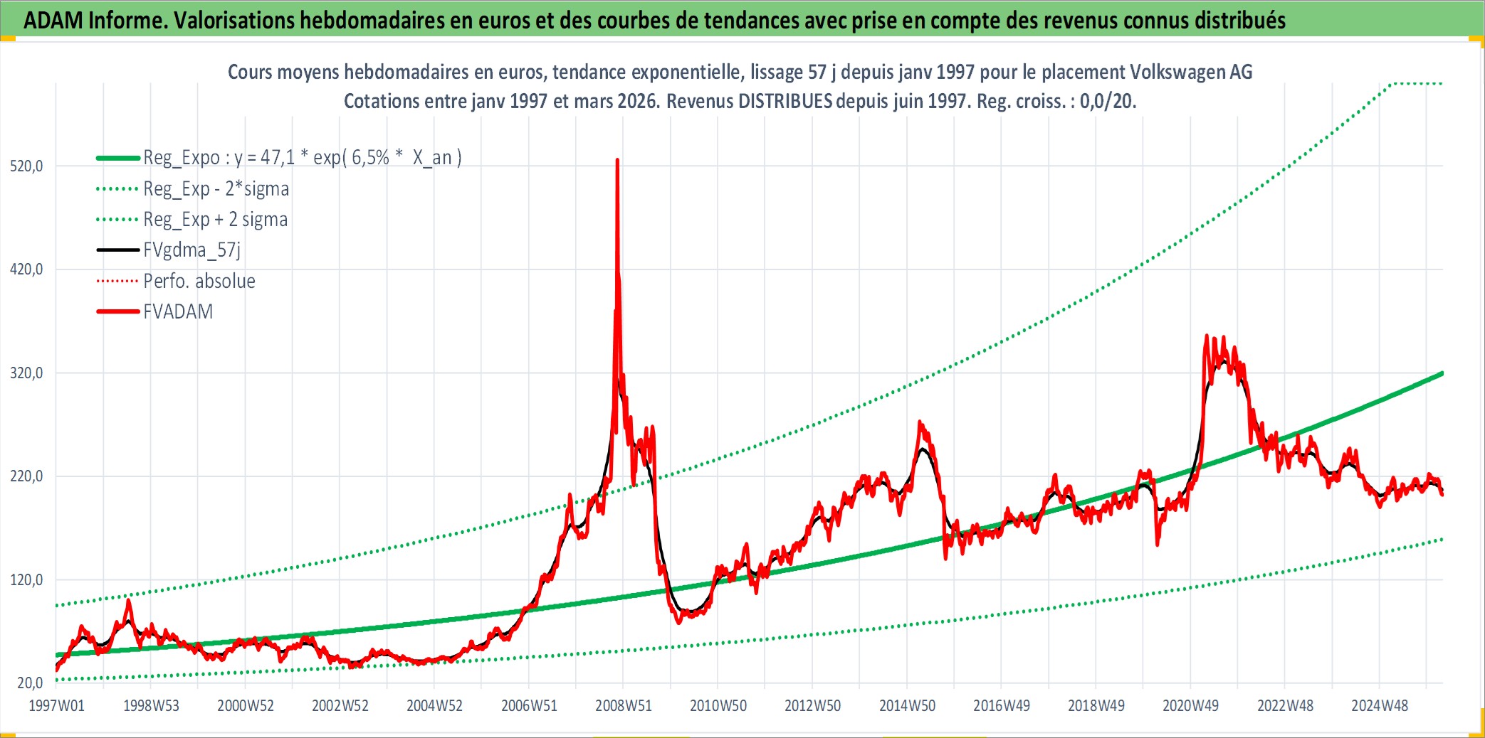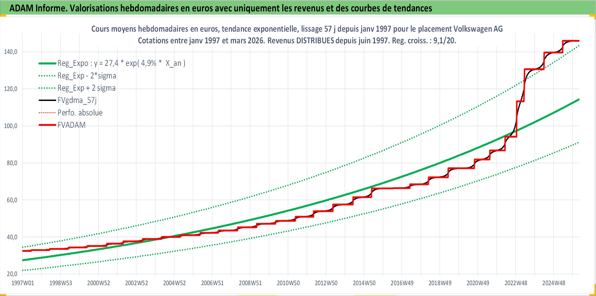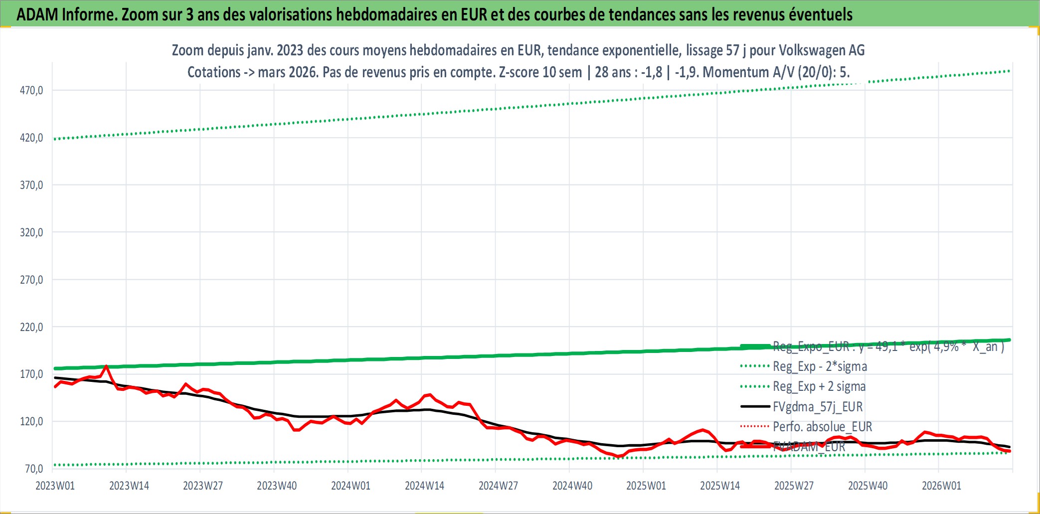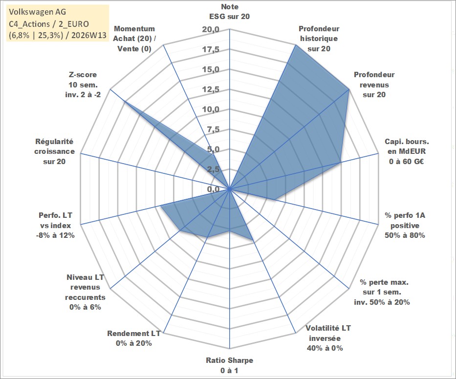 Site dédié aux investisseursPage dédiée sur site financeAnalyse des valorisations hebdomadaires de l'action Volkswagen AG. Cet actif est cote en EUR. Les valorisations couvrent les semaines 1997W01 a 2026W13. Les revenus de cet actif financier sont pris en compte depuis la semaine 1997W25. La note ESG de cet actif n'est pas connue.