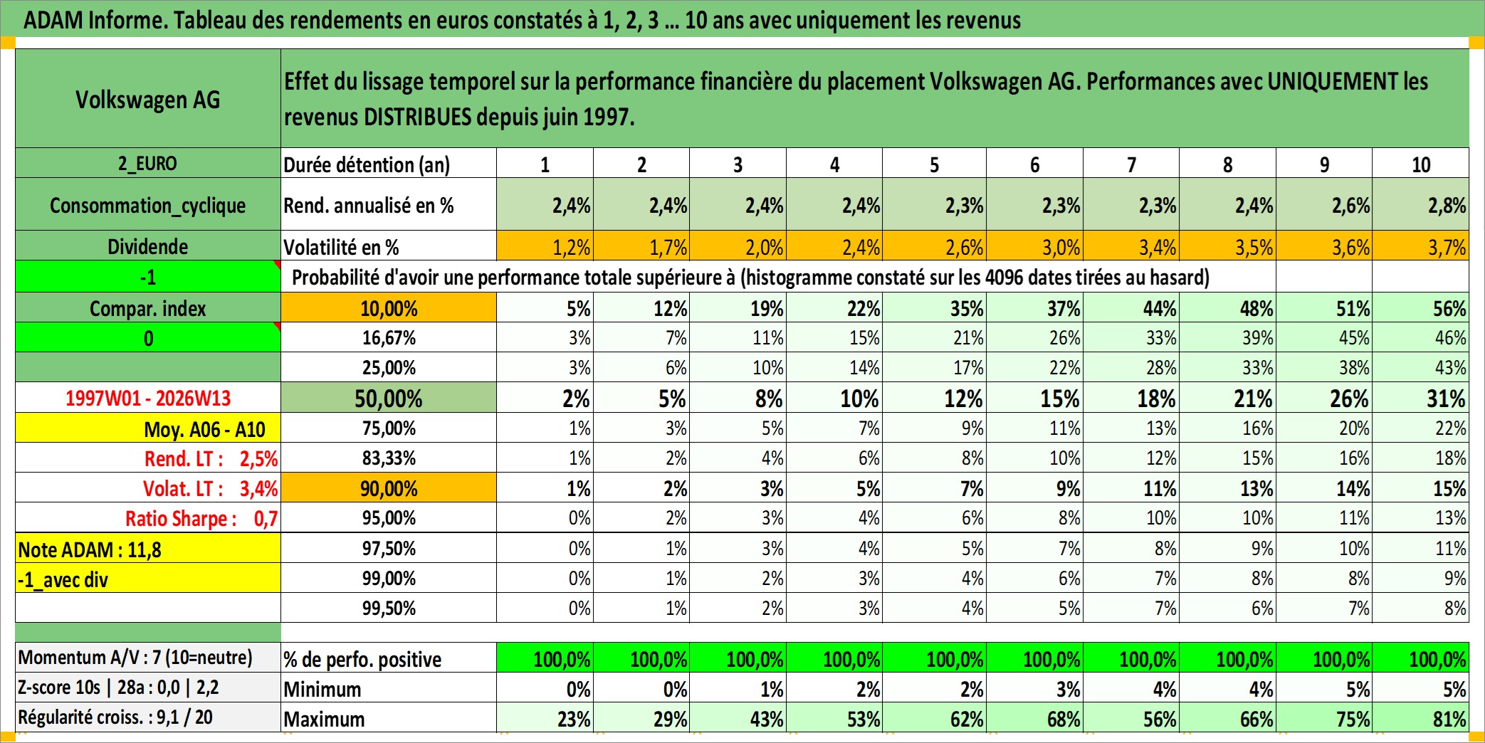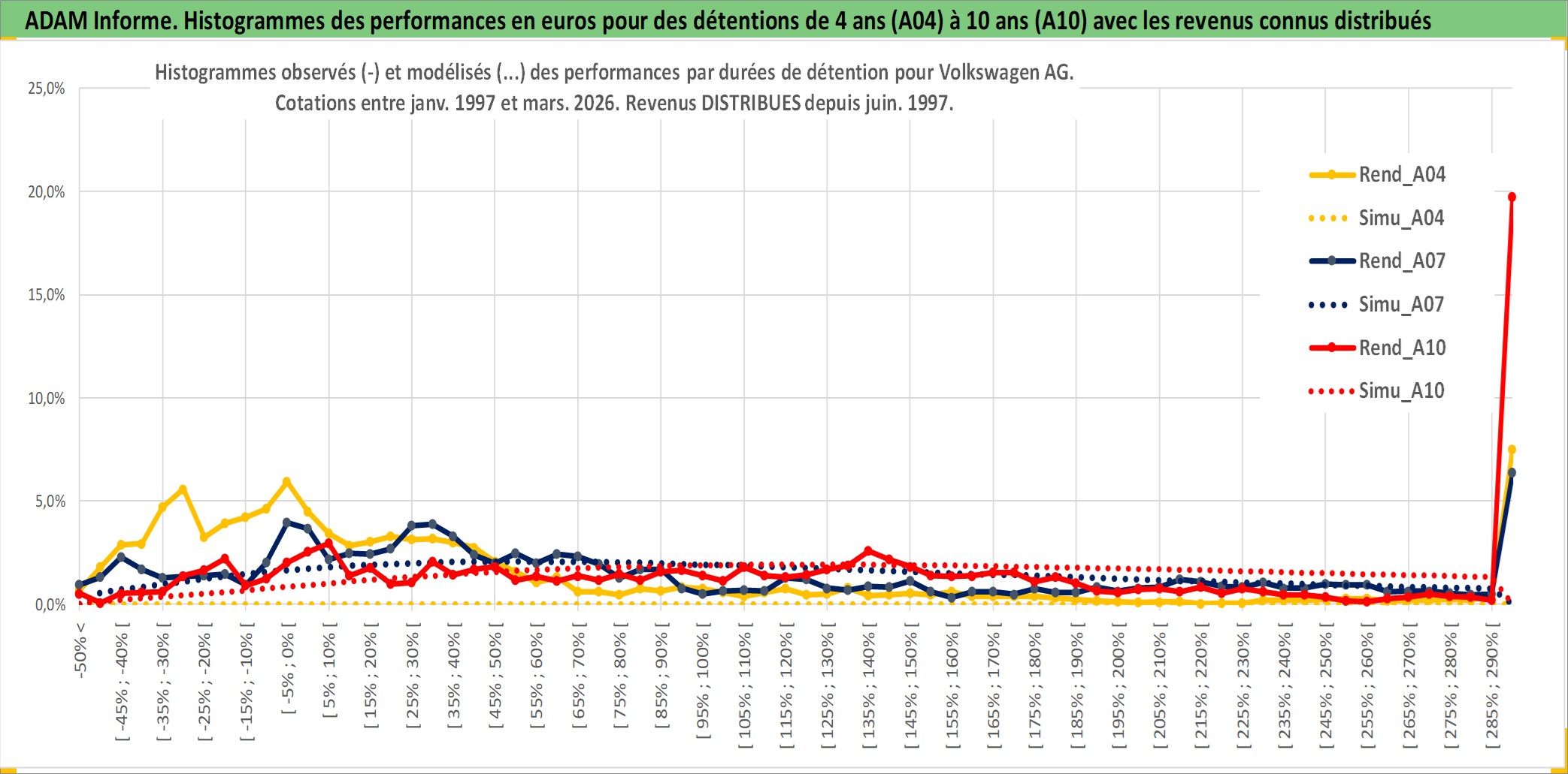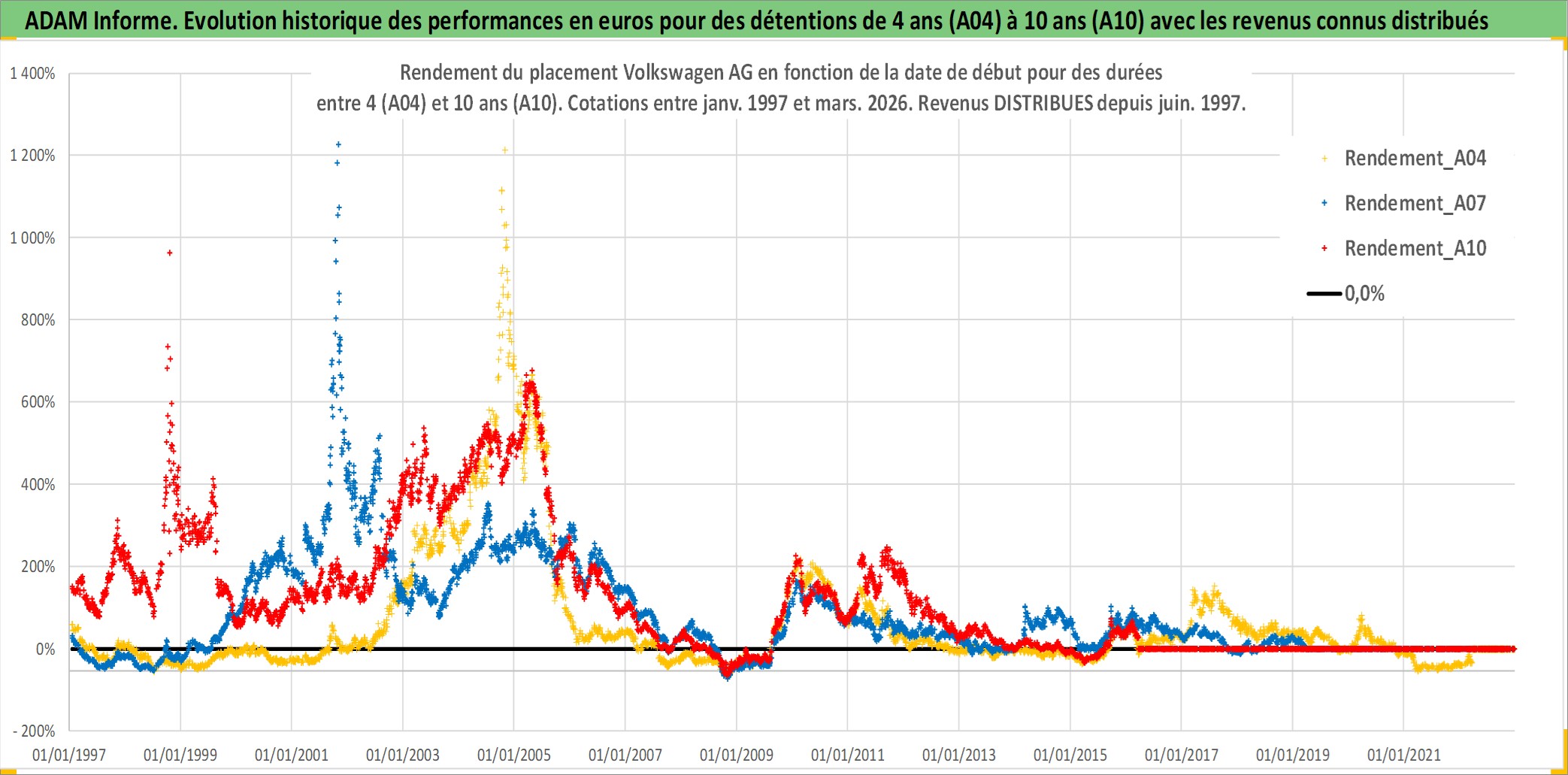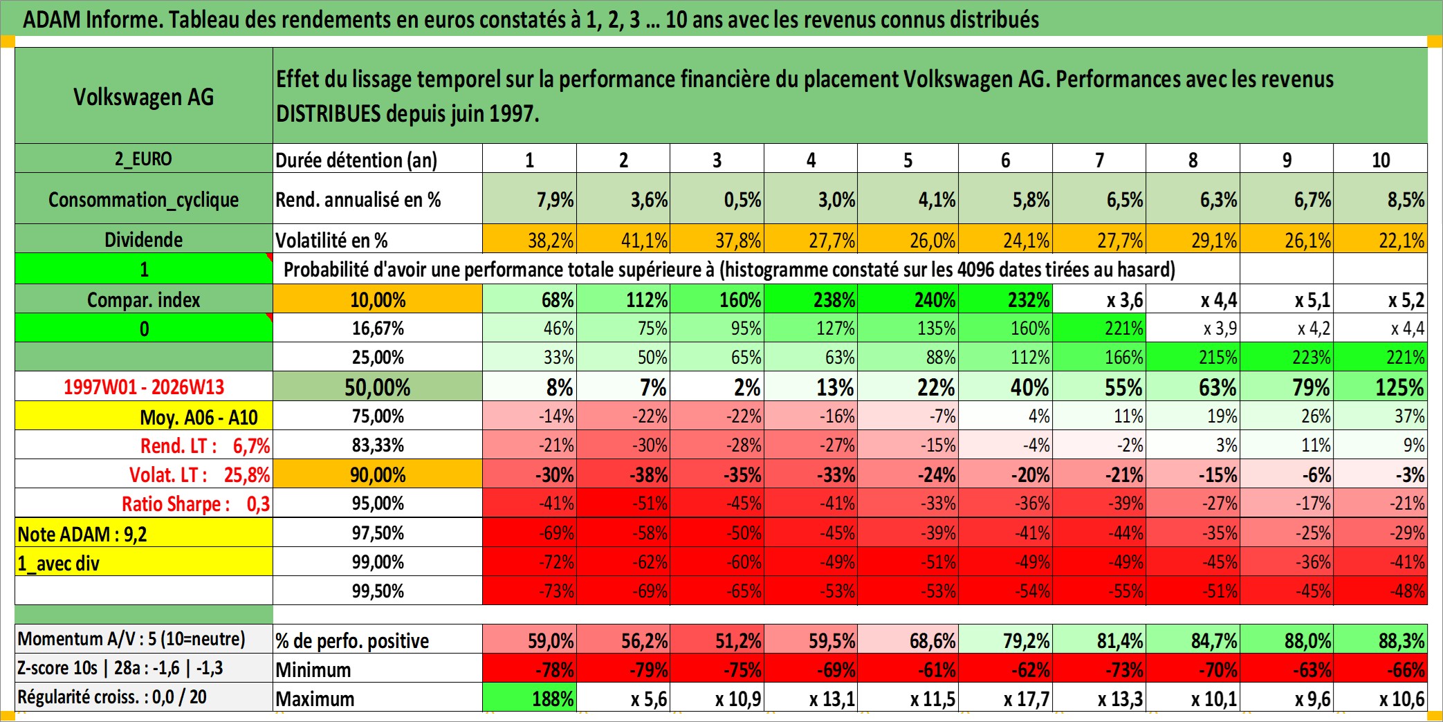 Site dédié aux investisseursPage dédiée sur site financeAnalyse des valorisations hebdomadaires de l'action Volkswagen AG. Cet actif est cote en EUR. Les valorisations couvrent les semaines 1997W01 a 2026W13. Les revenus de cet actif financier sont pris en compte depuis la semaine 1997W25. La note ESG de cet actif n'est pas connue.