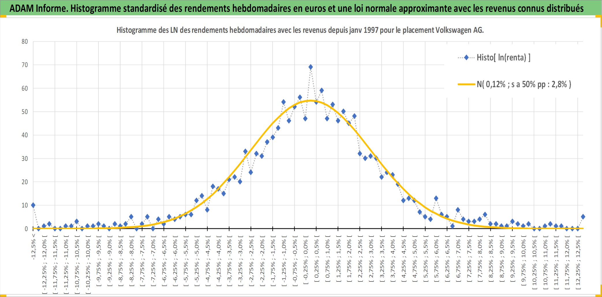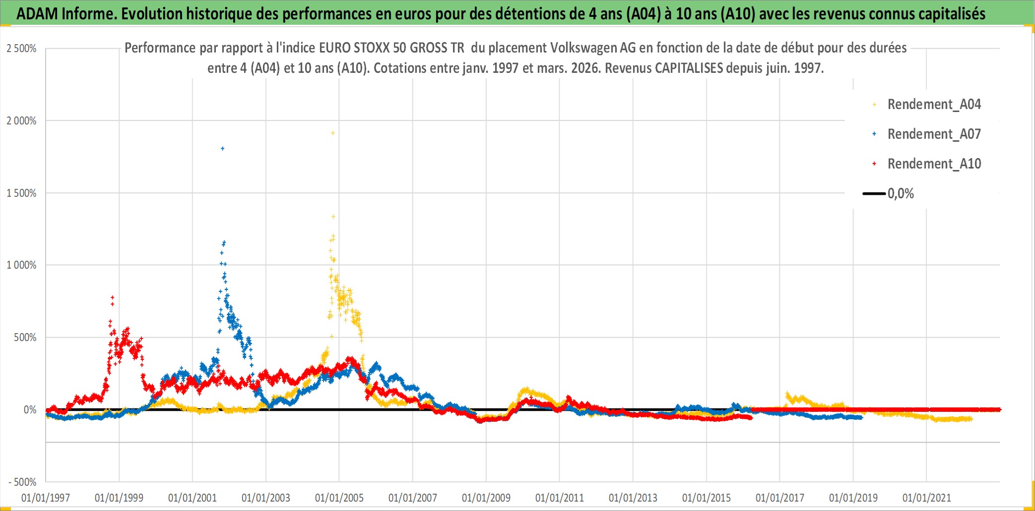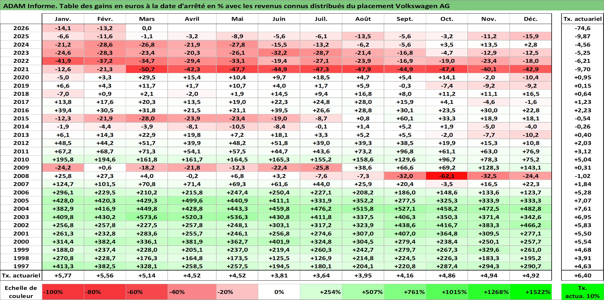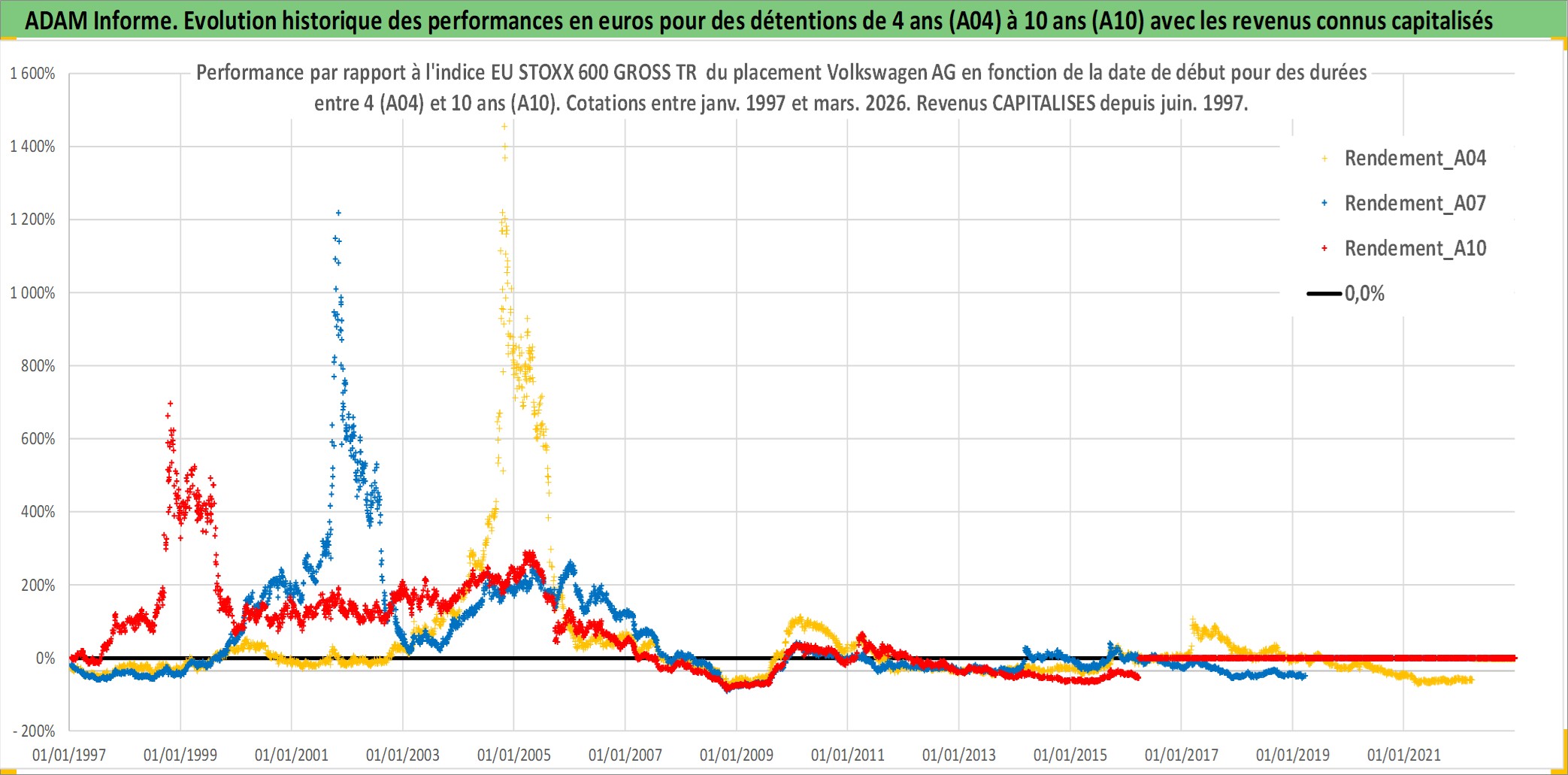 Site dédié aux investisseursPage dédiée sur site financeAnalyse des valorisations hebdomadaires de l'action Volkswagen AG. Cet actif est cote en EUR. Les valorisations couvrent les semaines 1997W01 a 2026W13. Les revenus de cet actif financier sont pris en compte depuis la semaine 1997W25. La note ESG de cet actif n'est pas connue.