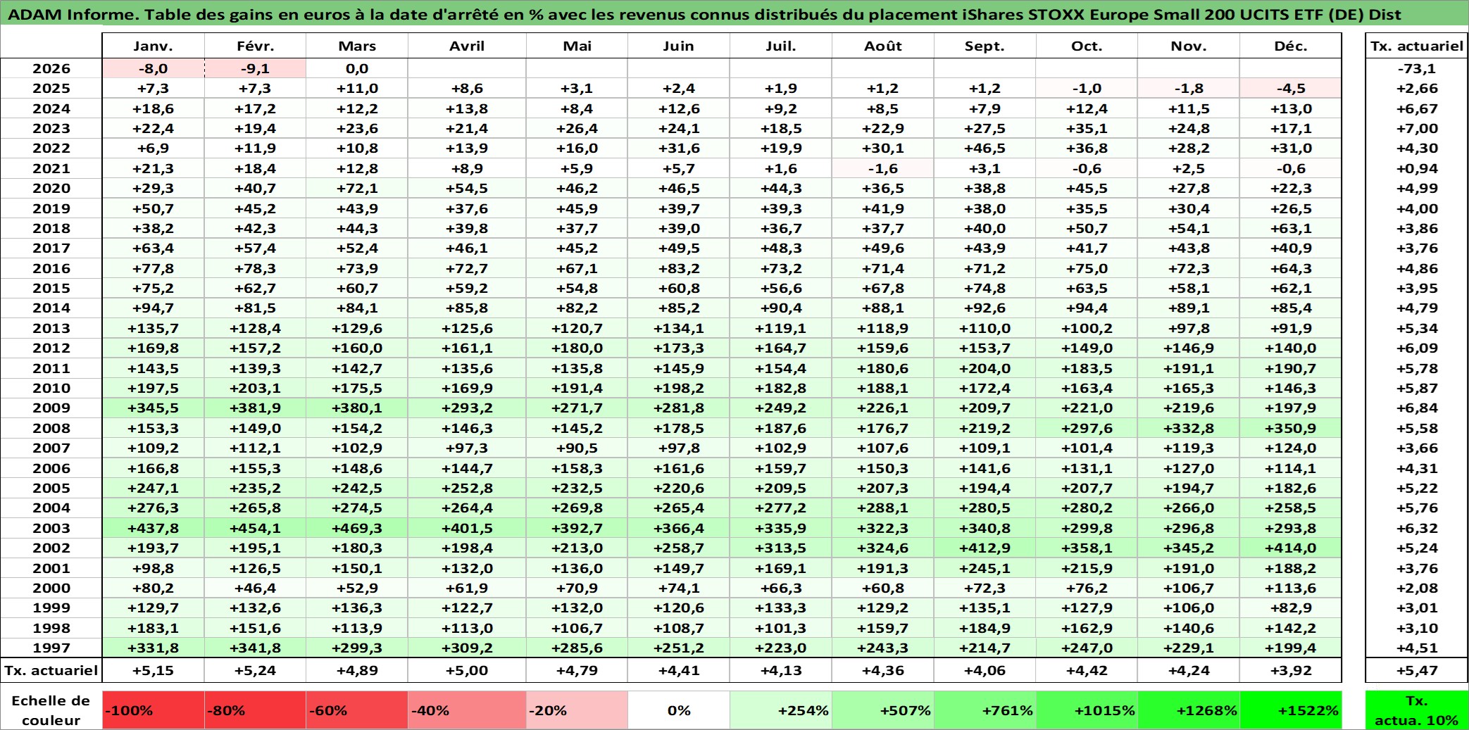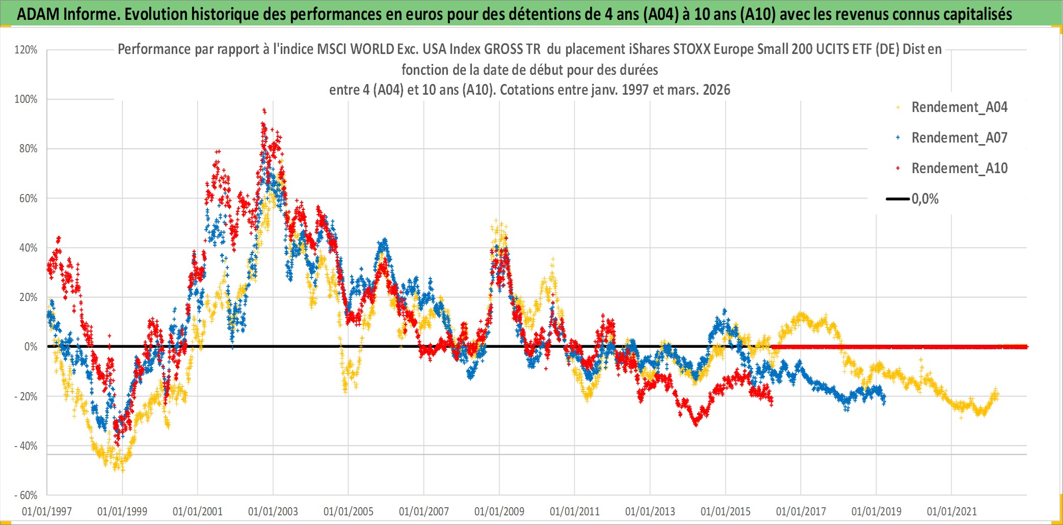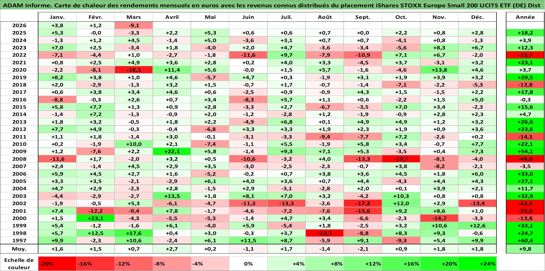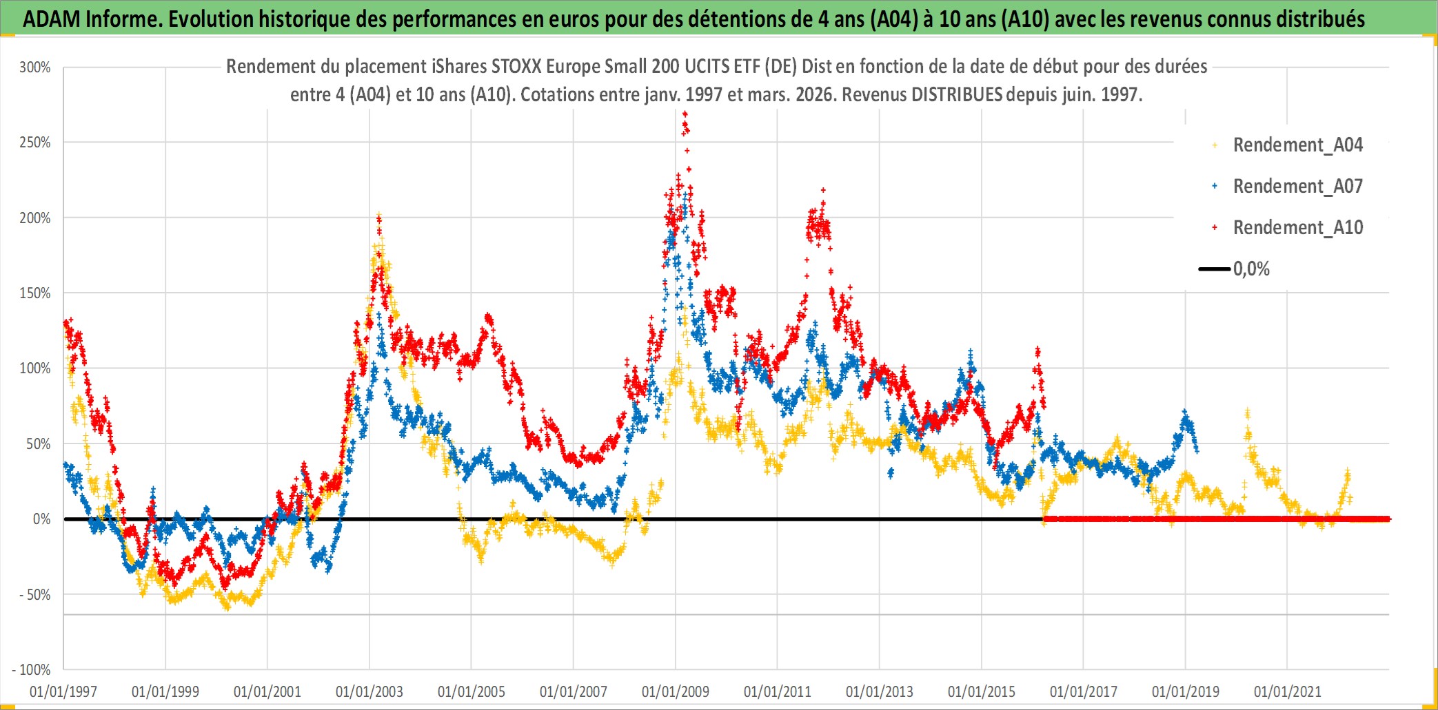 Site dédié aux investisseursPage dédiée sur site financeAnalyse des valorisations hebdomadaires du fonds iShares STOXX Europe Small 200 UCITS ETF (DE) Dist. Cet actif est cote en EUR. Les valorisations couvrent les semaines 1997W01 a 2026W13. Les revenus de cet actif financier sont pris en compte depuis la semaine 1997W24. La note ESG de cet actif n'est pas connue.