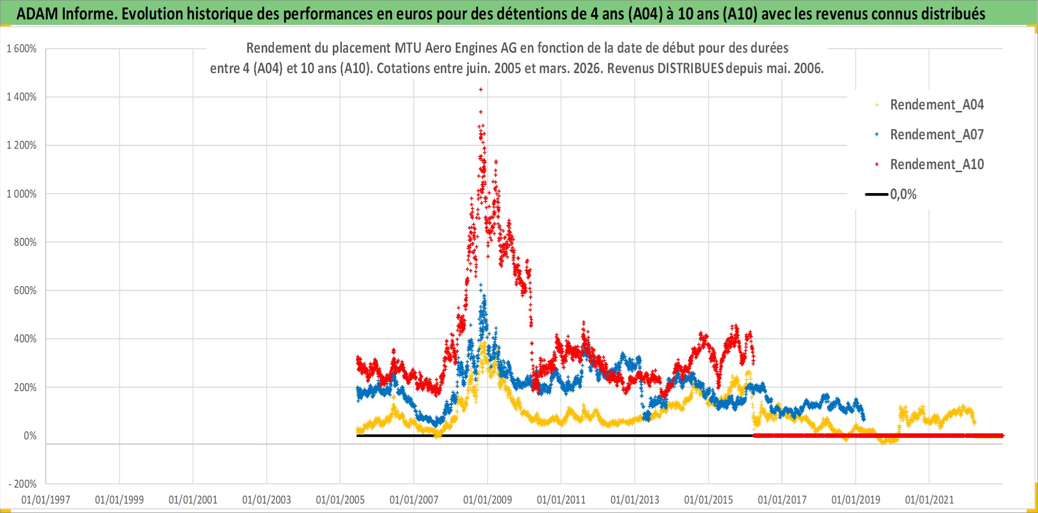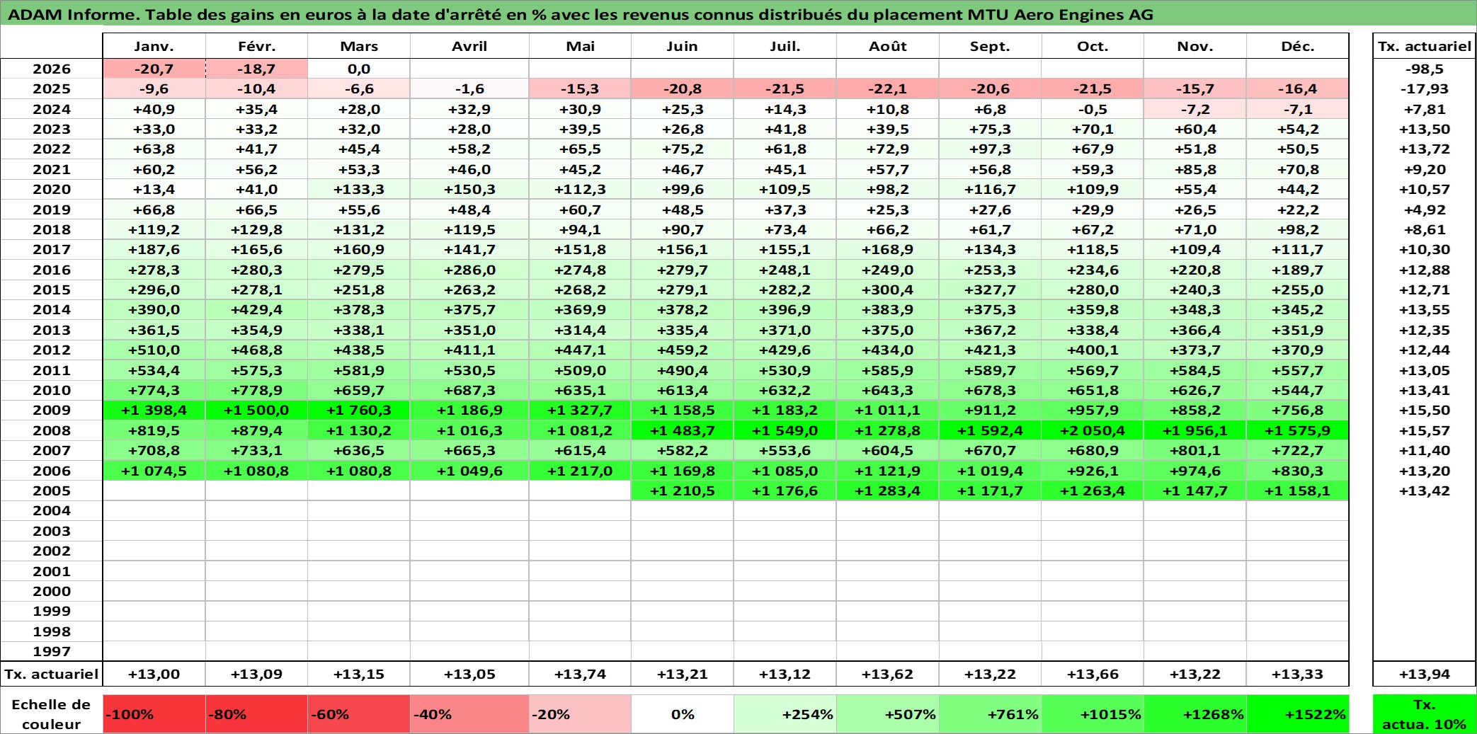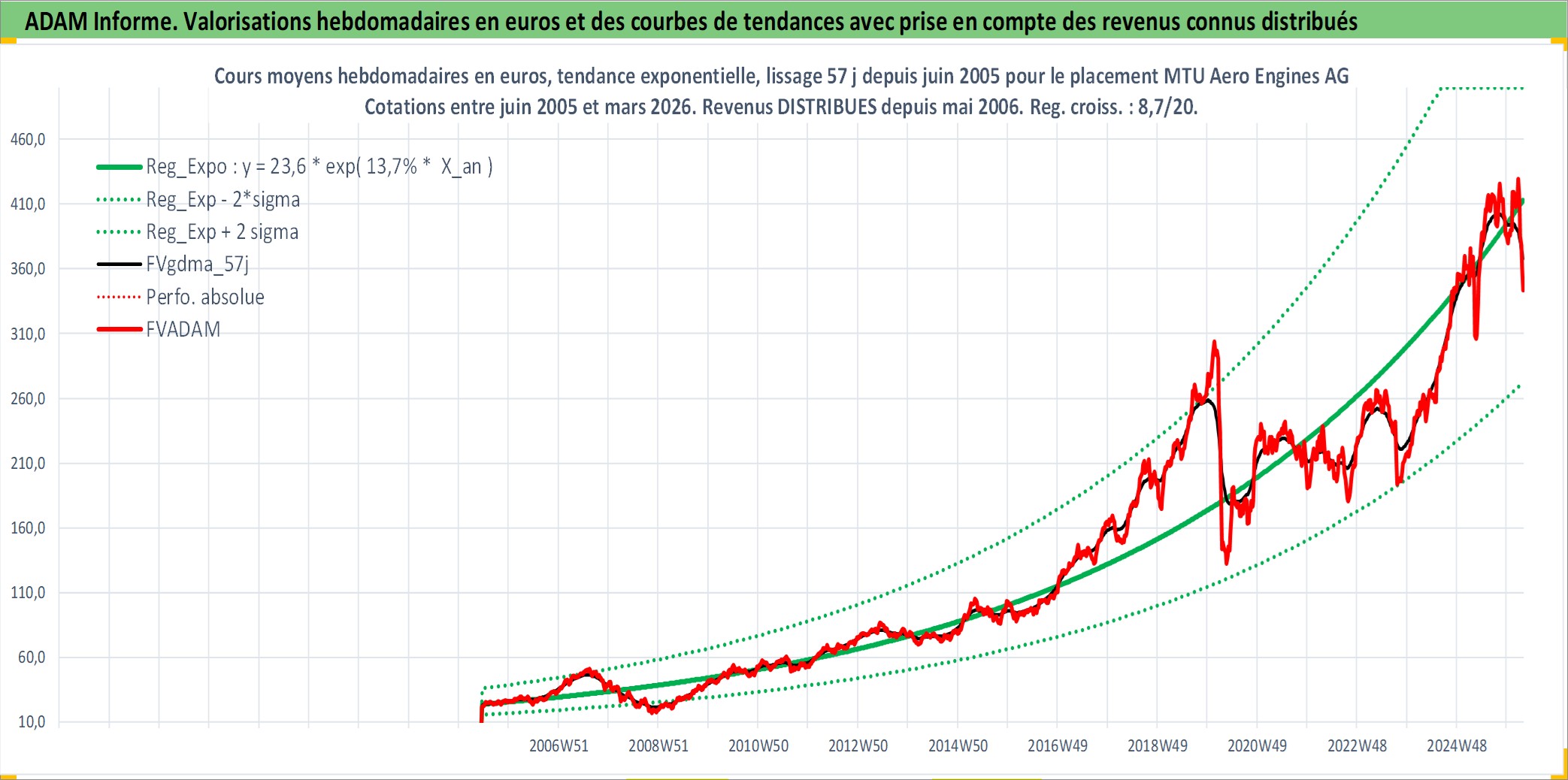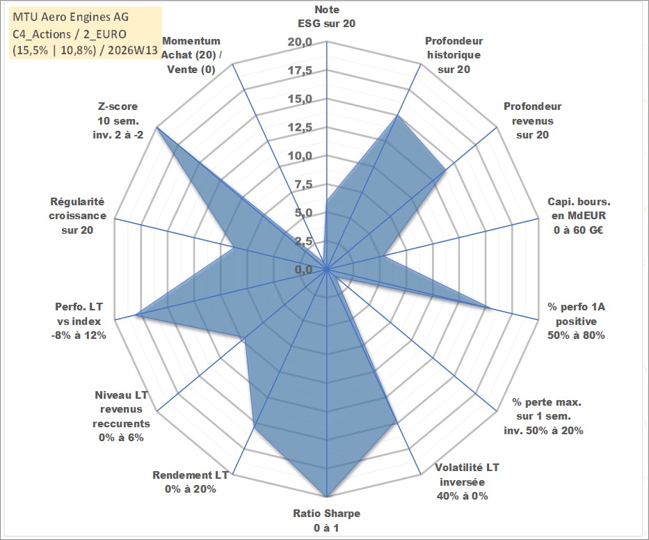 Site dédié aux investisseursPage dédiée sur site financeAnalyse des valorisations hebdomadaires de l'action MTU Aero Engines AG. Cet actif est cote en EUR. Les valorisations couvrent les semaines 2005W23 a 2026W13. Les revenus de cet actif financier sont pris en compte depuis la semaine 2006W20. La note globale ESG de cet actif est estimee a 6.0 (apres rebasage entre 0 et 20).