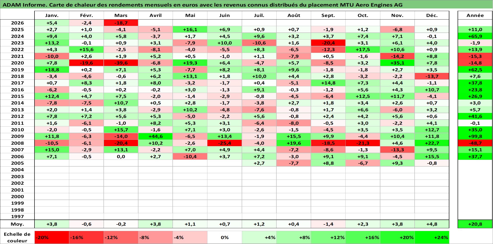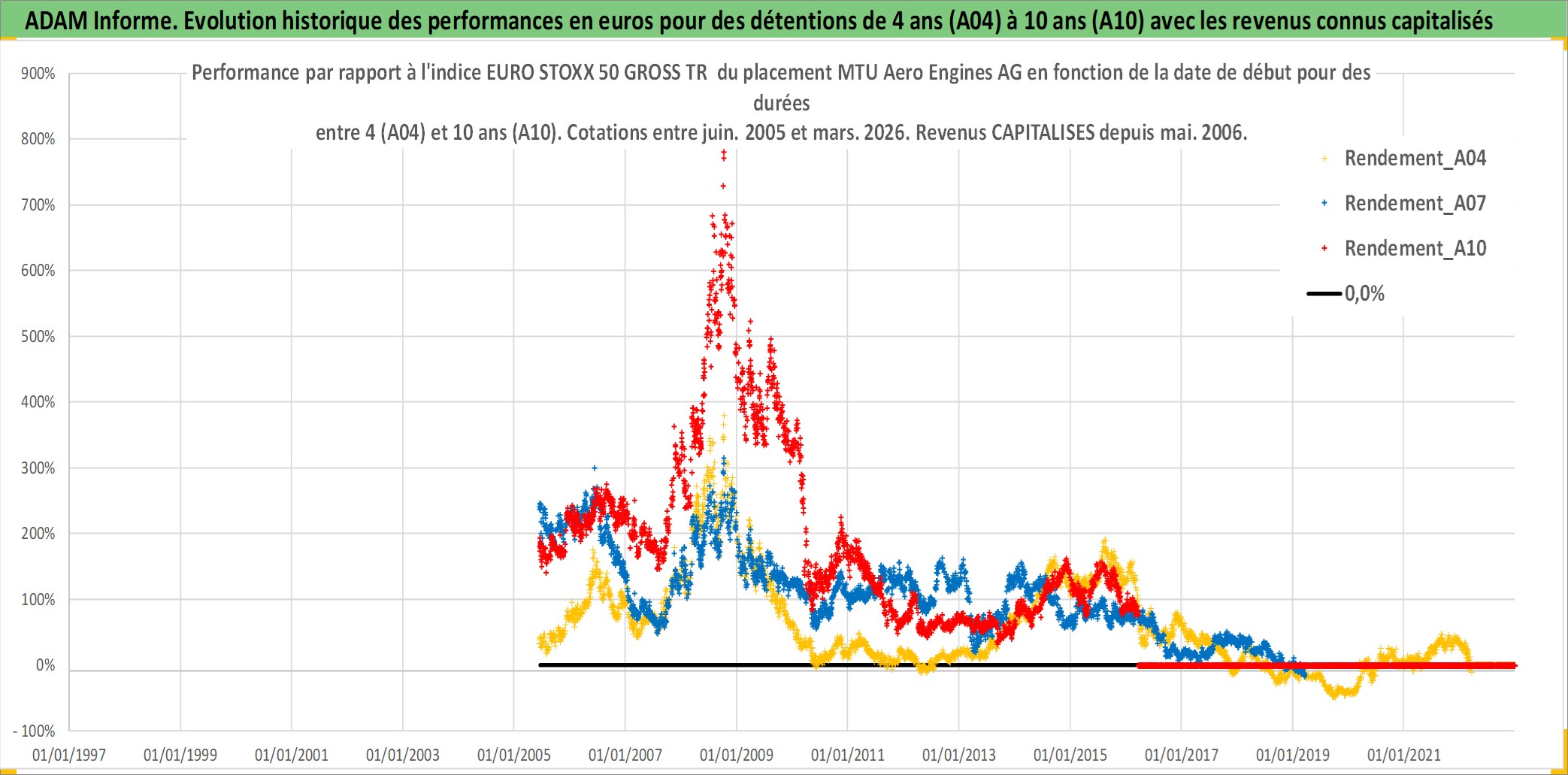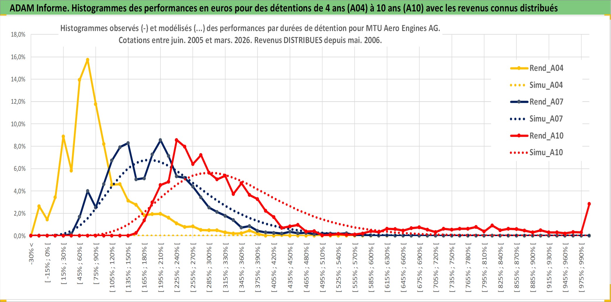 Site dédié aux investisseursPage dédiée sur site financeAnalyse des valorisations hebdomadaires de l'action MTU Aero Engines AG. Cet actif est cote en EUR. Les valorisations couvrent les semaines 2005W23 a 2026W13. Les revenus de cet actif financier sont pris en compte depuis la semaine 2006W20. La note globale ESG de cet actif est estimee a 6.0 (apres rebasage entre 0 et 20).