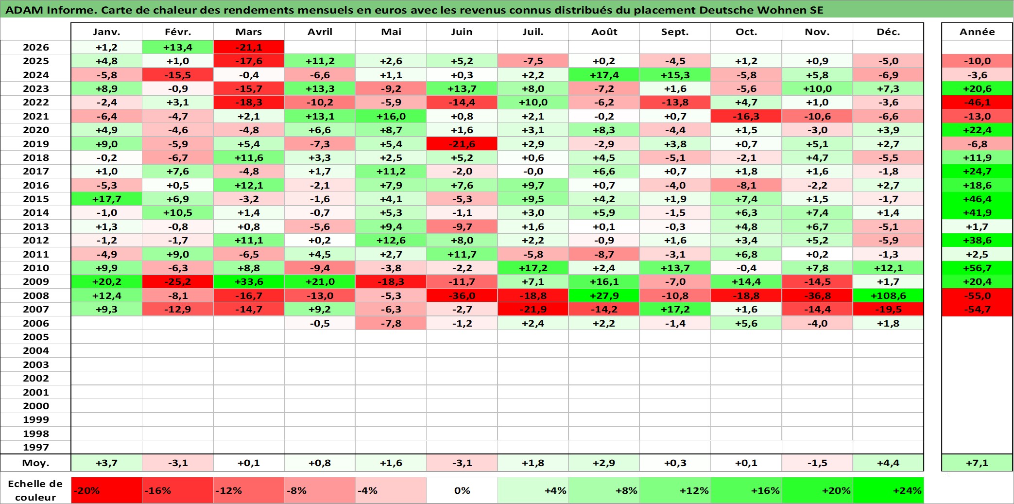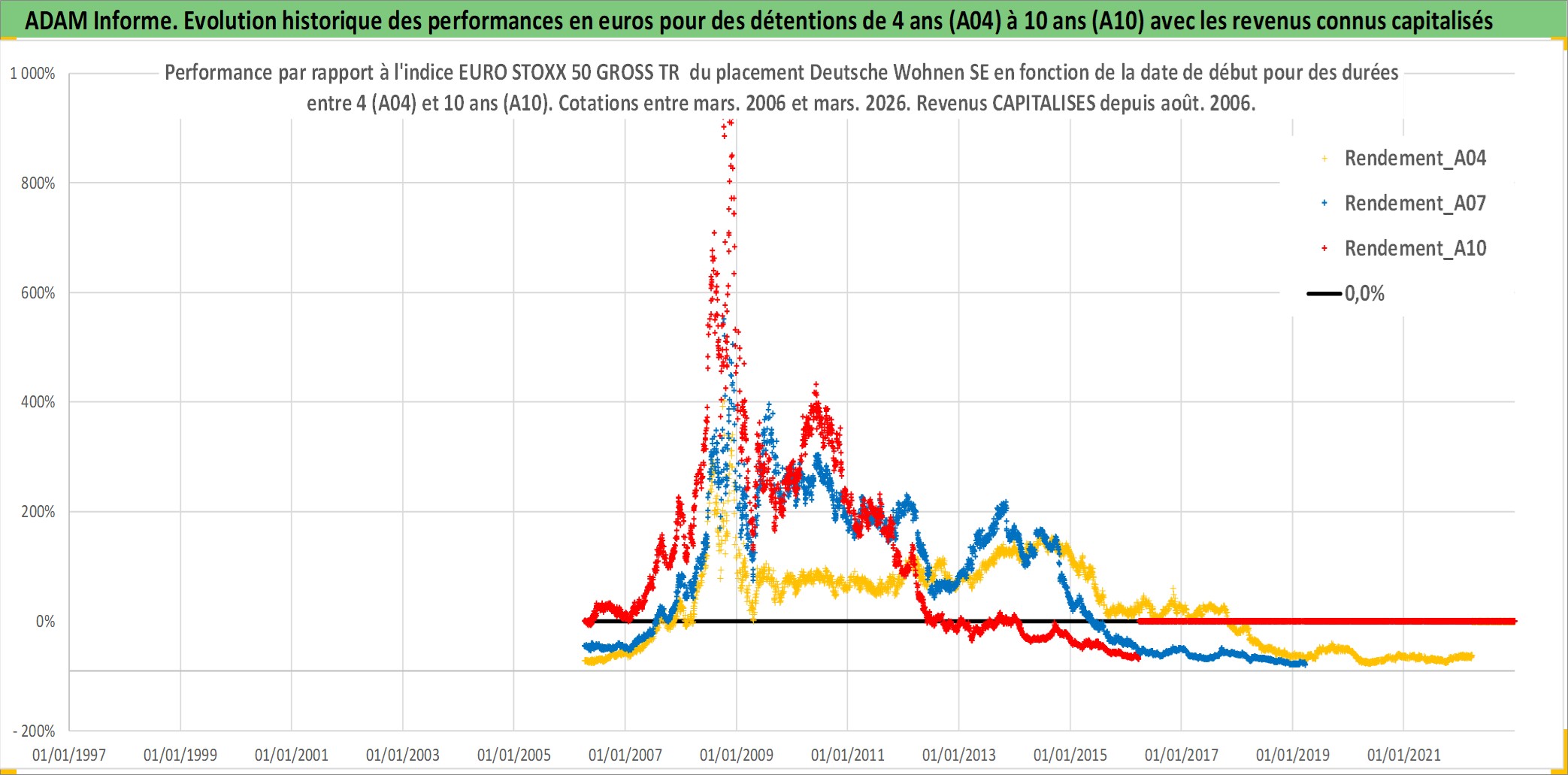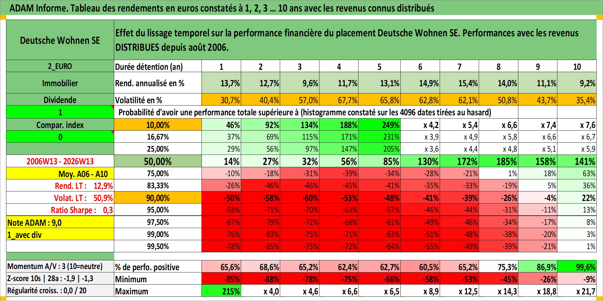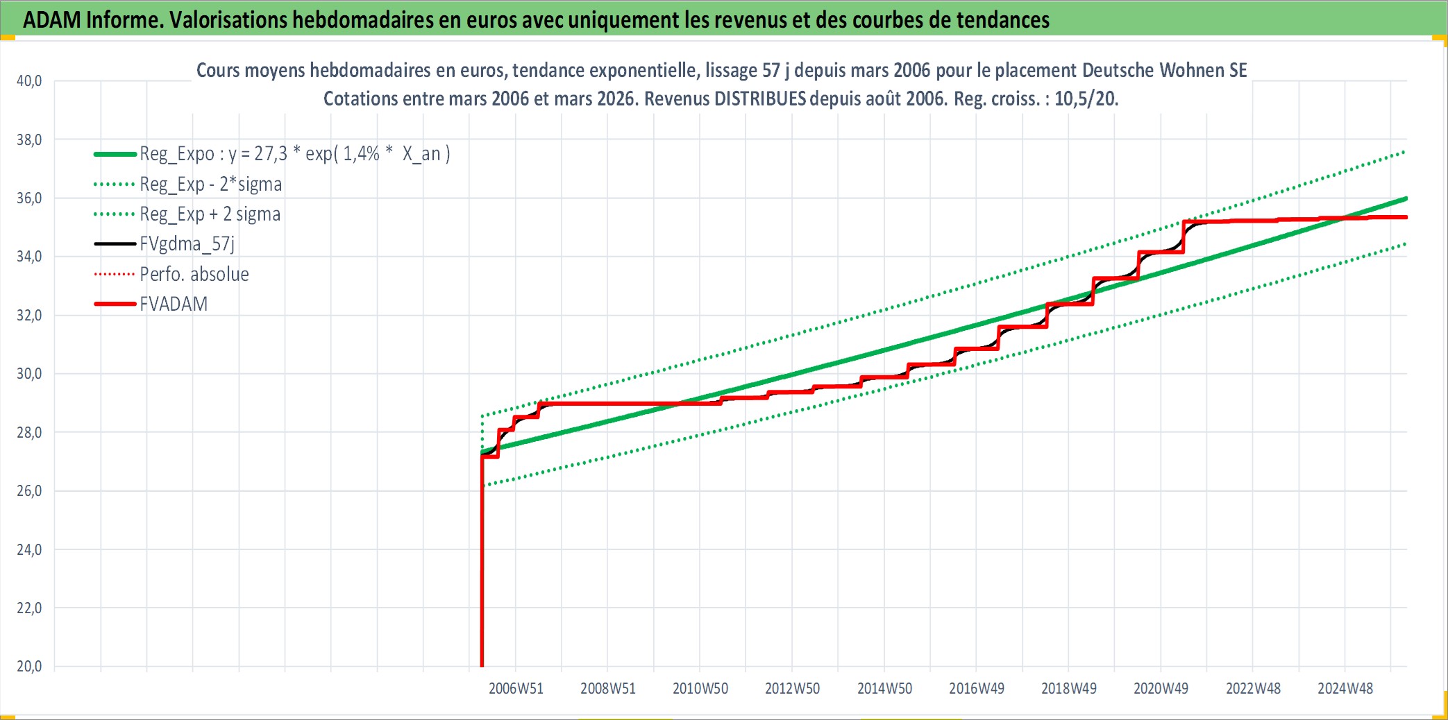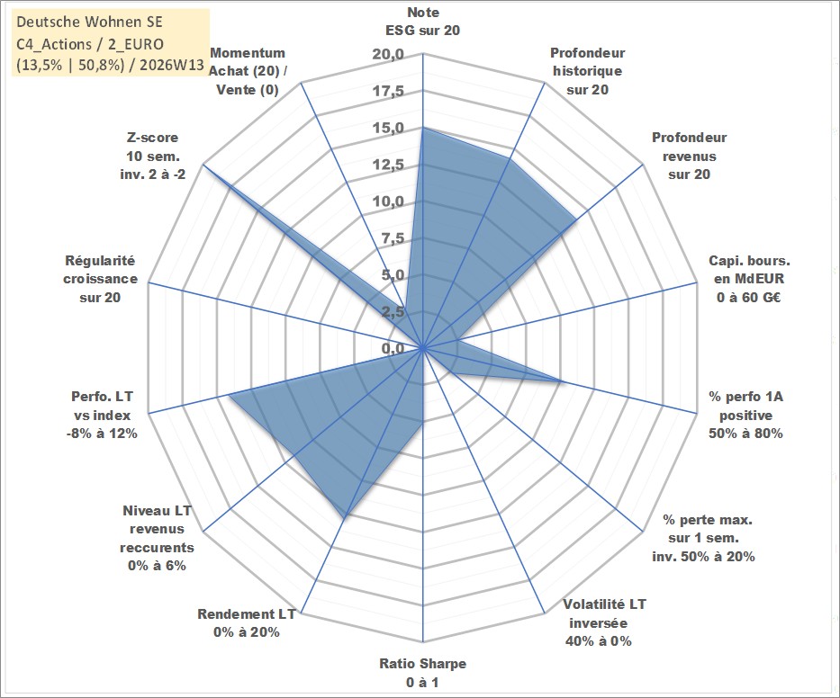 Site dédié aux investisseursPage dédiée sur site financeAnalyse des valorisations hebdomadaires de l'action Deutsche Wohnen SE. Cet actif est cote en EUR. Les valorisations couvrent les semaines 2006W13 a 2026W13. Les revenus de cet actif financier sont pris en compte depuis la semaine 2006W32. La note globale ESG de cet actif est estimee a 15.0 (apres rebasage entre 0 et 20).