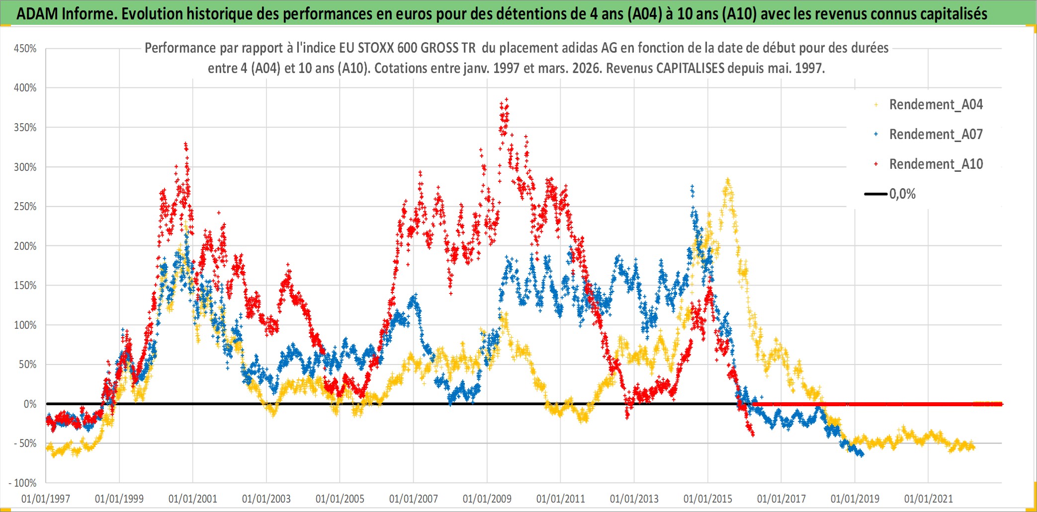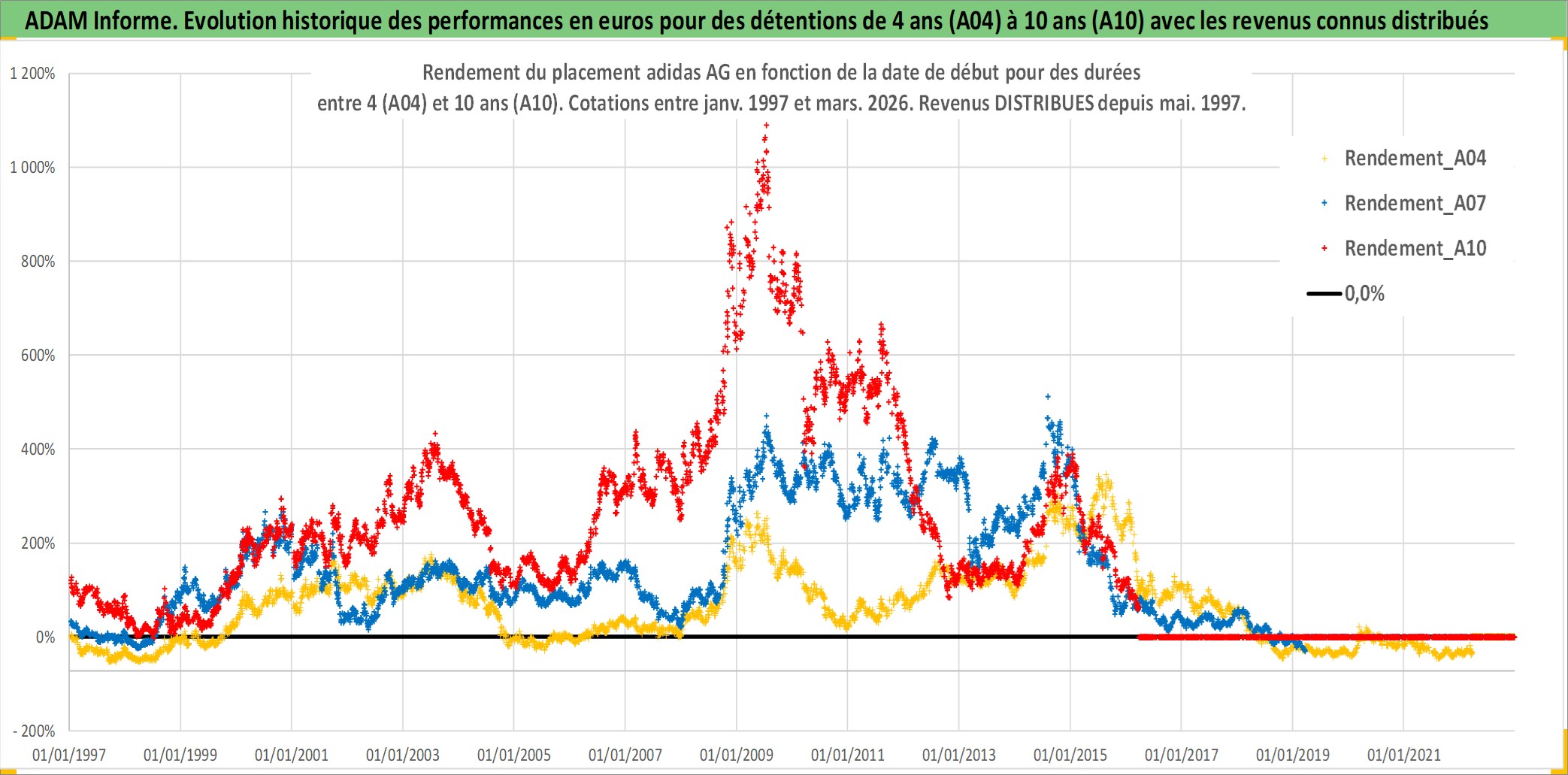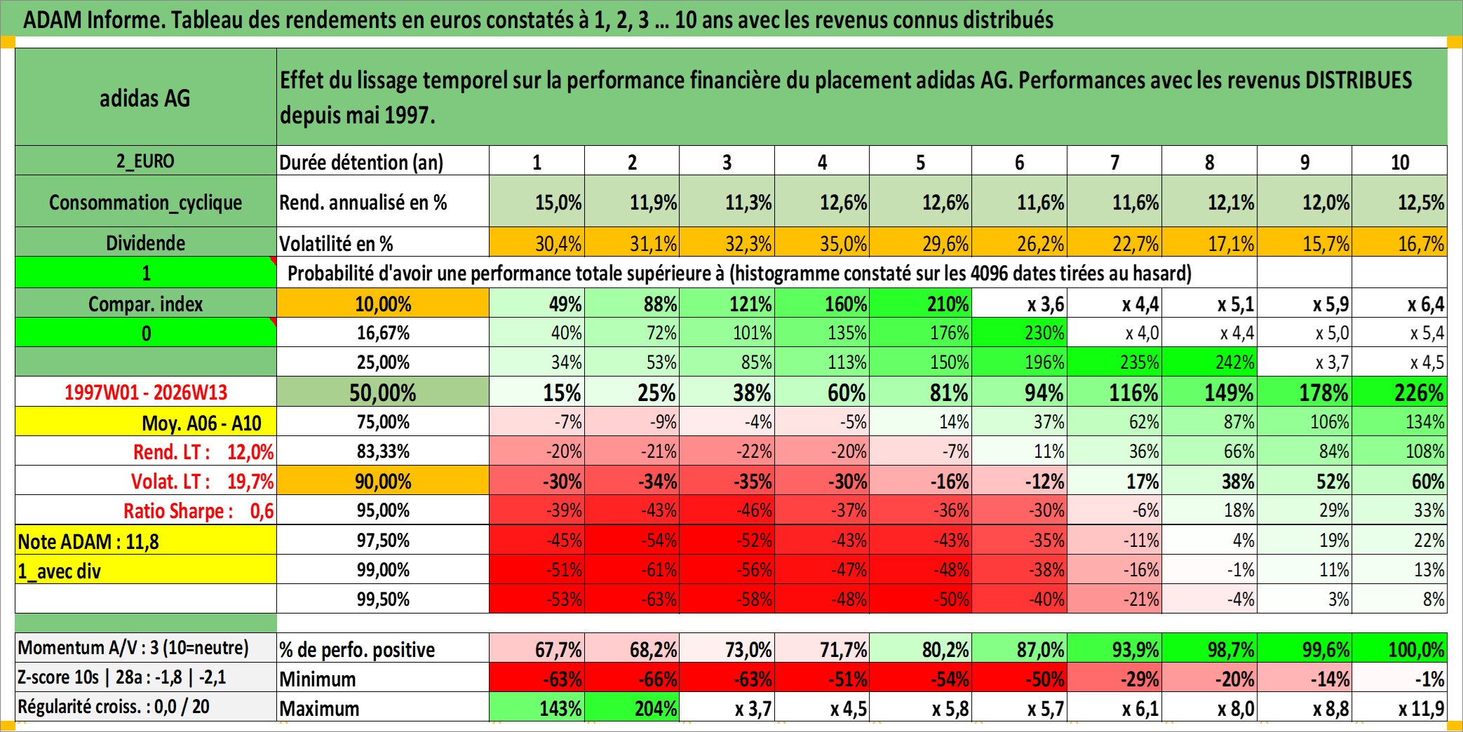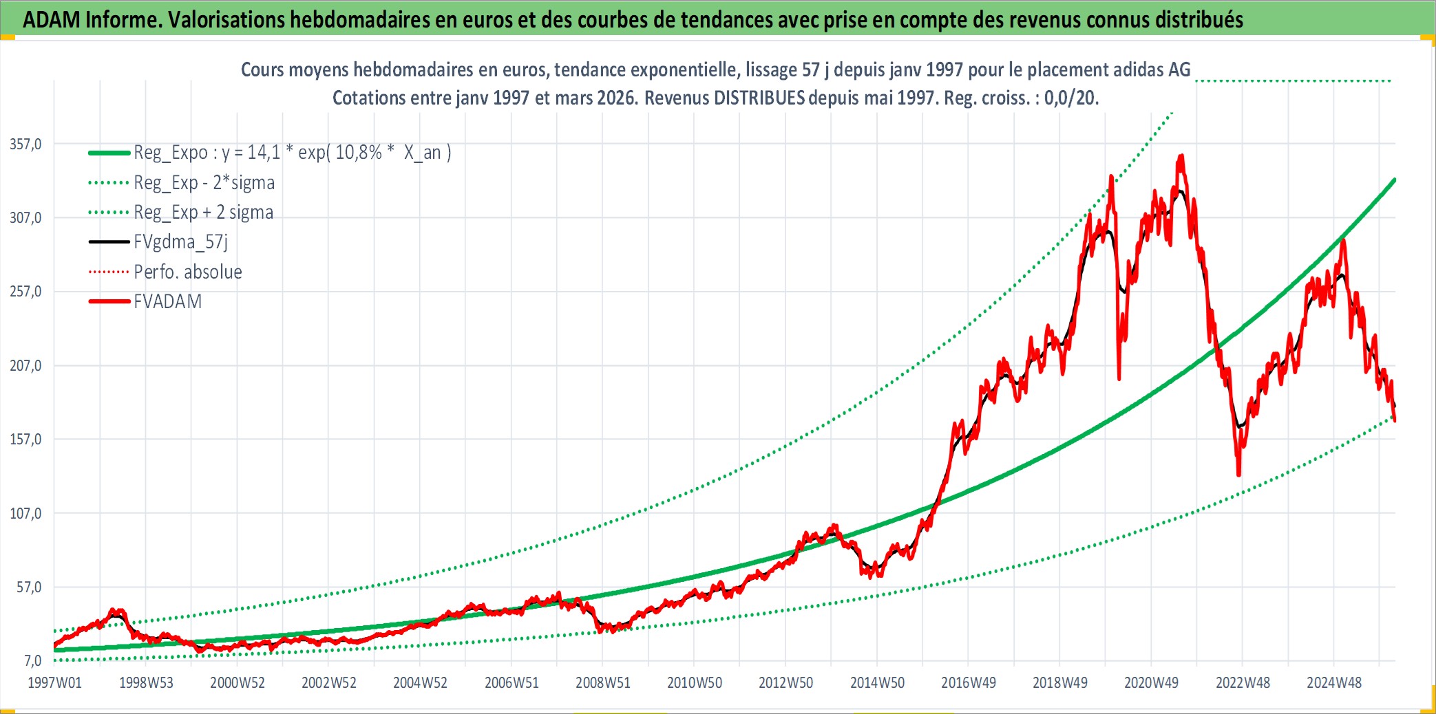 Site dédié aux investisseursPage dédiée sur site financeAnalyse des valorisations hebdomadaires de l'action adidas AG. Cet actif est cote en EUR. Les valorisations couvrent les semaines 1997W01 a 2026W13. Les revenus de cet actif financier sont pris en compte depuis la semaine 1997W22. La note globale ESG de cet actif est estimee a 15.0 (apres rebasage entre 0 et 20).