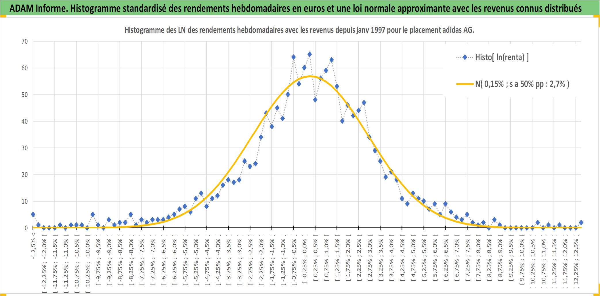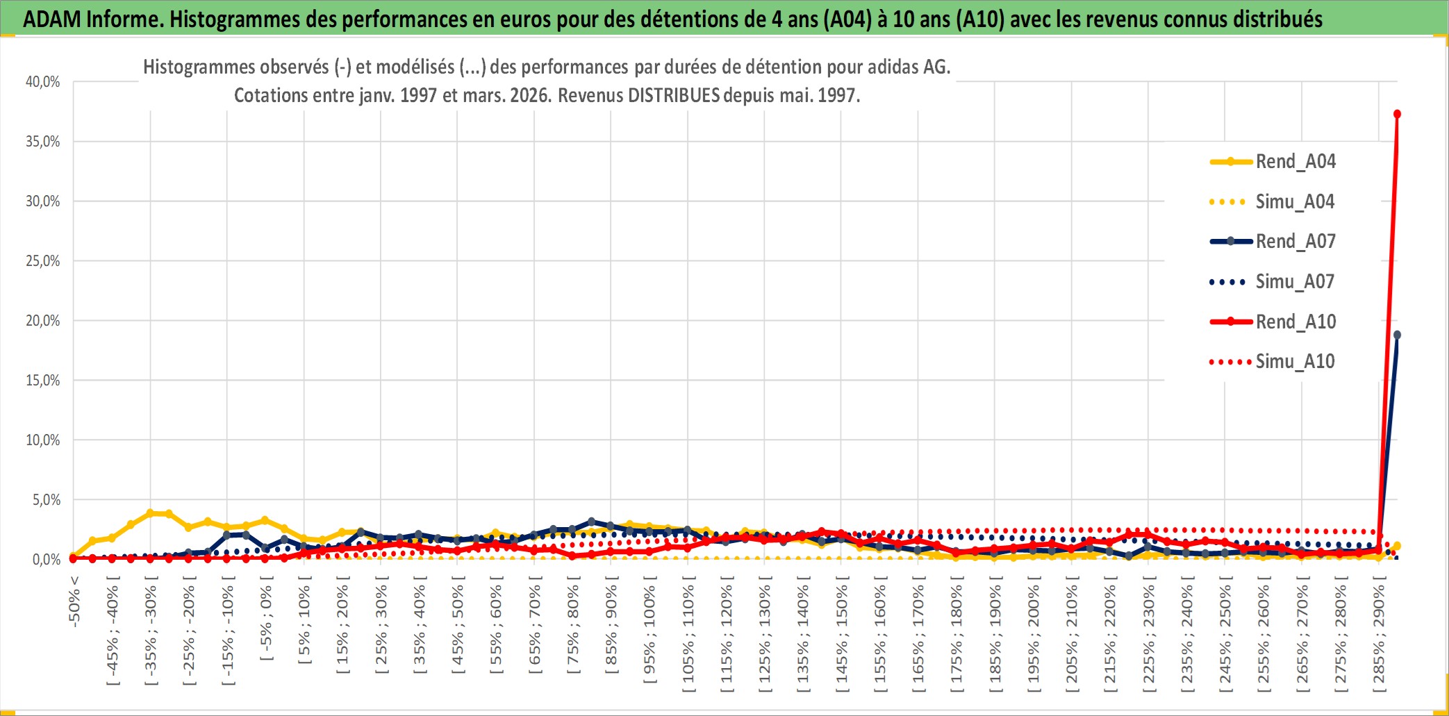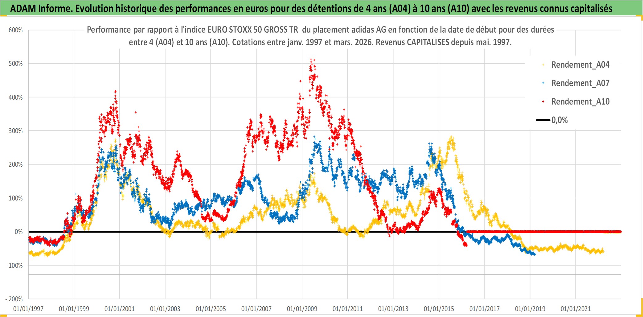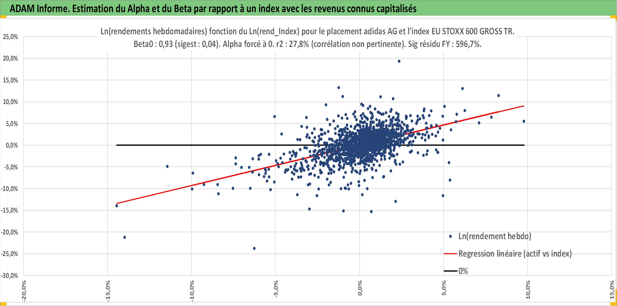 Site dédié aux investisseursPage dédiée sur site financeAnalyse des valorisations hebdomadaires de l'action adidas AG. Cet actif est cote en EUR. Les valorisations couvrent les semaines 1997W01 a 2026W13. Les revenus de cet actif financier sont pris en compte depuis la semaine 1997W22. La note globale ESG de cet actif est estimee a 15.0 (apres rebasage entre 0 et 20).