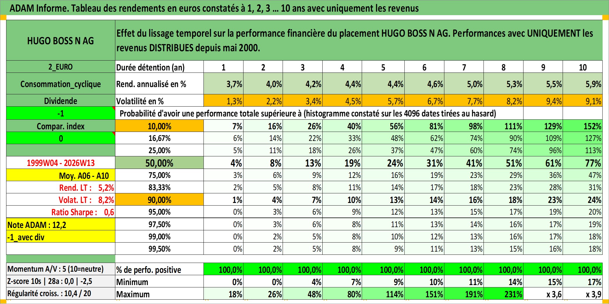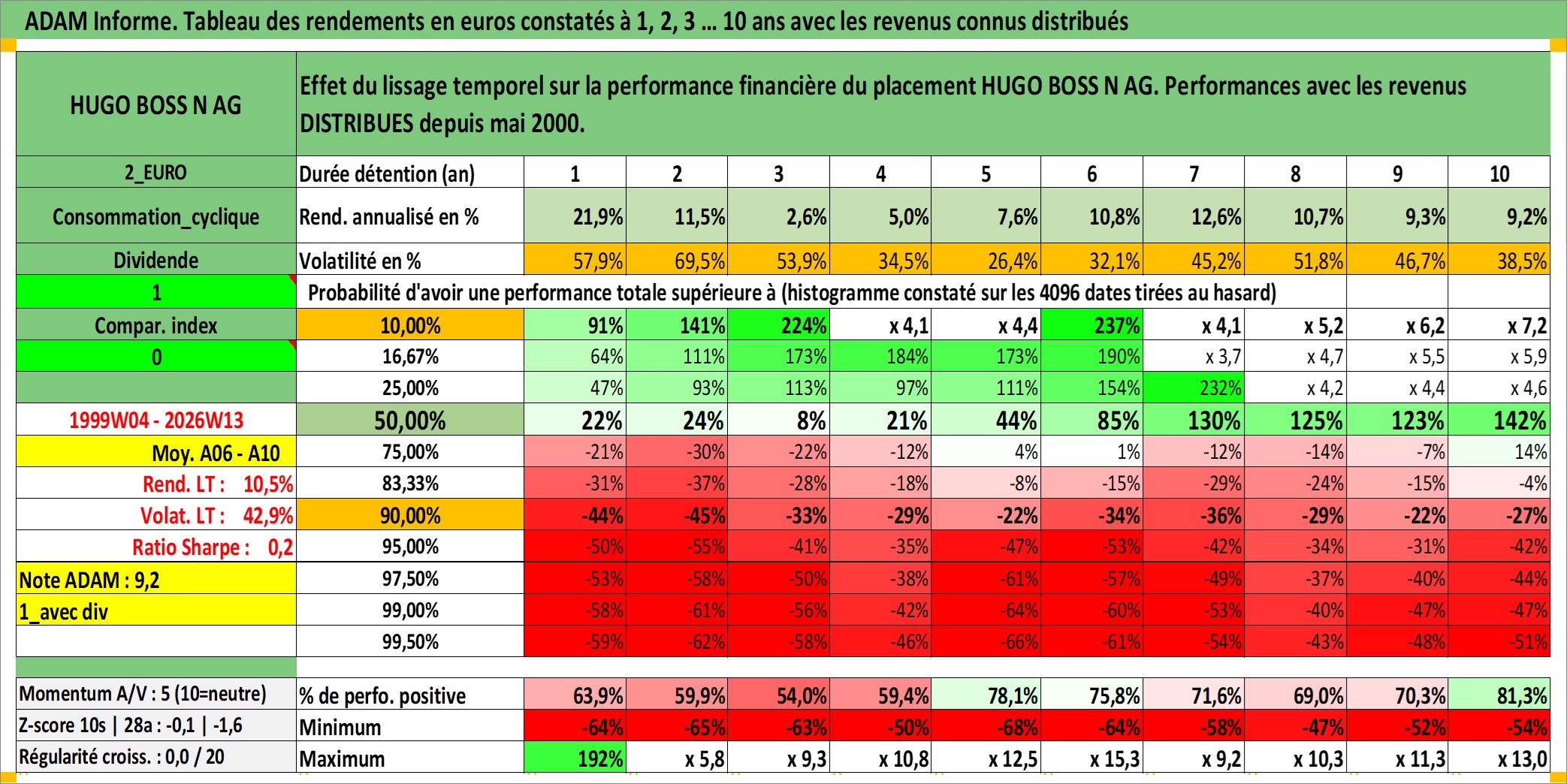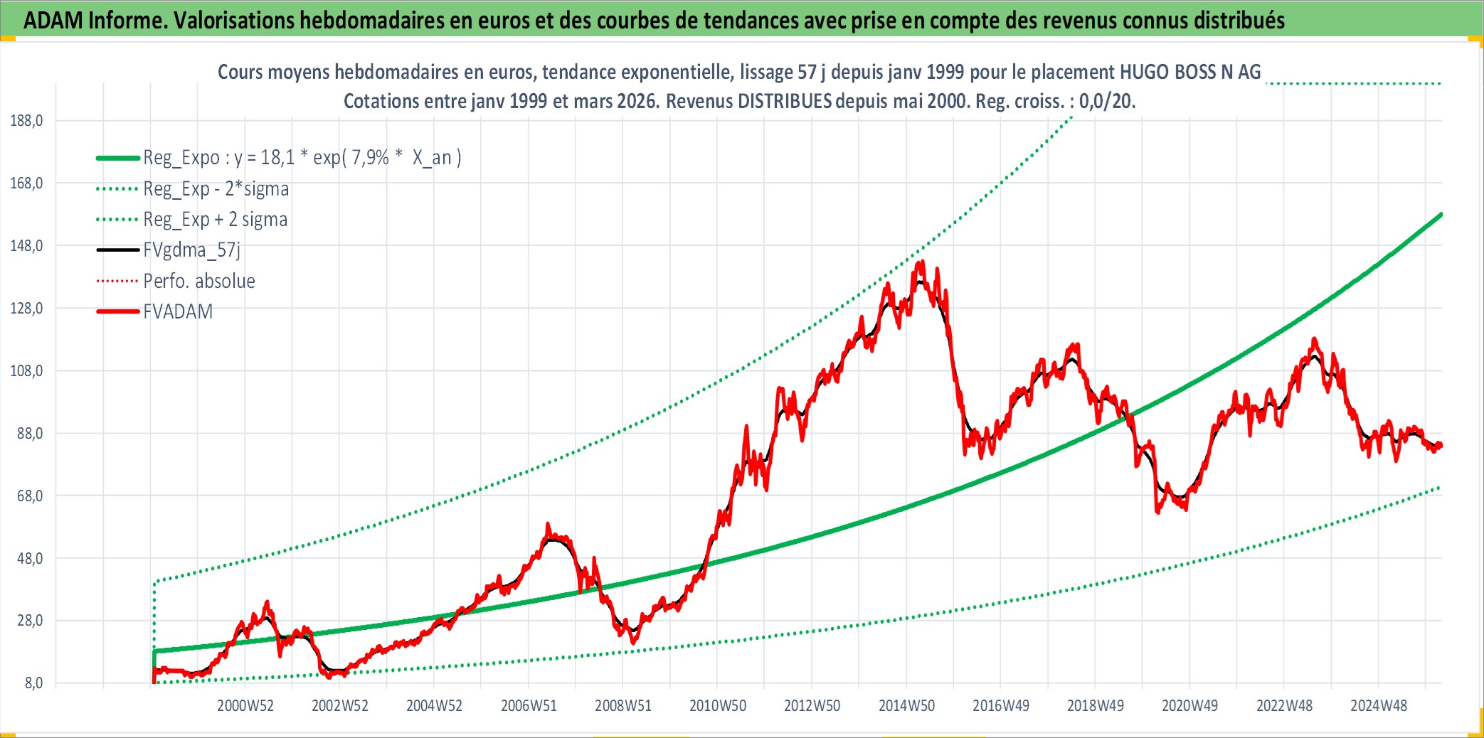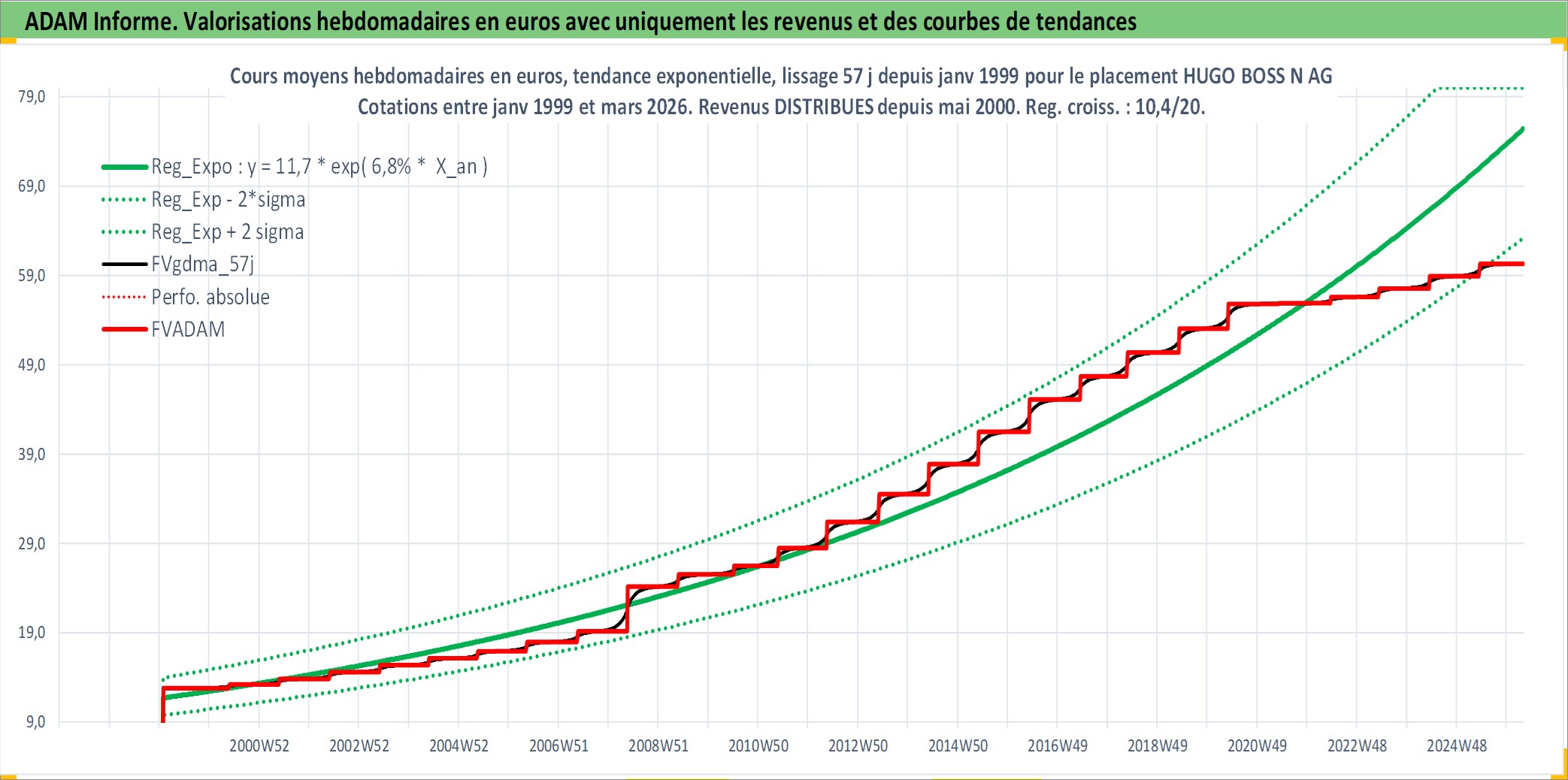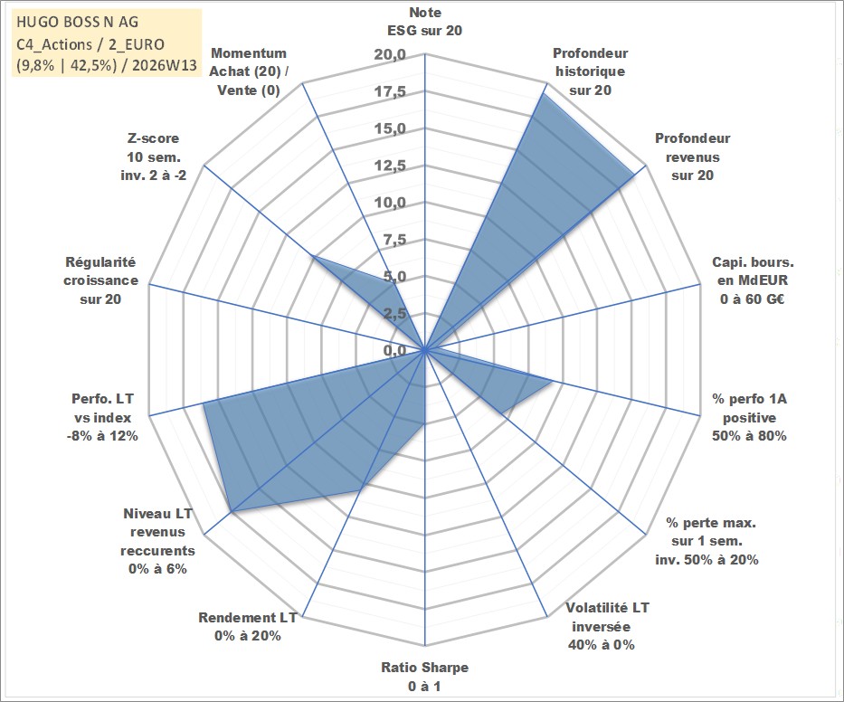 Site dédié aux investisseursPage dédiée sur site financeAnalyse des valorisations hebdomadaires de l'action HUGO BOSS N AG. Cet actif est cote en EUR. Les valorisations couvrent les semaines 1999W04 a 2026W13. Les revenus de cet actif financier sont pris en compte depuis la semaine 2000W21. La note ESG de cet actif n'est pas connue.