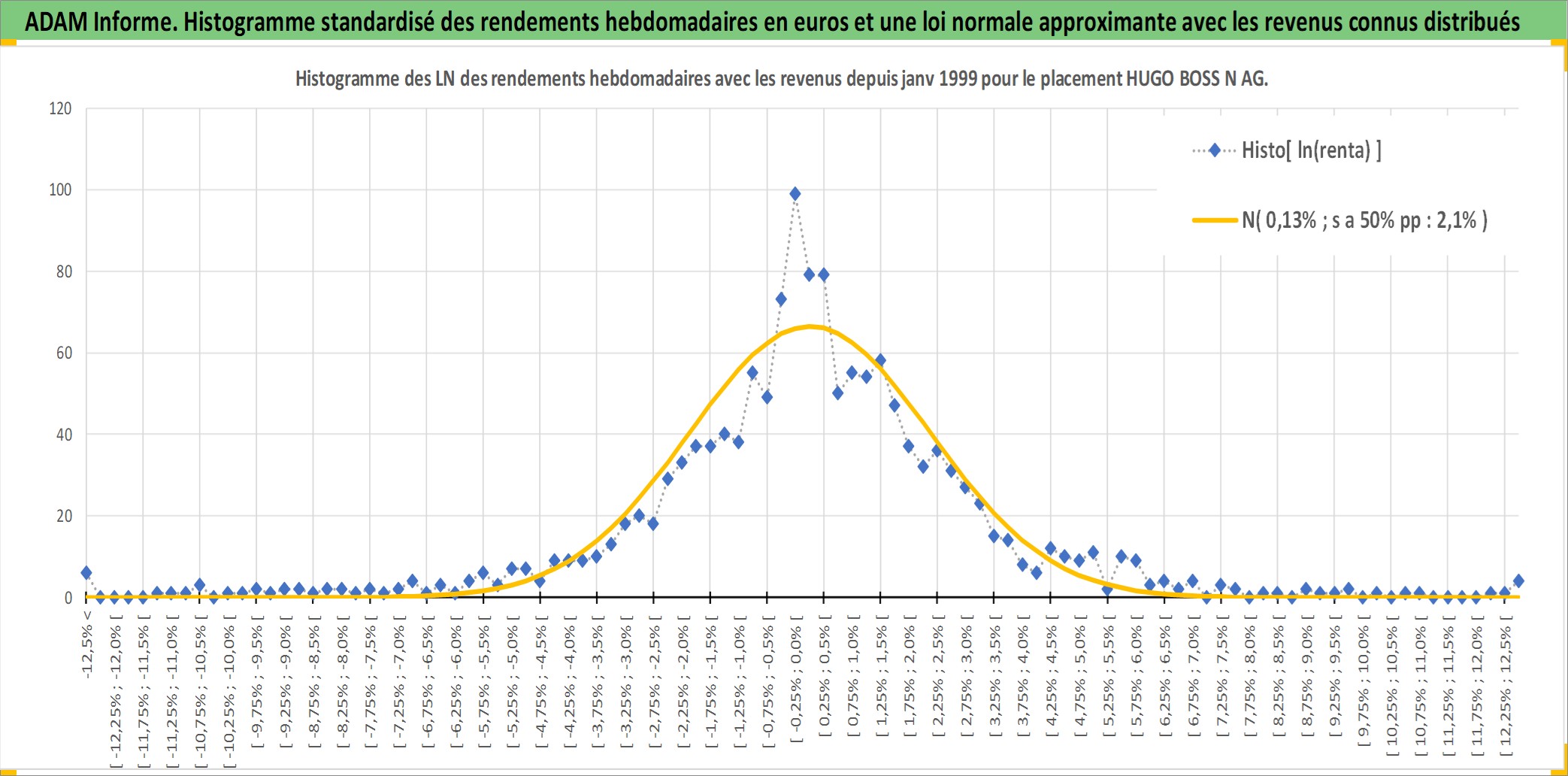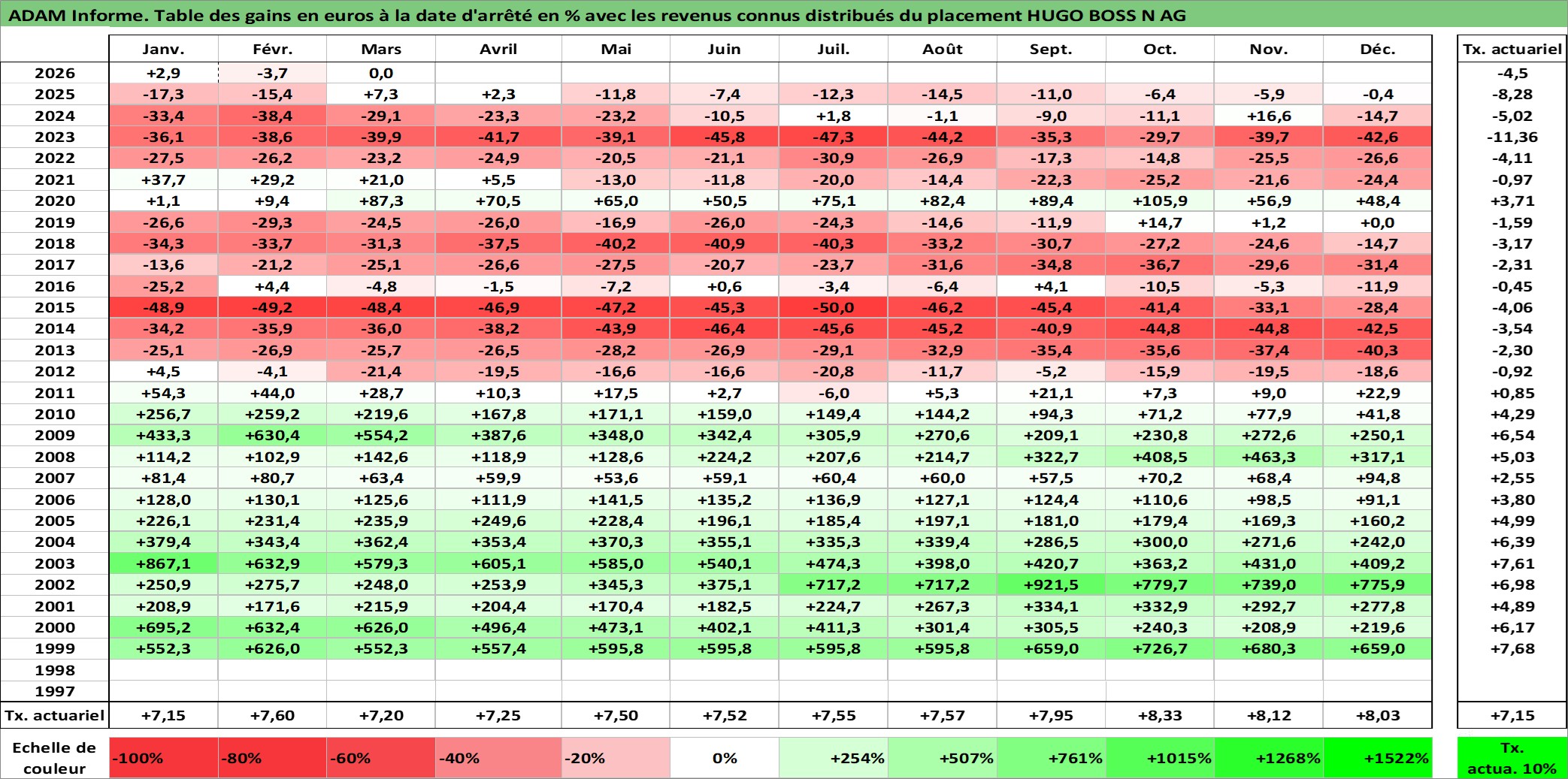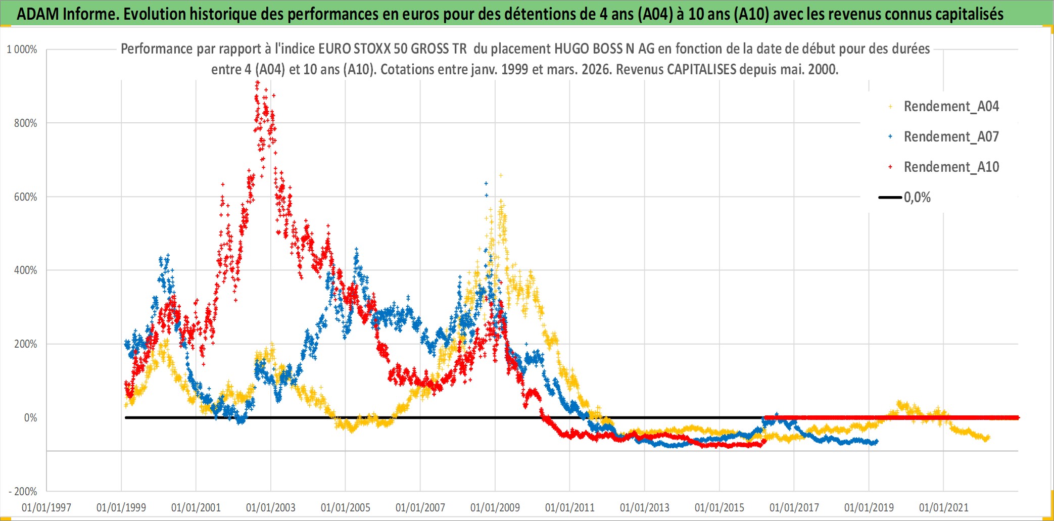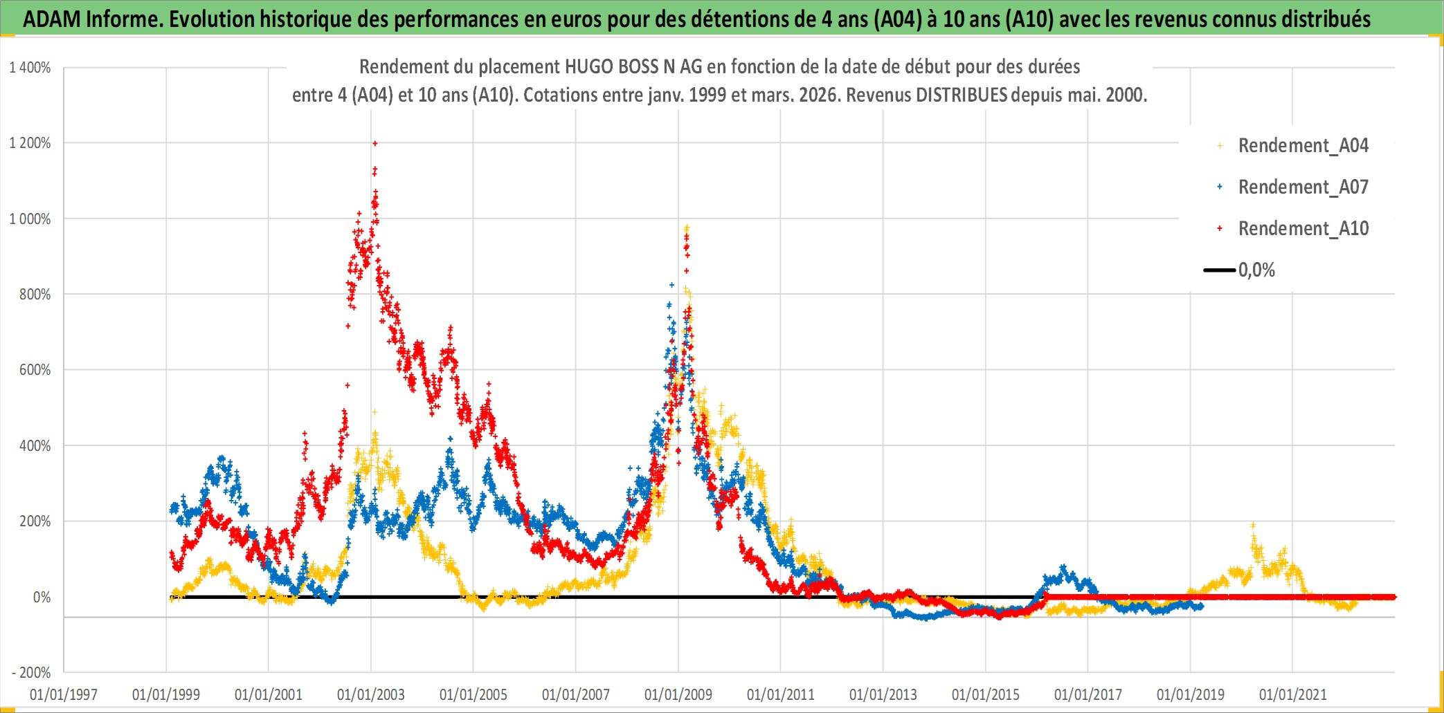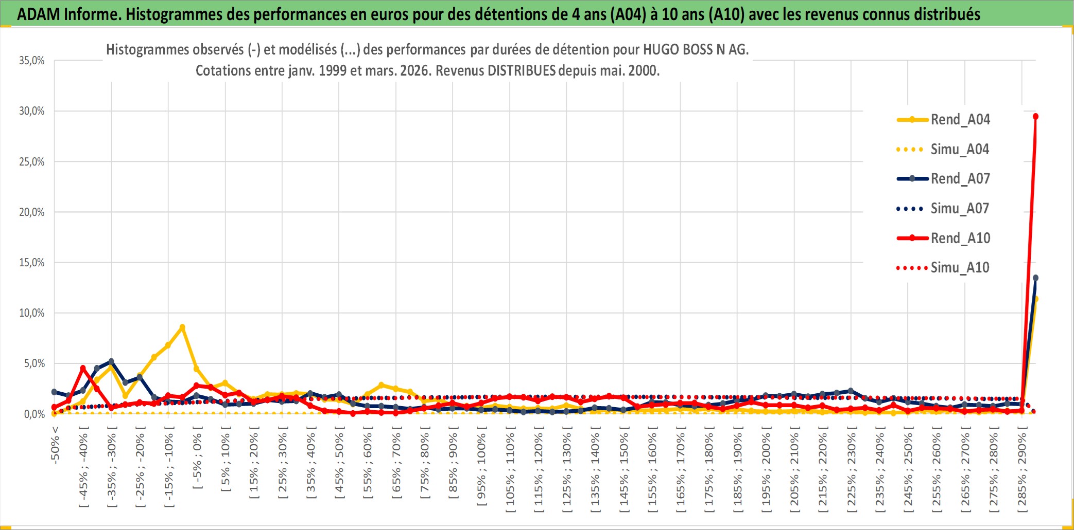 Site dédié aux investisseursPage dédiée sur site financeAnalyse des valorisations hebdomadaires de l'action HUGO BOSS N AG. Cet actif est cote en EUR. Les valorisations couvrent les semaines 1999W04 a 2026W13. Les revenus de cet actif financier sont pris en compte depuis la semaine 2000W21. La note ESG de cet actif n'est pas connue.