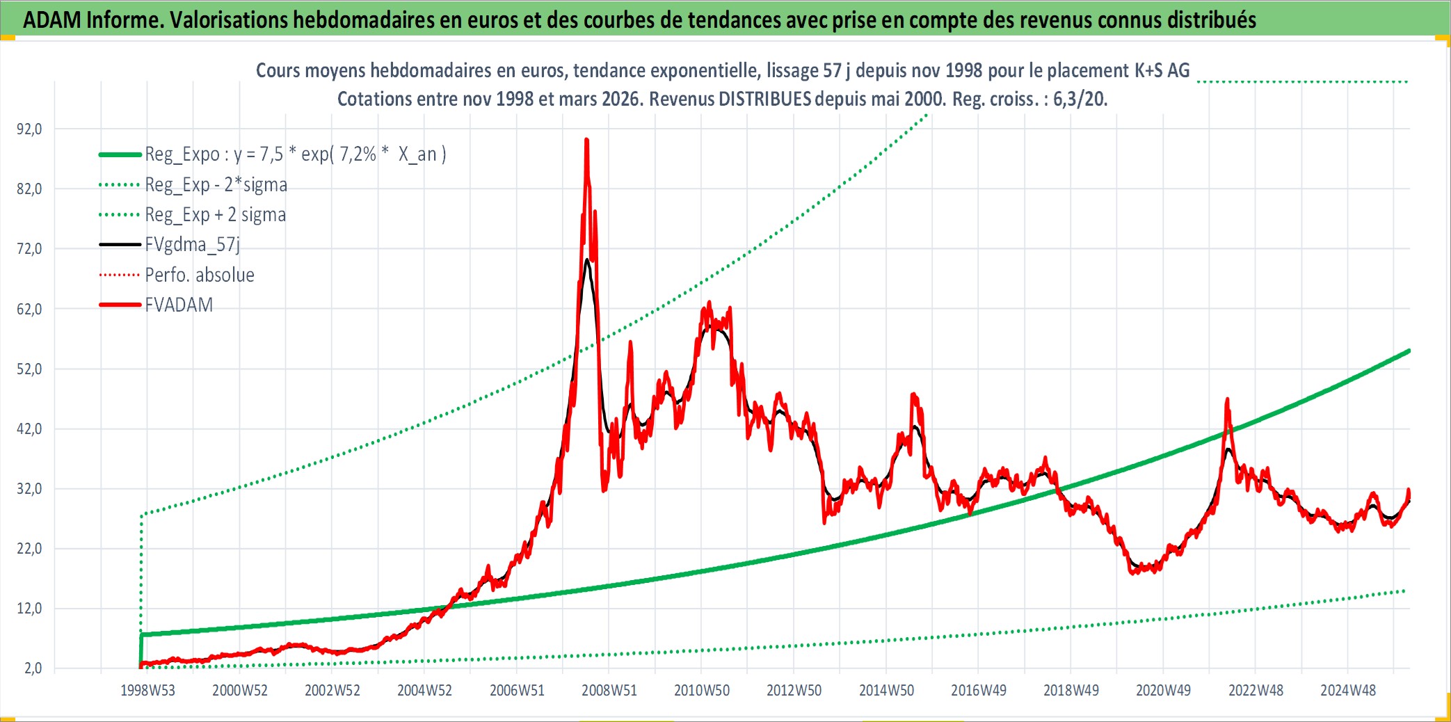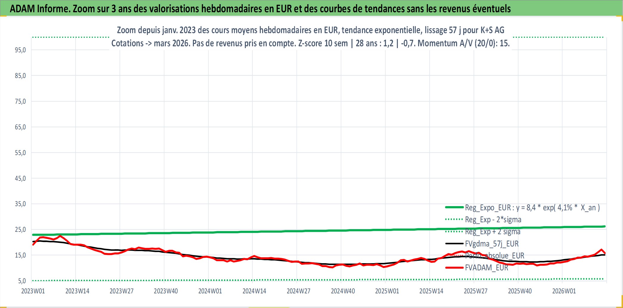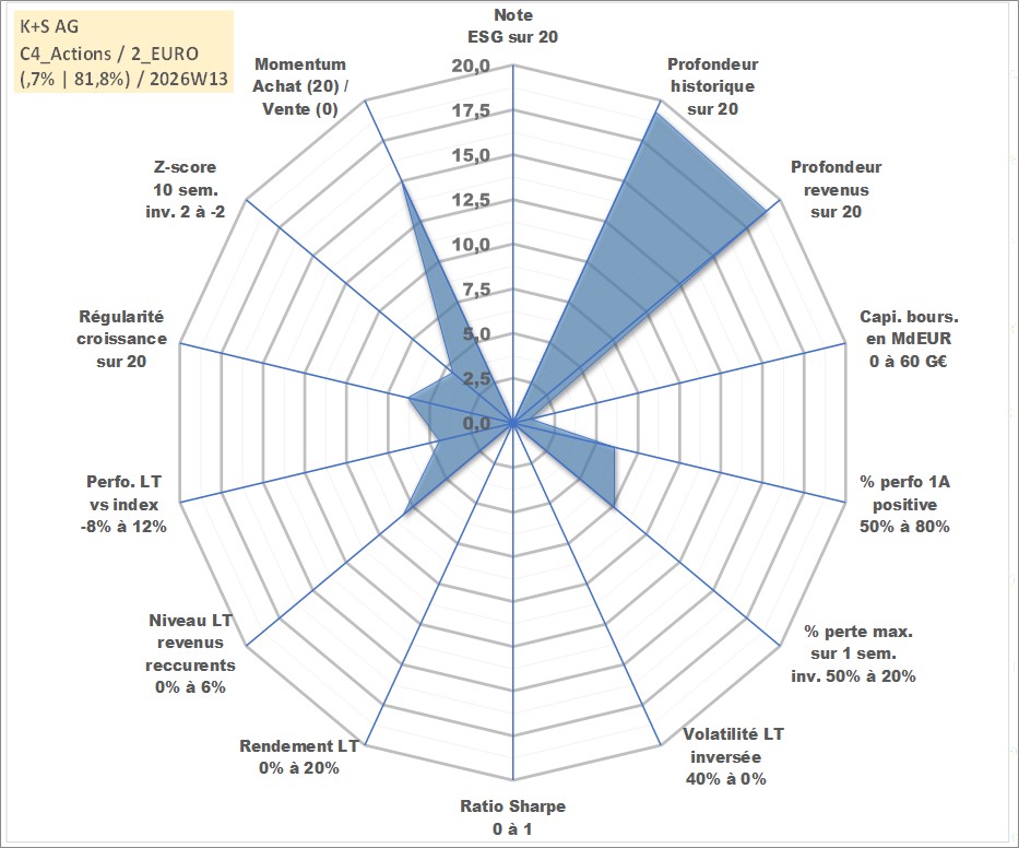 Site dédié aux investisseursPage dédiée sur site financeAnalyse des valorisations hebdomadaires de l'action K+S AG. Cet actif est cote en EUR. Les valorisations couvrent les semaines 1998W46 a 2026W13. Les revenus de cet actif financier sont pris en compte depuis la semaine 2000W19. La note ESG de cet actif n'est pas connue.