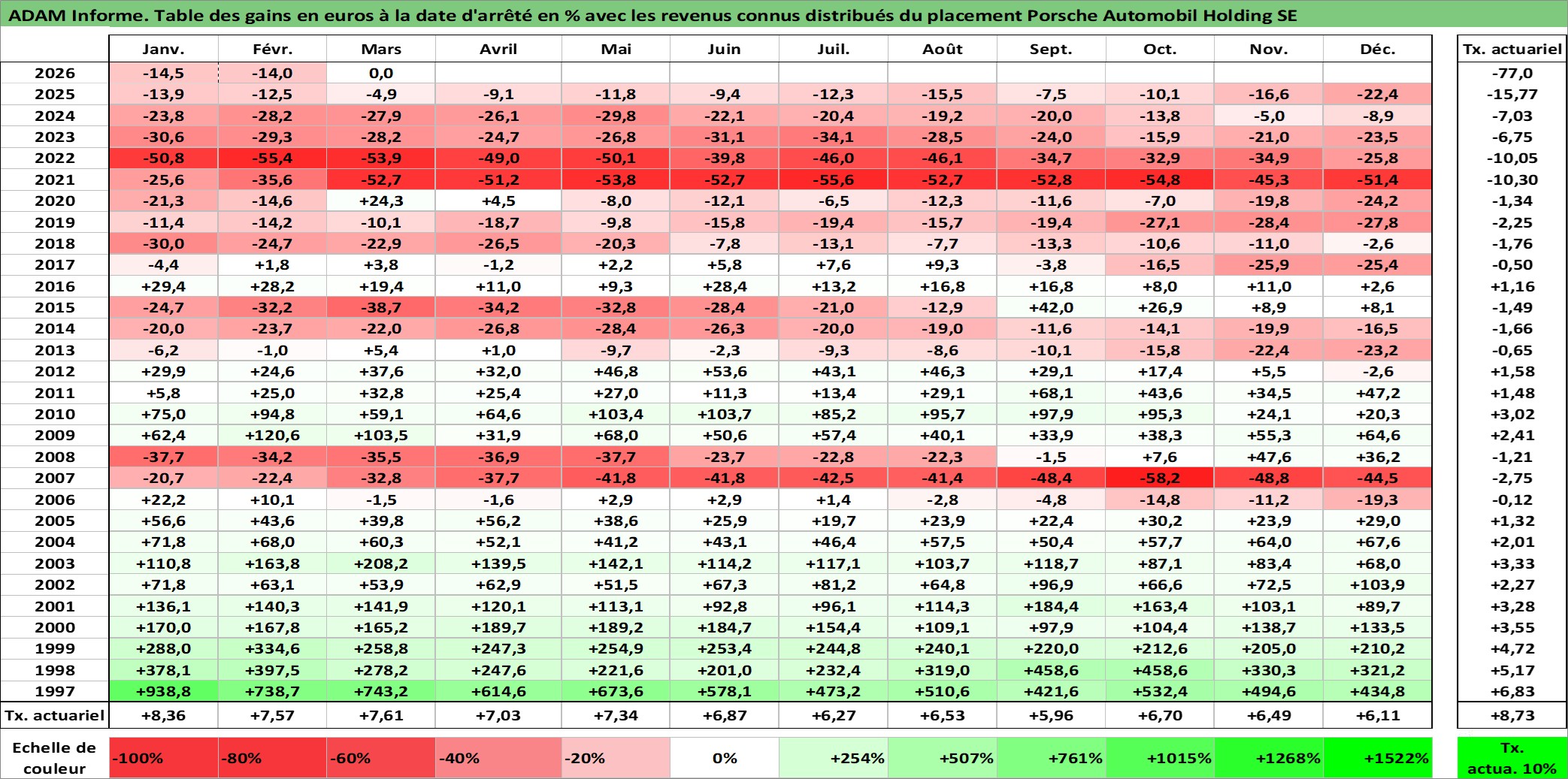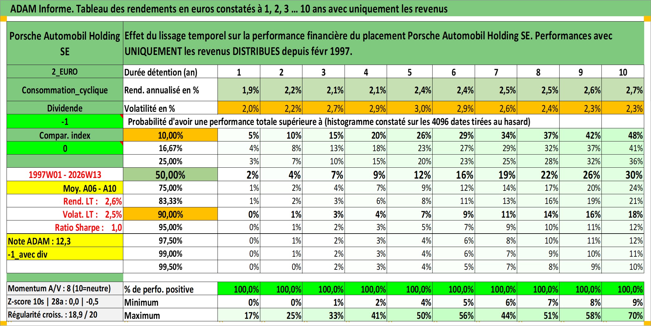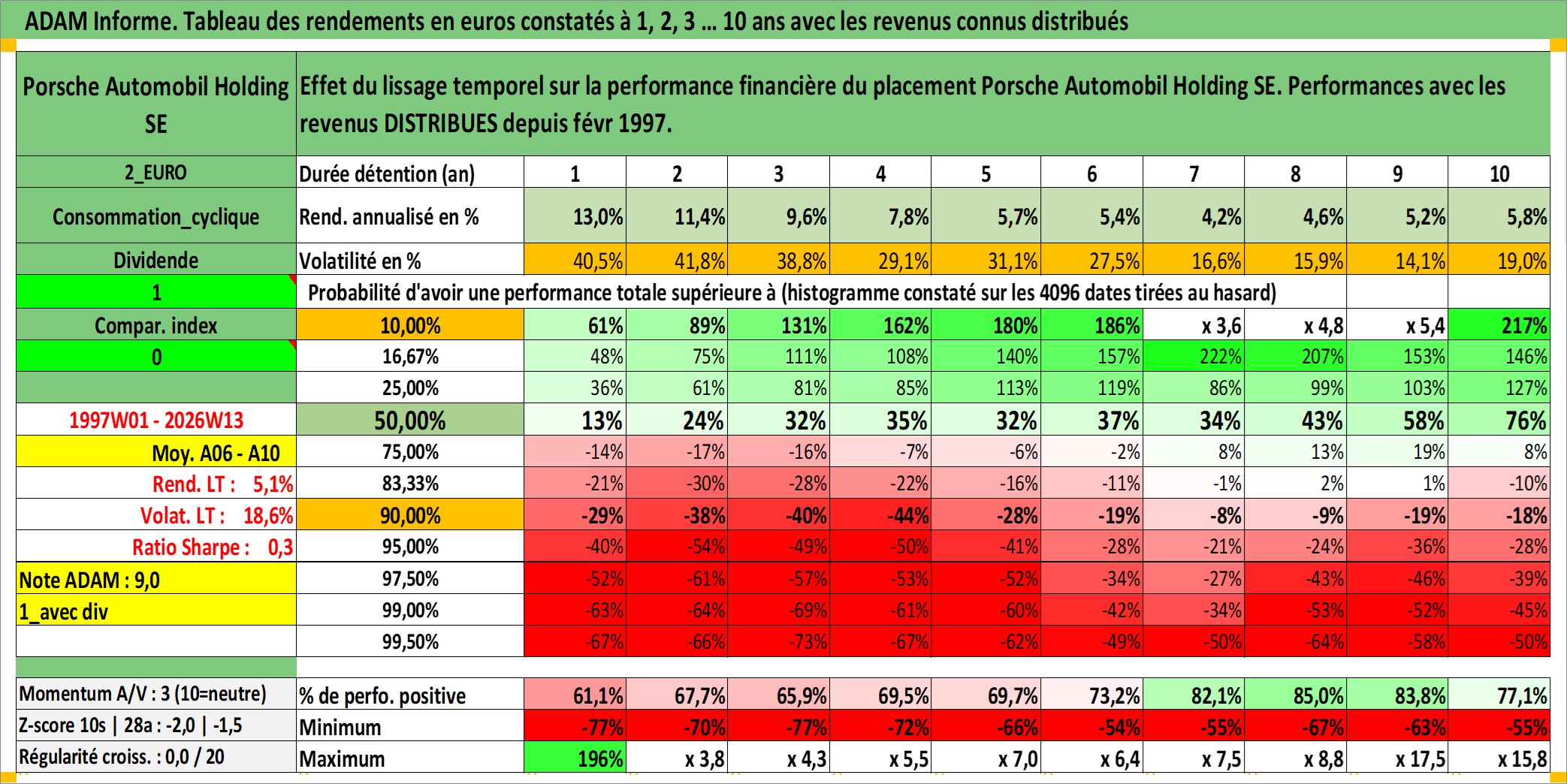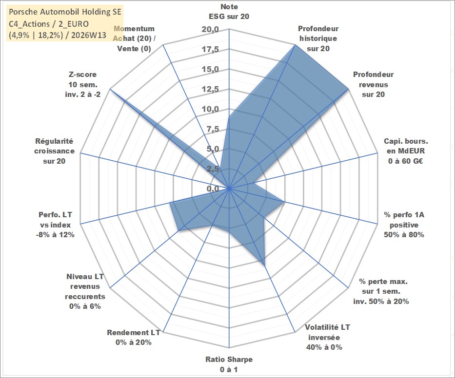 Site dédié aux investisseursPage dédiée sur site financeAnalyse des valorisations hebdomadaires de l'action Porsche Automobil Holding SE. Cet actif est cote en EUR. Les valorisations couvrent les semaines 1997W01 a 2026W13. Les revenus de cet actif financier sont pris en compte depuis la semaine 1997W06. La note globale ESG de cet actif est estimee a 9.0 (apres rebasage entre 0 et 20).