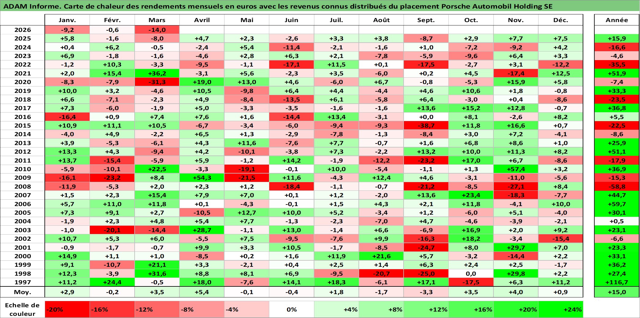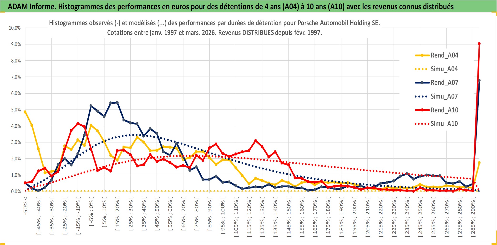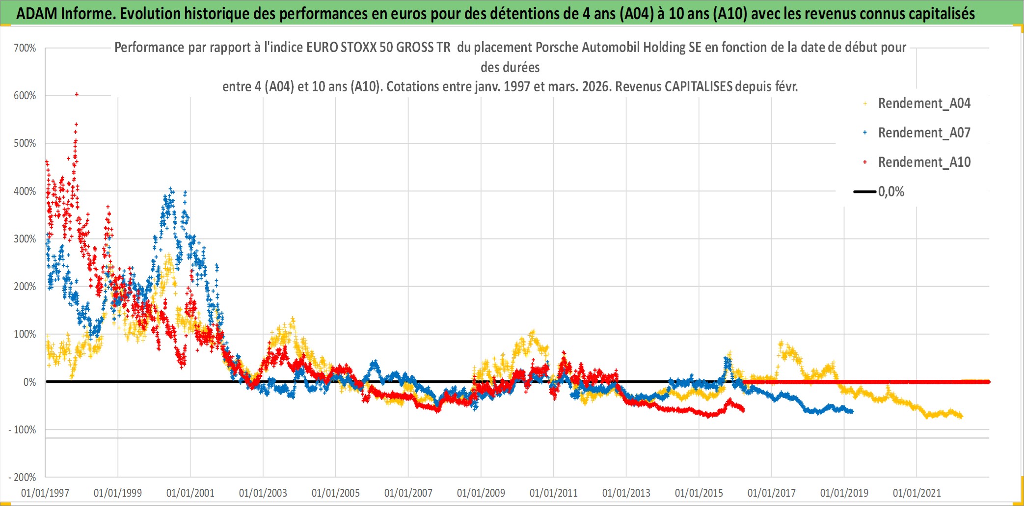 Site dédié aux investisseursPage dédiée sur site financeAnalyse des valorisations hebdomadaires de l'action Porsche Automobil Holding SE. Cet actif est cote en EUR. Les valorisations couvrent les semaines 1997W01 a 2026W13. Les revenus de cet actif financier sont pris en compte depuis la semaine 1997W06. La note globale ESG de cet actif est estimee a 9.0 (apres rebasage entre 0 et 20).