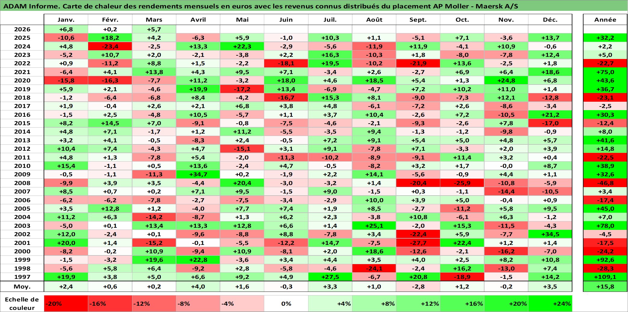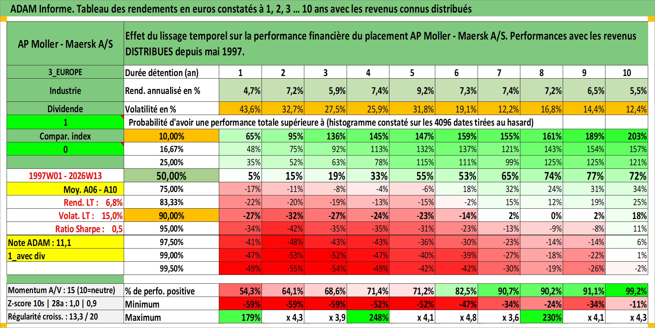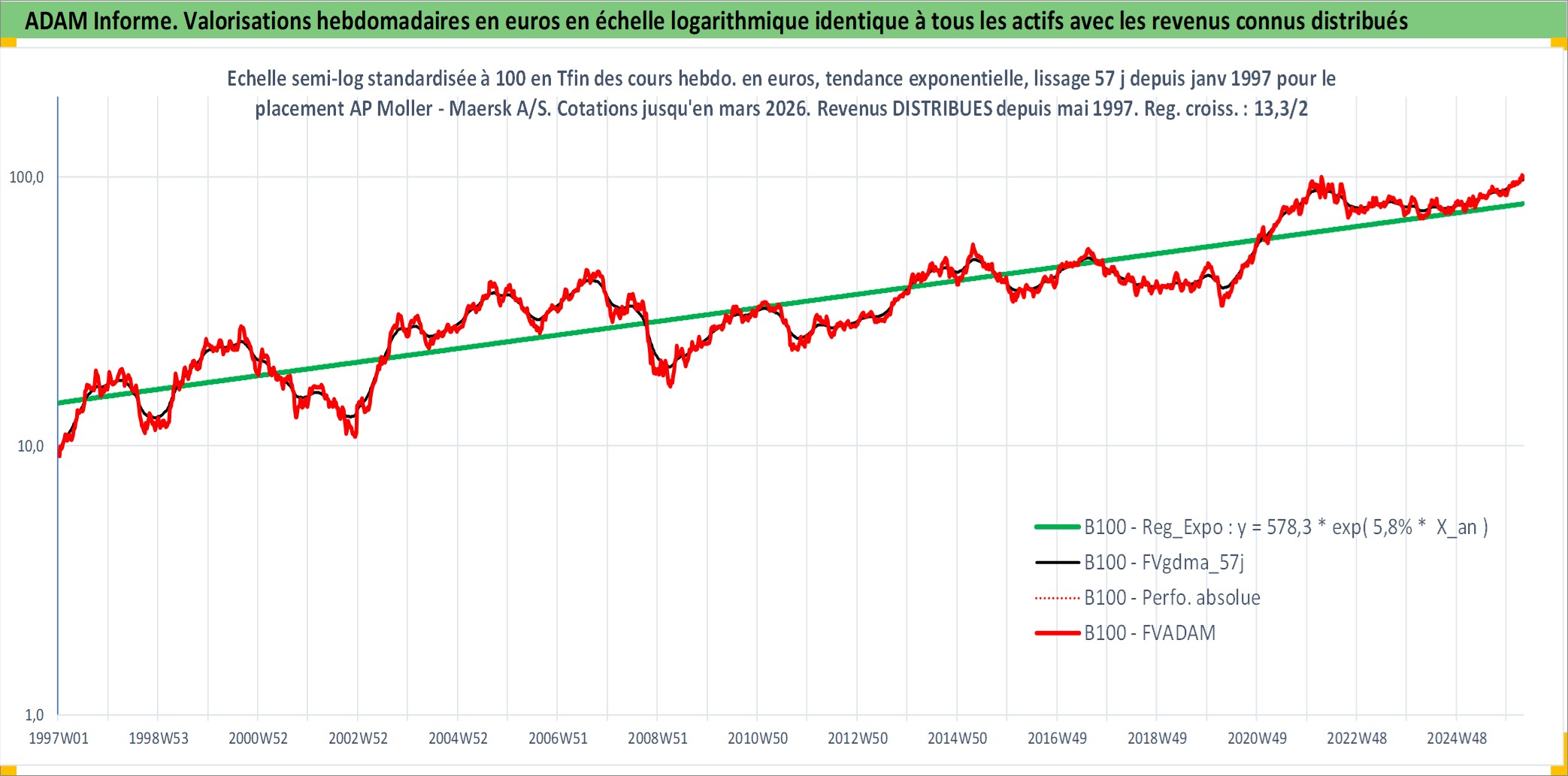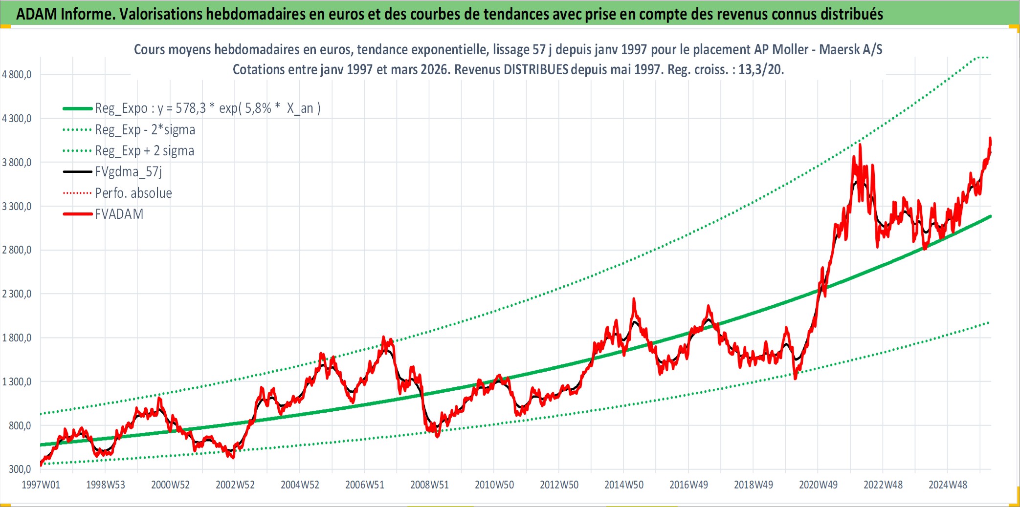 Site dédié aux investisseursPage dédiée sur site financeAnalyse des valorisations hebdomadaires de l'action AP Moller - Maersk A/S. Cet actif est cote en DKK. Les valorisations sont en contrevaleur EURO et couvrent les semaines 1997W01 a 2026W13. Les revenus de cet actif financier sont pris en compte depuis la semaine 1997W20. La note globale ESG de cet actif est estimee a 9.0 (apres rebasage entre 0 et 20).