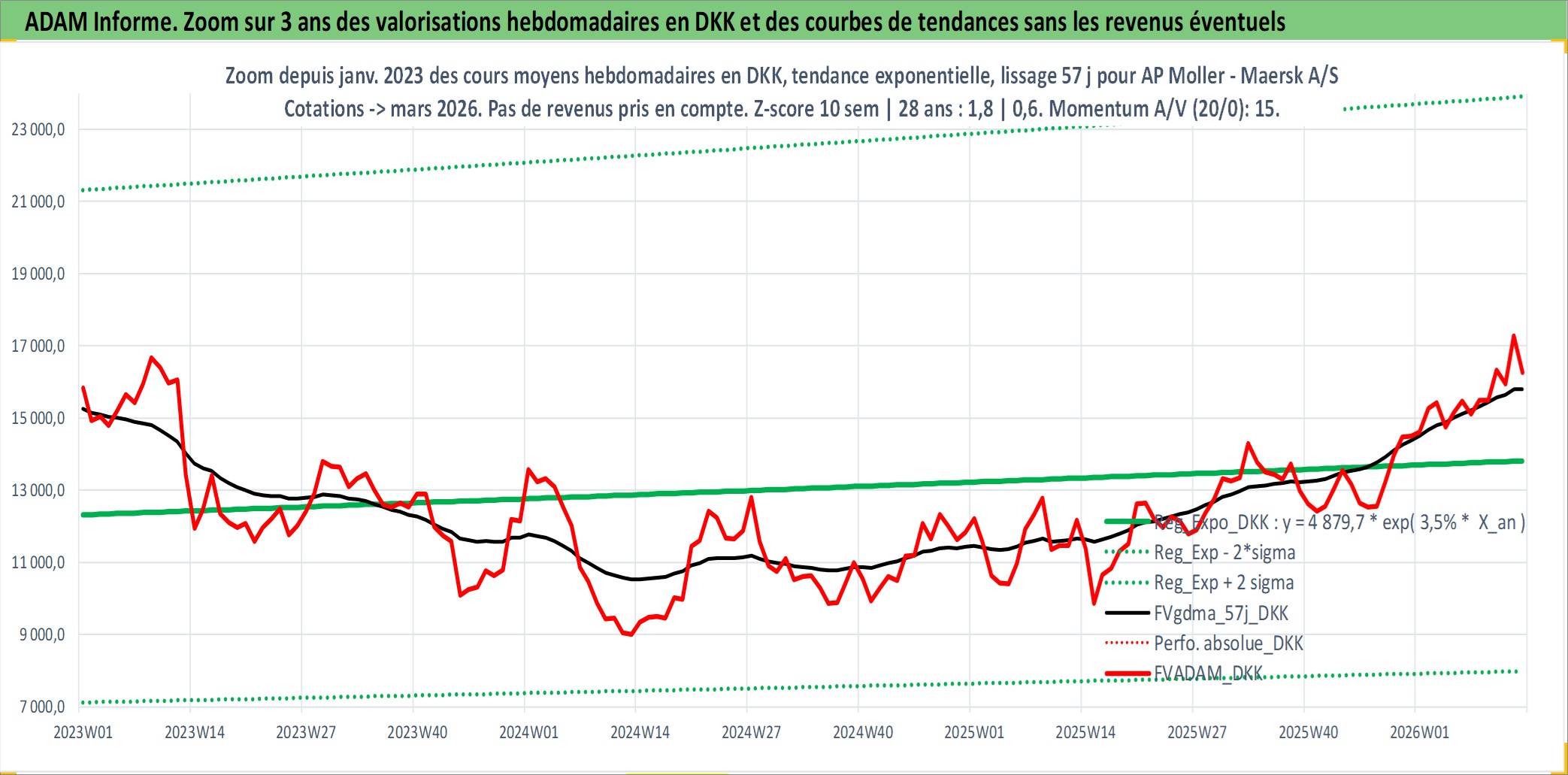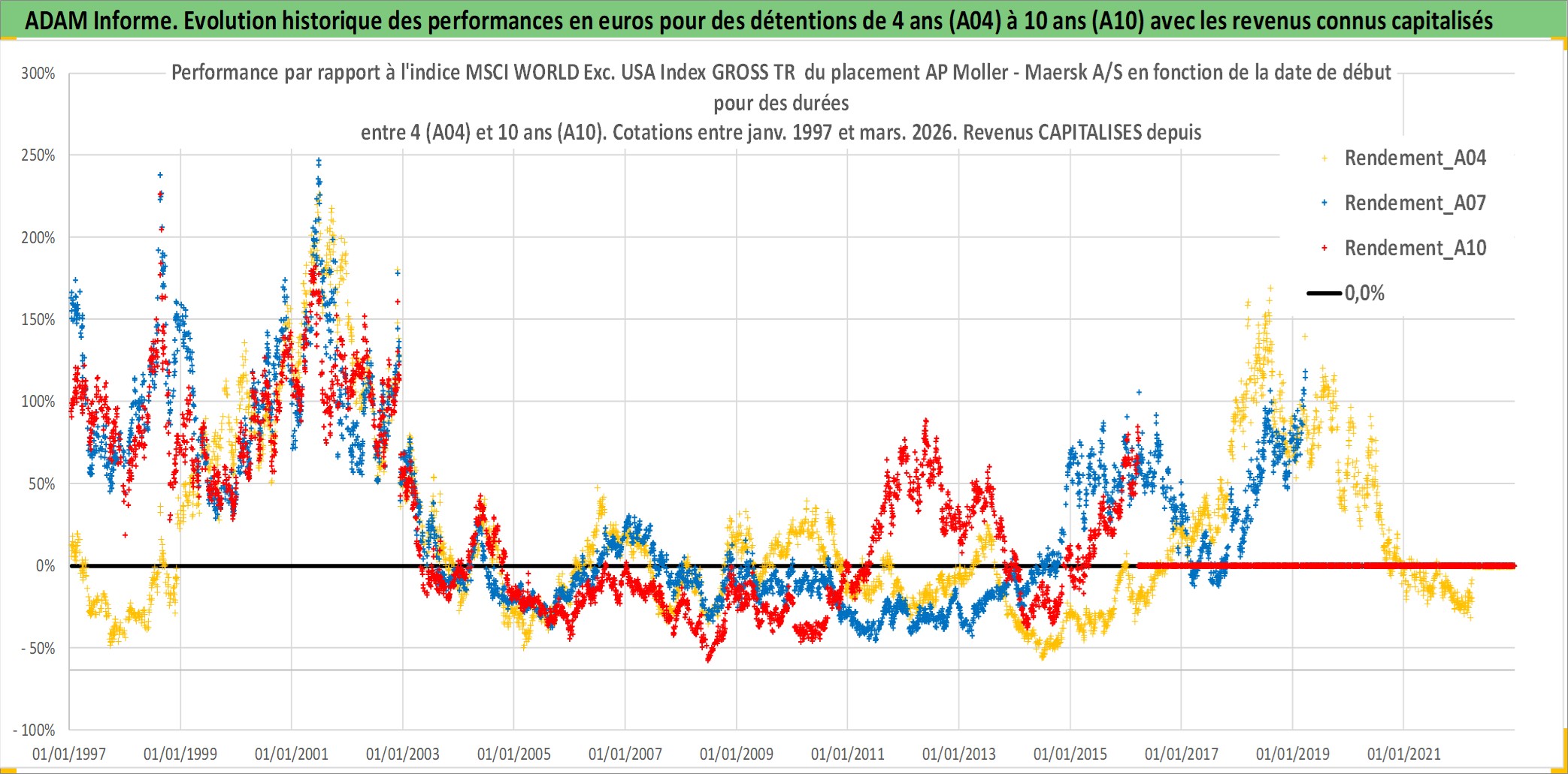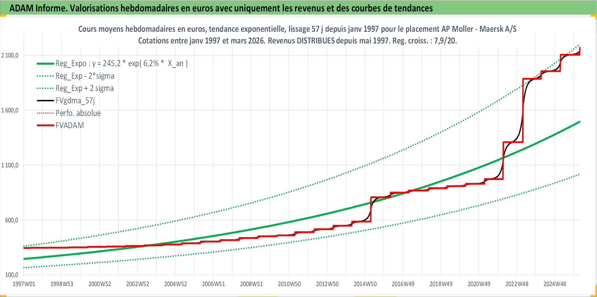 Site dédié aux investisseursPage dédiée sur site financeAnalyse des valorisations hebdomadaires de l'action AP Moller - Maersk A/S. Cet actif est cote en DKK. Les valorisations sont en contrevaleur EURO et couvrent les semaines 1997W01 a 2026W13. Les revenus de cet actif financier sont pris en compte depuis la semaine 1997W20. La note globale ESG de cet actif est estimee a 9.0 (apres rebasage entre 0 et 20).