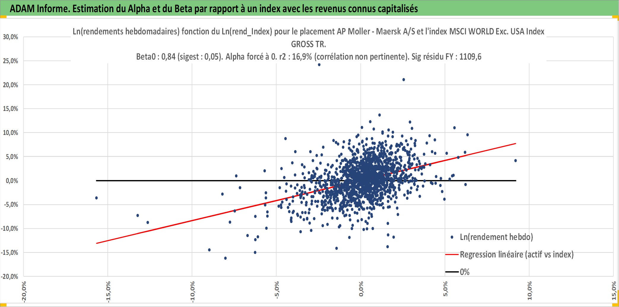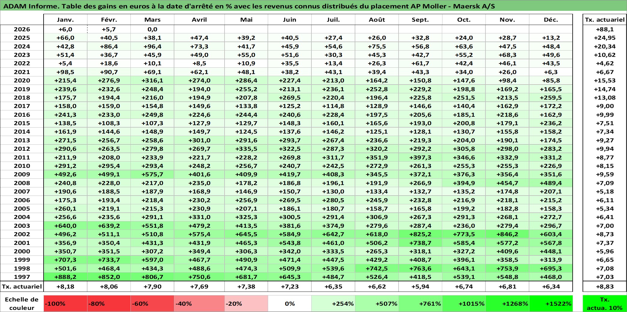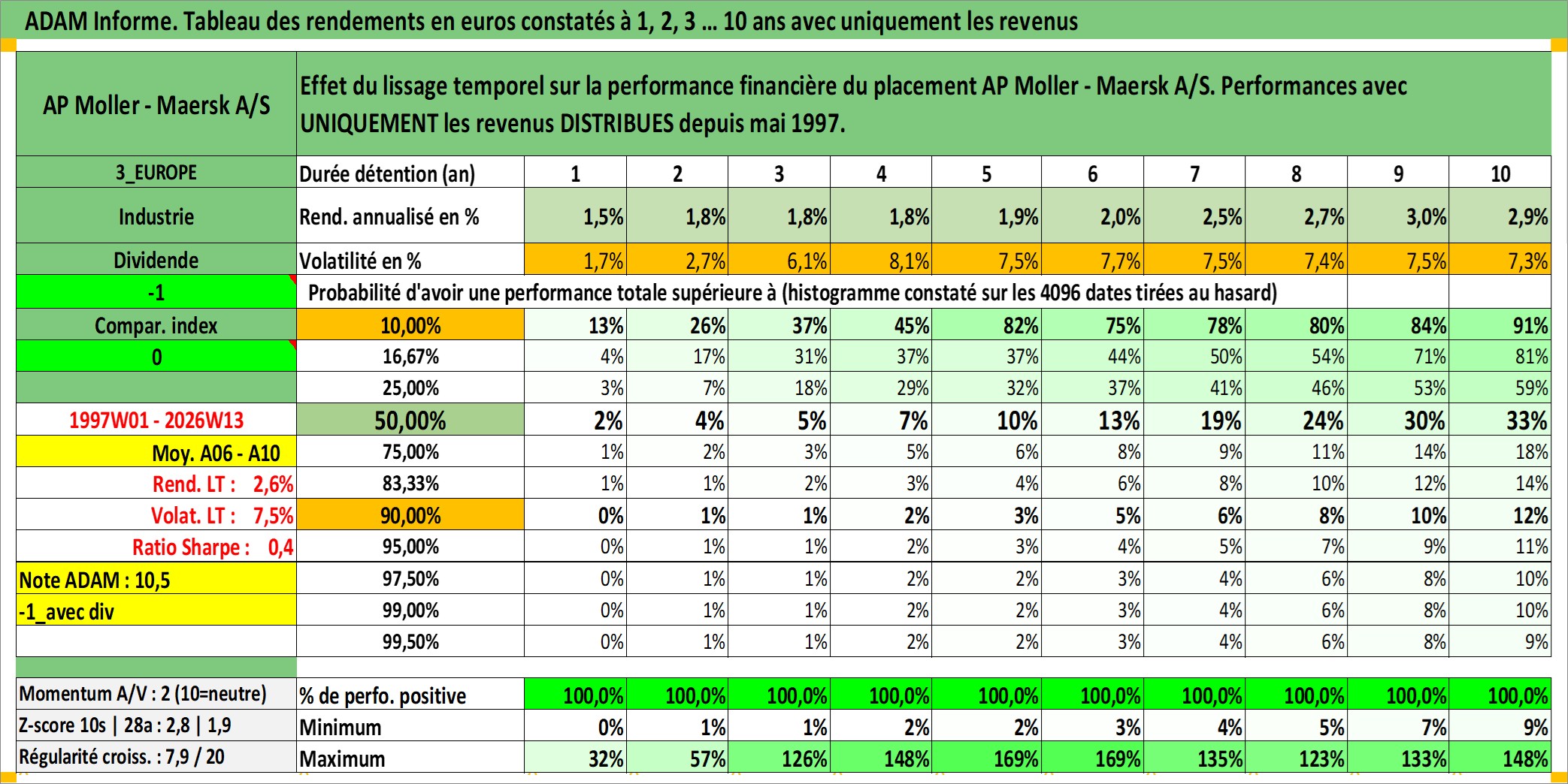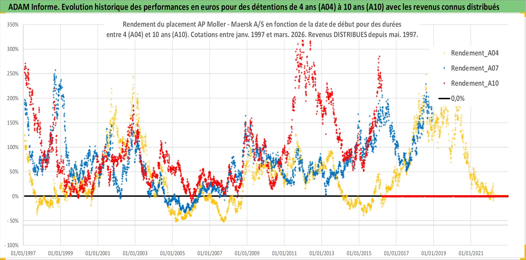 Site dédié aux investisseursPage dédiée sur site financeAnalyse des valorisations hebdomadaires de l'action AP Moller - Maersk A/S. Cet actif est cote en DKK. Les valorisations sont en contrevaleur EURO et couvrent les semaines 1997W01 a 2026W13. Les revenus de cet actif financier sont pris en compte depuis la semaine 1997W20. La note globale ESG de cet actif est estimee a 9.0 (apres rebasage entre 0 et 20).