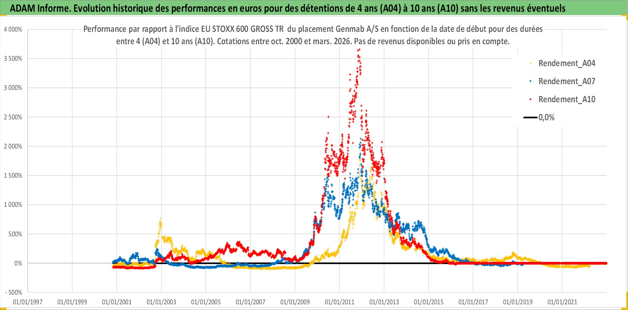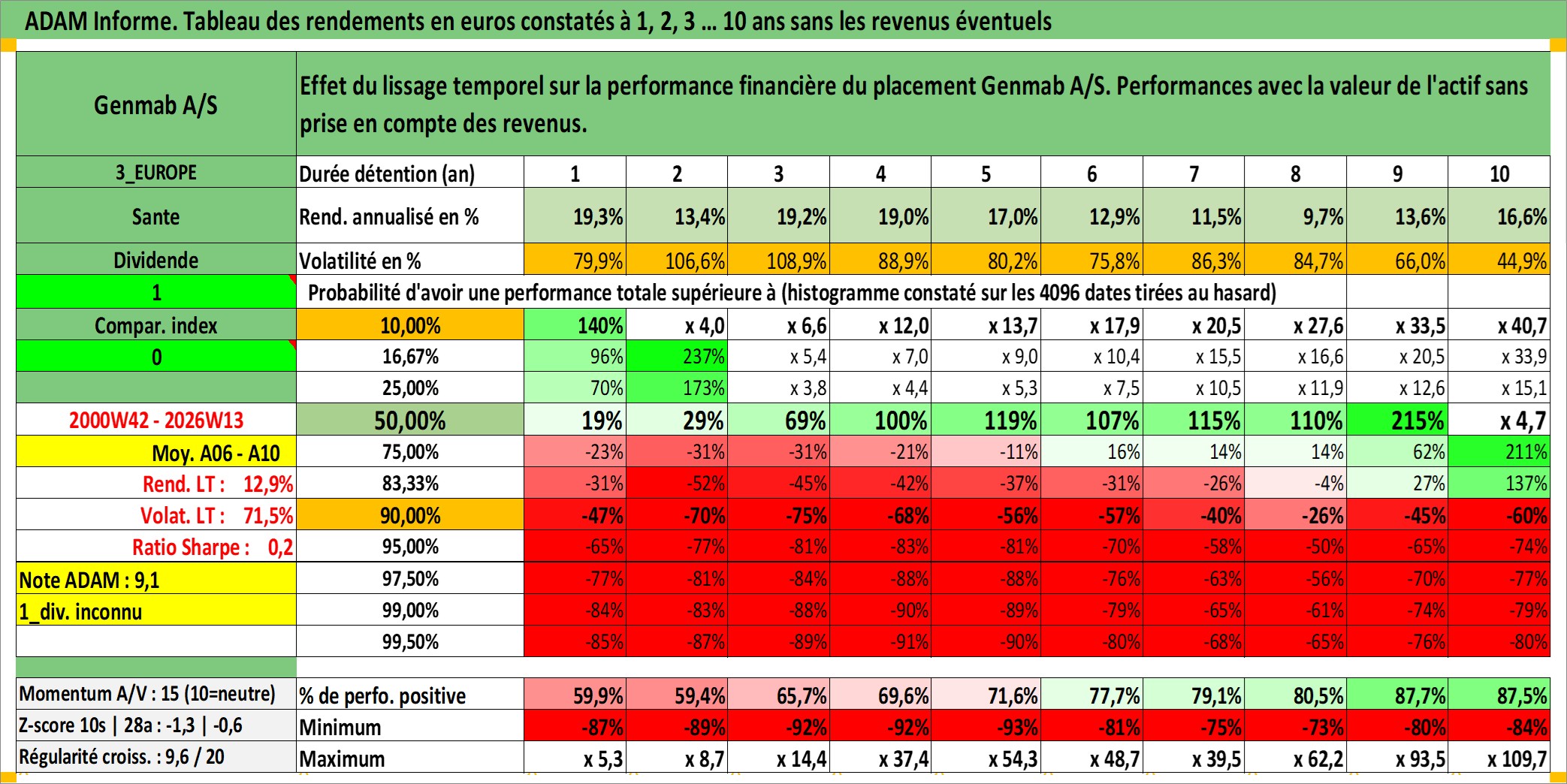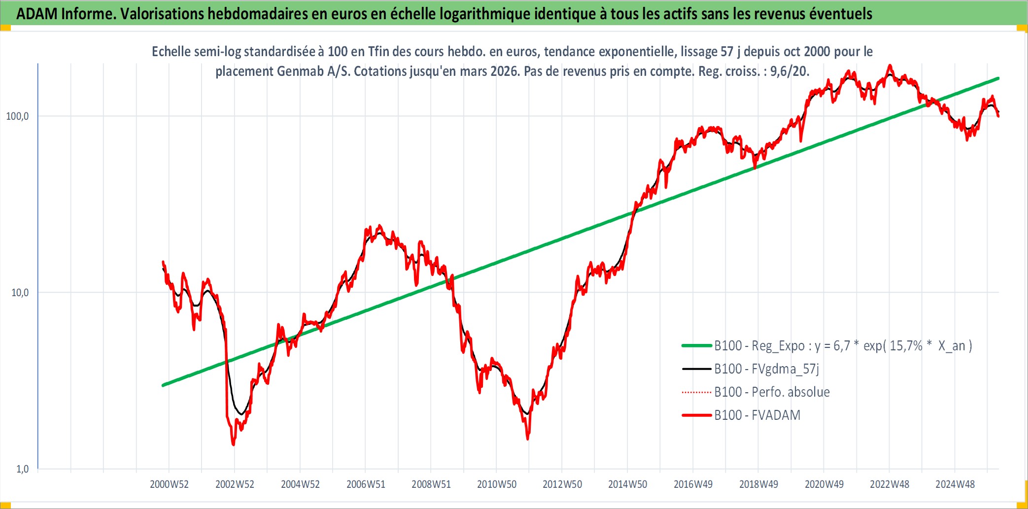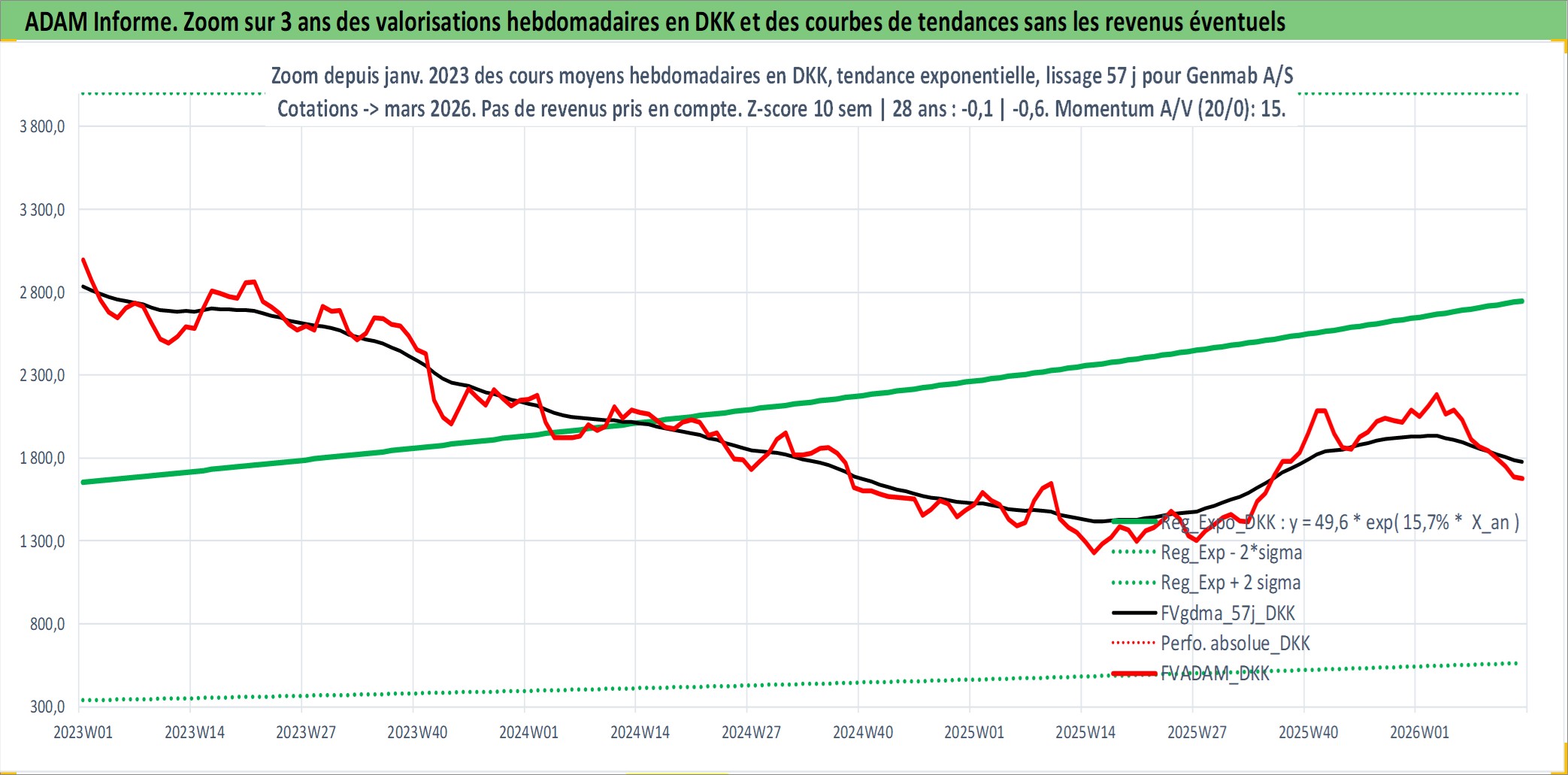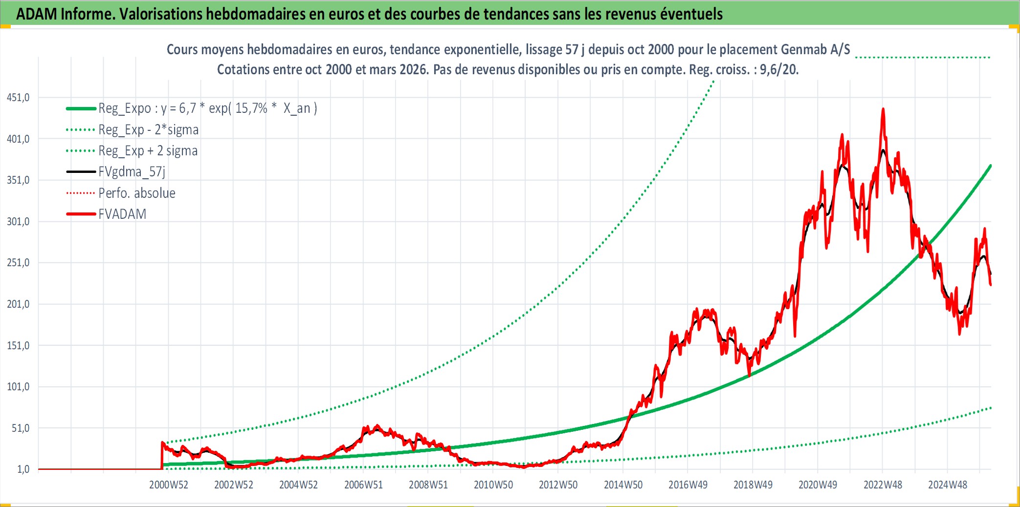 Site dédié aux investisseursPage dédiée sur site financeAnalyse des valorisations hebdomadaires de l'action Genmab A/S. Cet actif est cote en DKK. Les valorisations sont en contrevaleur EURO et couvrent les semaines 2000W42 a 2026W13. Les revenus de cet actif financier ne sont pas connus car non existants ou non disponibles sur le site Yahoo Finance. La note globale ESG de cet actif est estimee a 7.0 (apres rebasage entre 0 et 20).