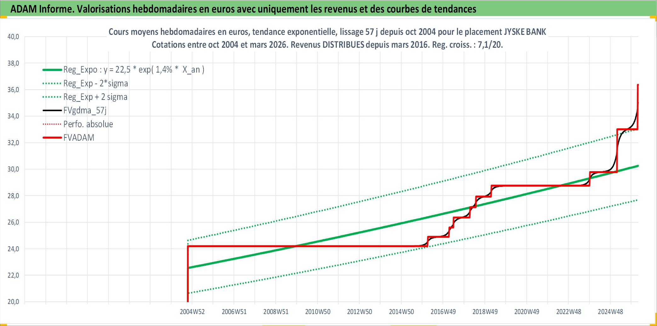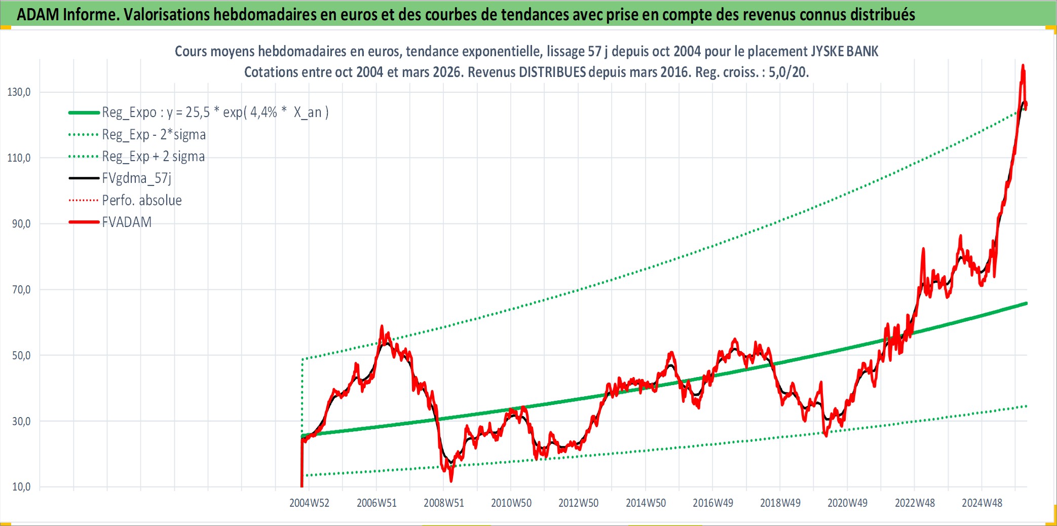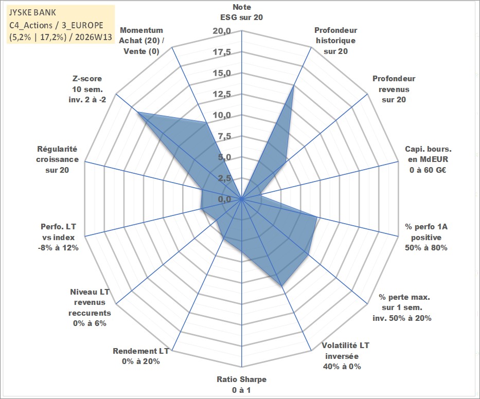 Site dédié aux investisseursPage dédiée sur site financeAnalyse des valorisations hebdomadaires de l'action JYSKE BANK. Cet actif est cote en DKK. Les valorisations sont en contrevaleur EURO et couvrent les semaines 2004W41 a 2026W13. Les revenus de cet actif financier sont pris en compte depuis la semaine 2016W11. La note ESG de cet actif n'est pas connue.