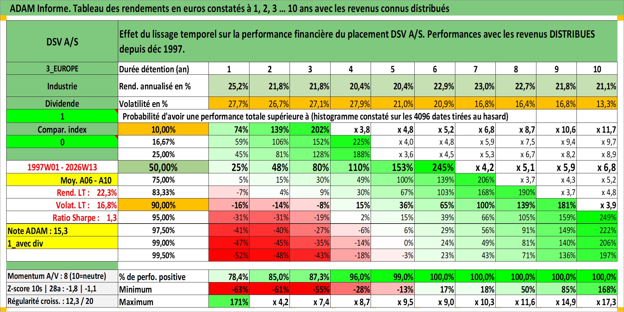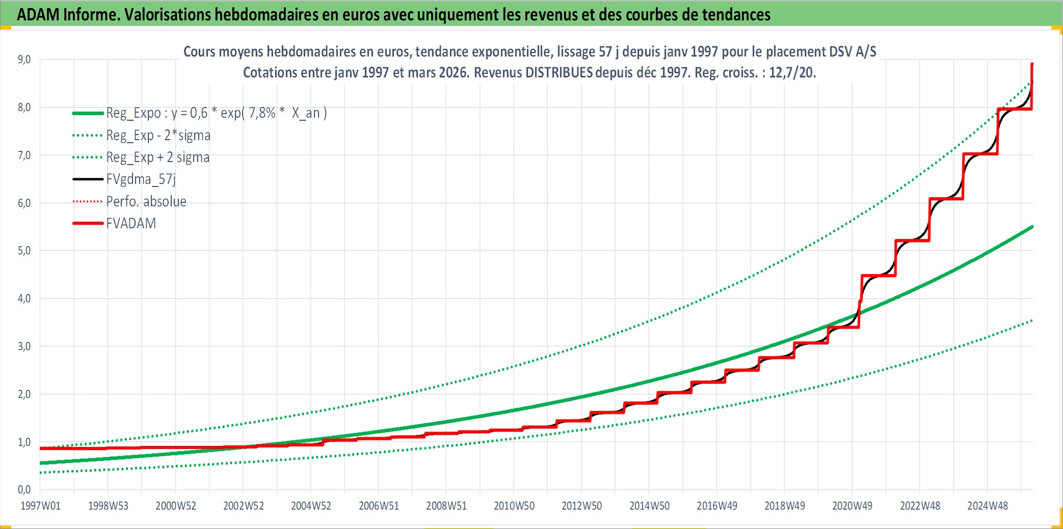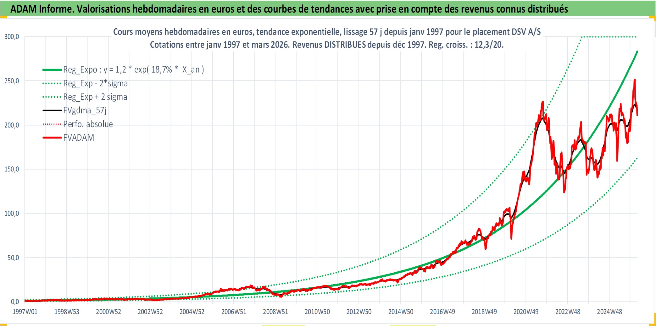 Site dédié aux investisseursPage dédiée sur site financeAnalyse des valorisations hebdomadaires de l'action DSV A/S. Cet actif est cote en DKK. Les valorisations sont en contrevaleur EURO et couvrent les semaines 1997W01 a 2026W13. Les revenus de cet actif financier sont pris en compte depuis la semaine 1997W51. La note globale ESG de cet actif est estimee a 14.0 (apres rebasage entre 0 et 20).
