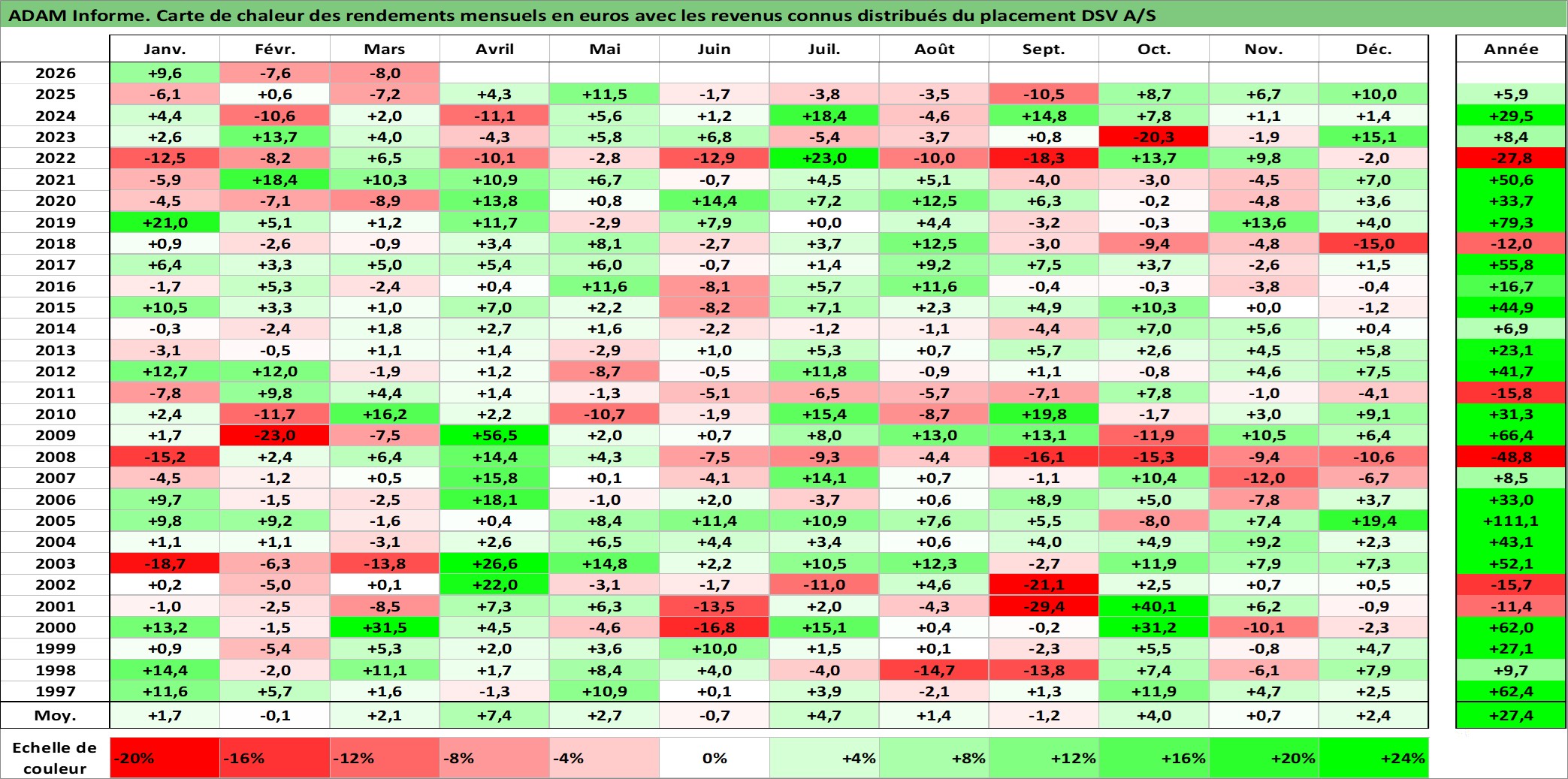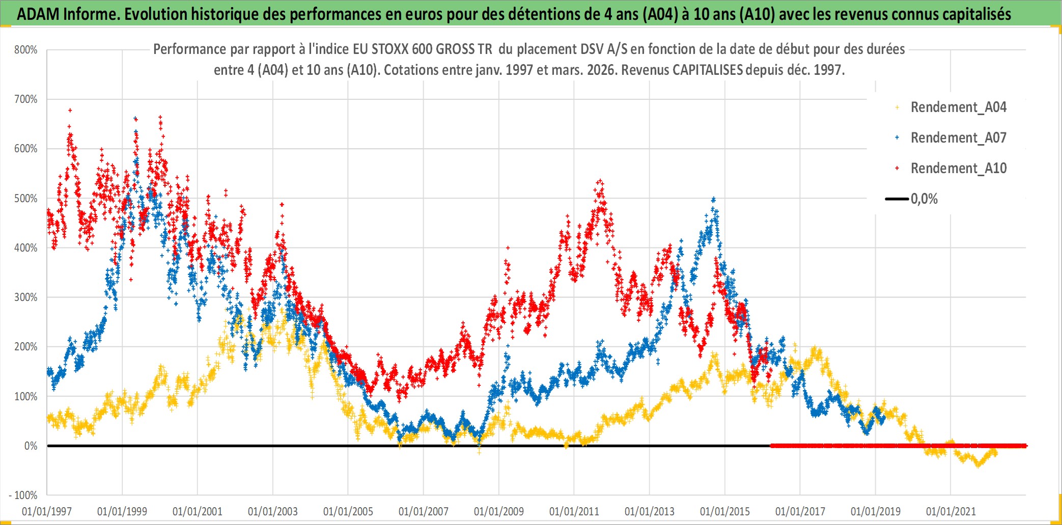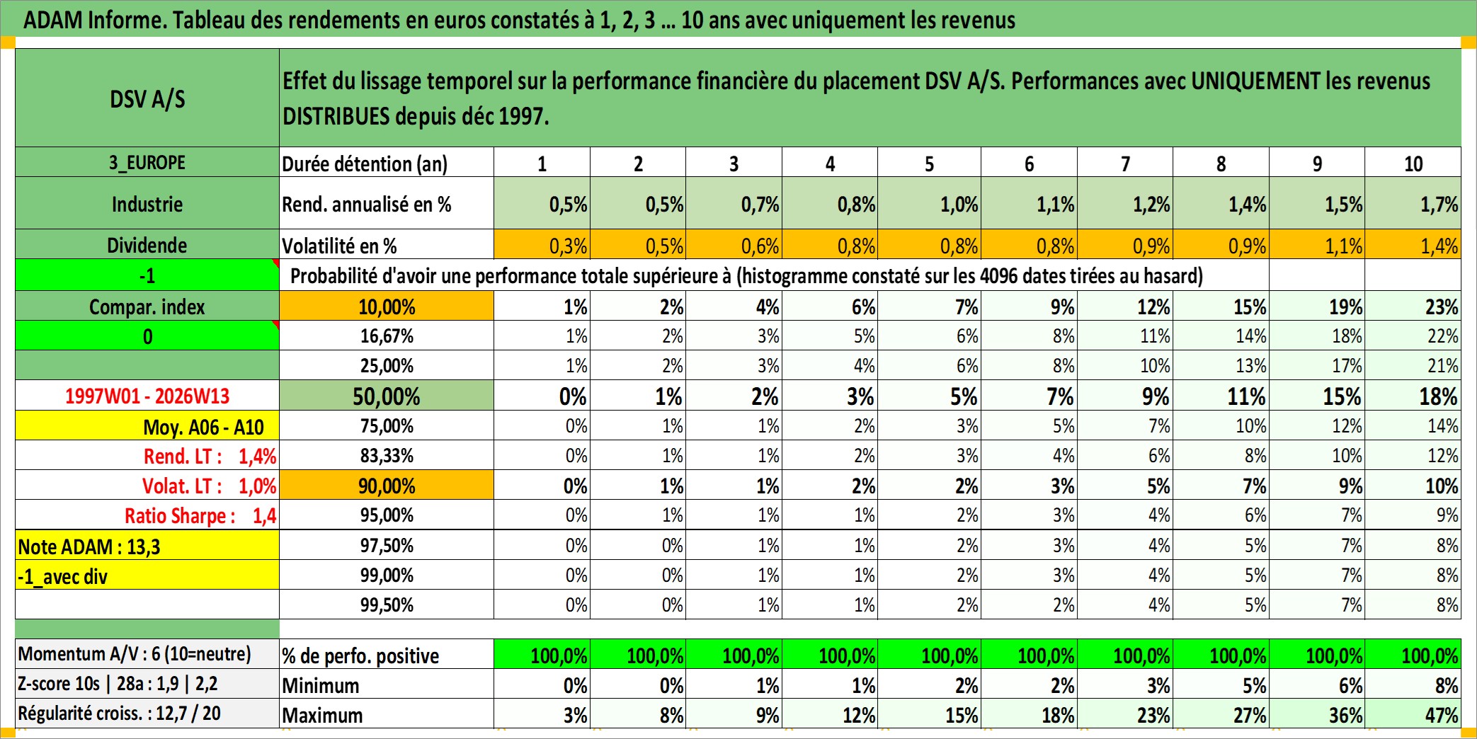 Site dédié aux investisseursPage dédiée sur site financeAnalyse des valorisations hebdomadaires de l'action DSV A/S. Cet actif est cote en DKK. Les valorisations sont en contrevaleur EURO et couvrent les semaines 1997W01 a 2026W13. Les revenus de cet actif financier sont pris en compte depuis la semaine 1997W51. La note globale ESG de cet actif est estimee a 14.0 (apres rebasage entre 0 et 20).