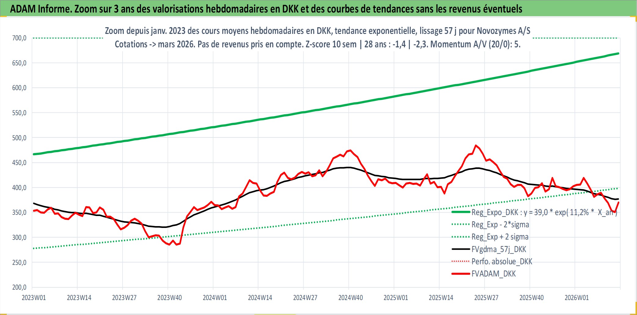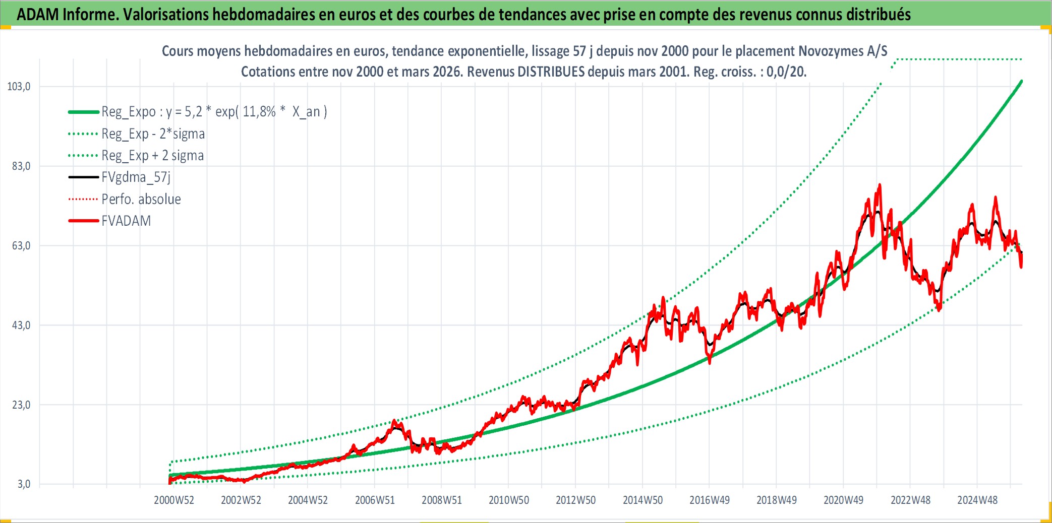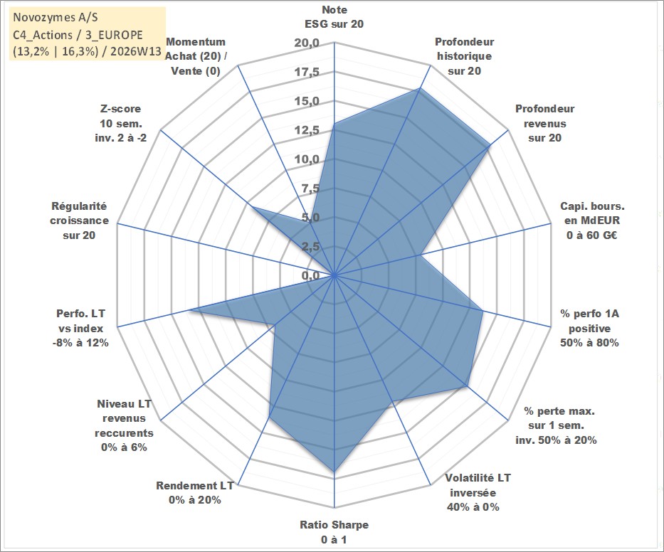 Site dédié aux investisseursPage dédiée sur site financeAnalyse des valorisations hebdomadaires de l'action Novozymes A/S. Cet actif est cote en DKK. Les valorisations sont en contrevaleur EURO et couvrent les semaines 2000W46 a 2026W13. Les revenus de cet actif financier sont pris en compte depuis la semaine 2001W12. La note globale ESG de cet actif est estimee a 13.0 (apres rebasage entre 0 et 20).
